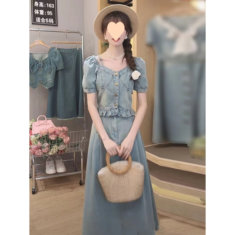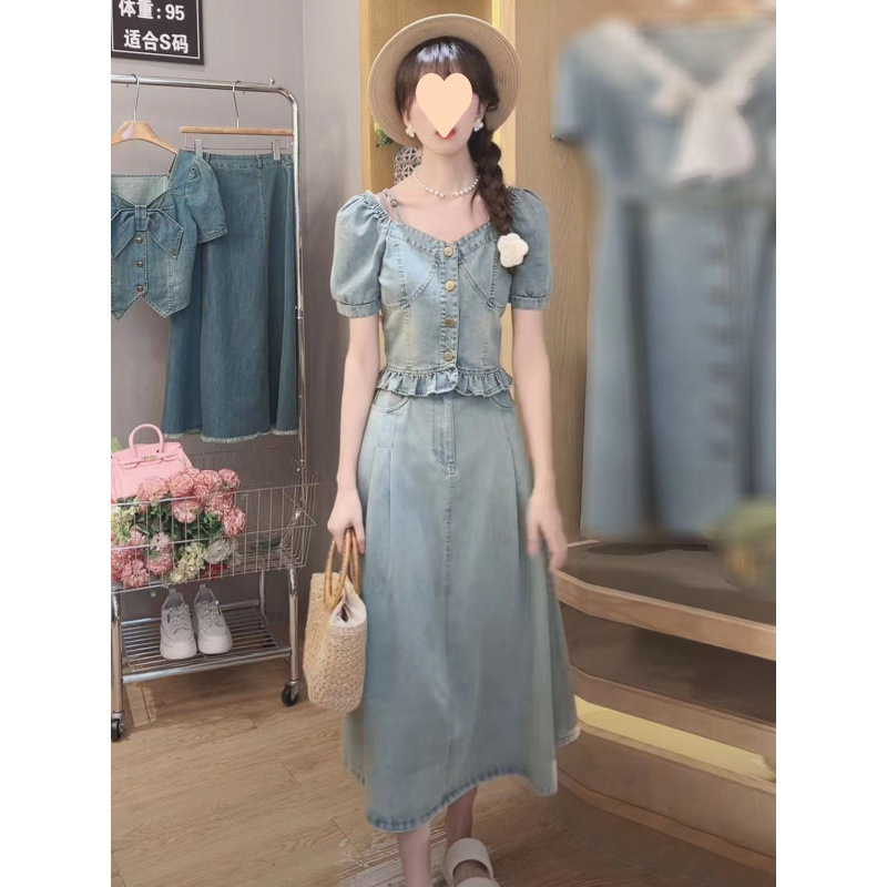 Летний комплект из джинсовой рубашки и юбки в ретро-стиле, модный женский топ с короткими рукавами и юбка, комплект из двух предметов