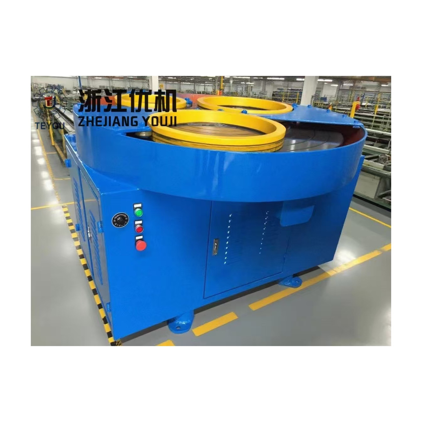 JWM型行星变频研磨机是国家技术专利产品公司拥有自主知识产权,专利号:ZL 2014 2 0433044.9。该机采用了行星差动原理,研磨盘旋转同时活动圈也转,既有公转又有自转,研磨工作效率高和研磨质量好,特别适合闸阀阀瓣平面密封面的研磨。JWM型研磨机由机架、主磨盘、活动圈、减速器、电机、变频器、启动开关等组成。该机工作效率与手工操作相比可提高工效十倍以上,在工件环形密封面毛坯表面粗糙度为6.3、材料为HRC30-50的前提下经研磨加工后可以达到表面粗糙度为0.4、密封面吻合度不低于80%的效果。操作灵活轻便,劳动强度低,生产工效高,效果好,随心所意,一个人可操作多台设备,是阀门制造业使用单位和维修阀门单位的理想研磨设备。