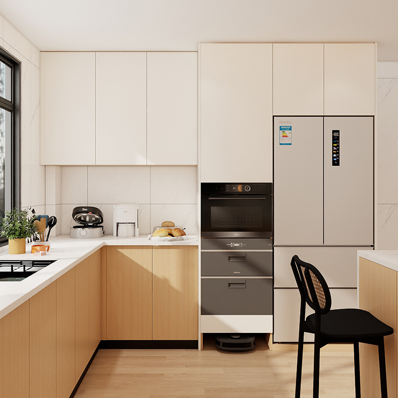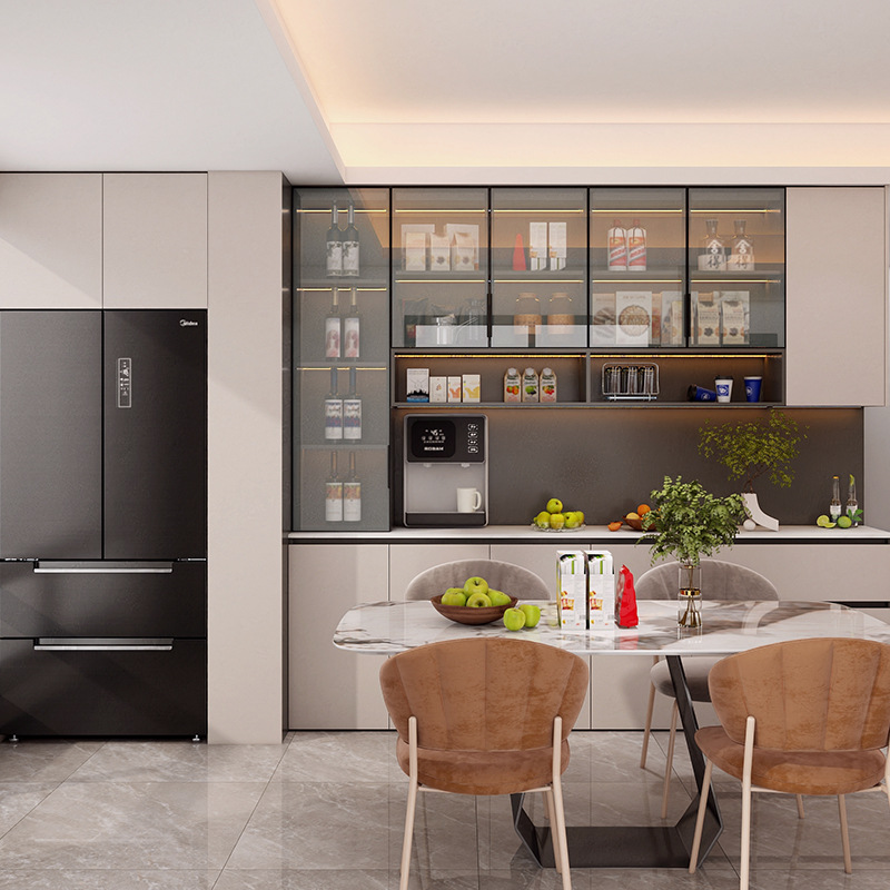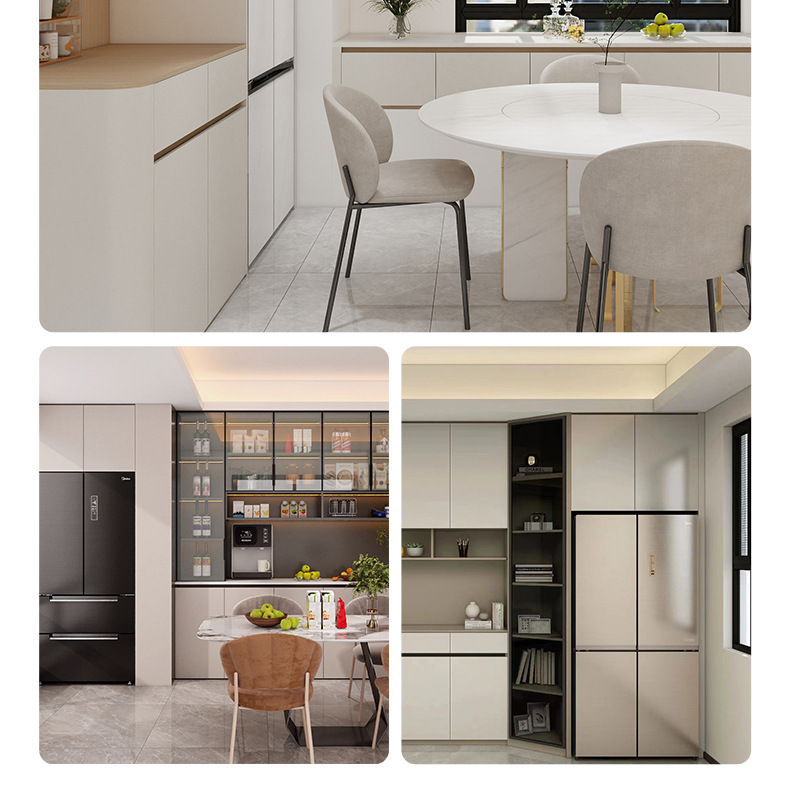 Встроенный шкаф для холодильника, шкаф для бытовой техники с нулевой вставкой, шкаф для холодильника, буфет со скошенной прямой боковой стенкой.