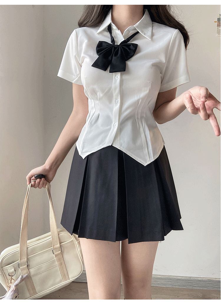 Белая рубашка с короткими рукавами, облегающая талию (без галстука-бабочки); Белая рубашка с длинными рукавами, облегающая талию (без галстука-бабочки); Белая рубашка с короткими рукавами и завязками на талии + черный галстук; Белая рубашка с длинными рукавами и черным галстуком.; Белая рубашка с короткими рукавами и завязками на талии + черный галстук + черная плиссированная юбка-бокс; Белая рубашка с длинными рукавами с талией + черный галстук + черная плиссированная юбка-бокс