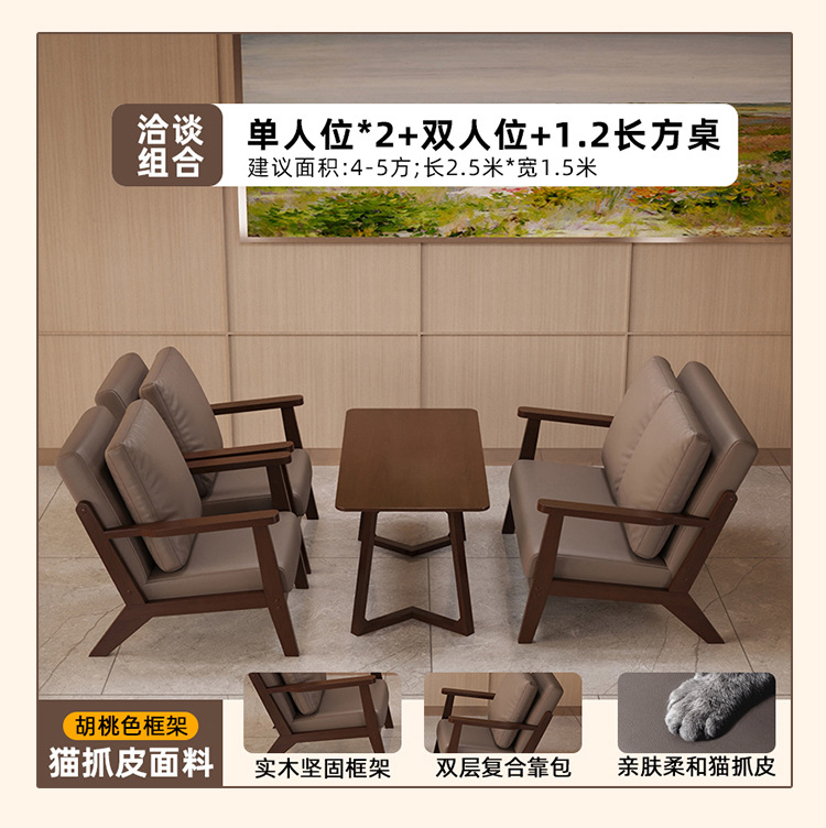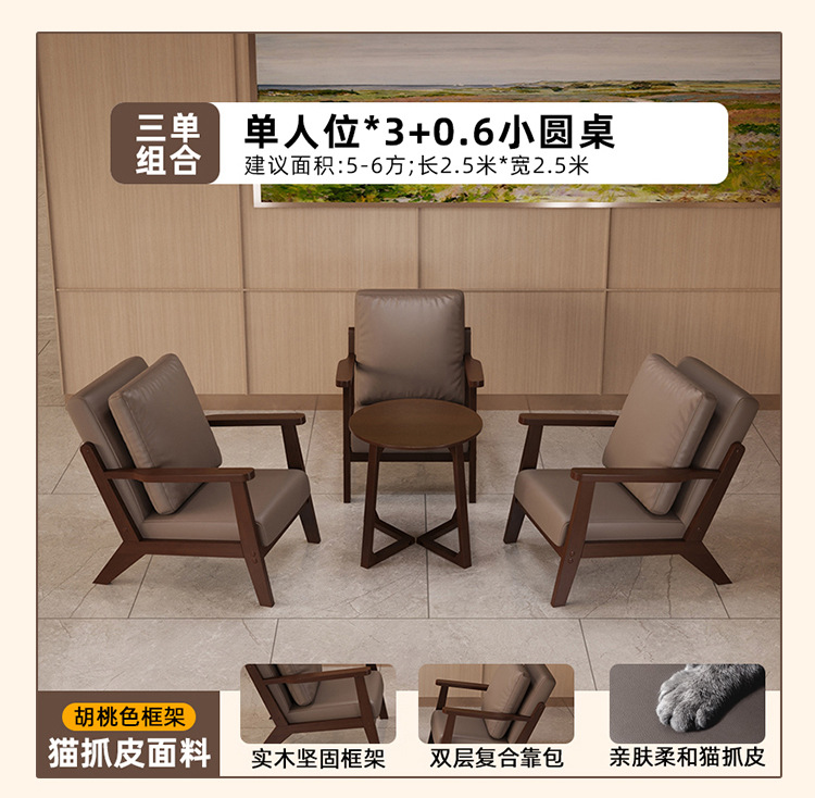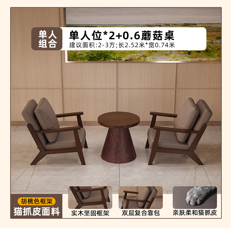 Одиночная комбинация [одноместное сиденье:*2+маленький круглый стол]; Одна комбинация [одноместное сиденье*2+маленький круглый столик-гриб]; Комбинация из трех человек [одноместное сиденье*3+небольшой круглый стол]; Двойная комбинация [двойное сиденье*2+ 1.2m длинный стол]; Комбинация лечения [одиночный*2+двойной+ 1.2m длинный стол]; Четыре одиночные комбинации [одно место*4+ 1.2m прямоугольных стола; Одноместное сиденье из кожи орехового цвета с кошачьими царапинами
