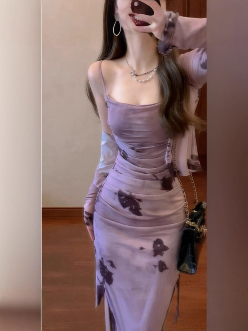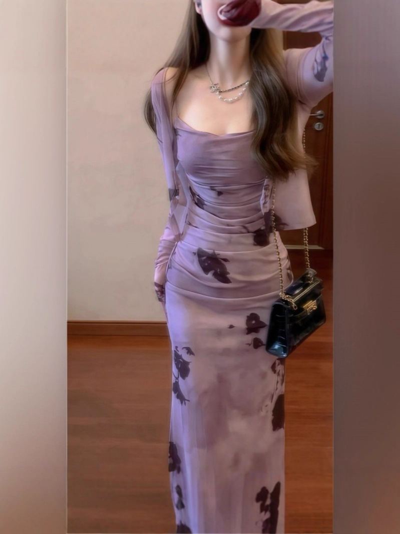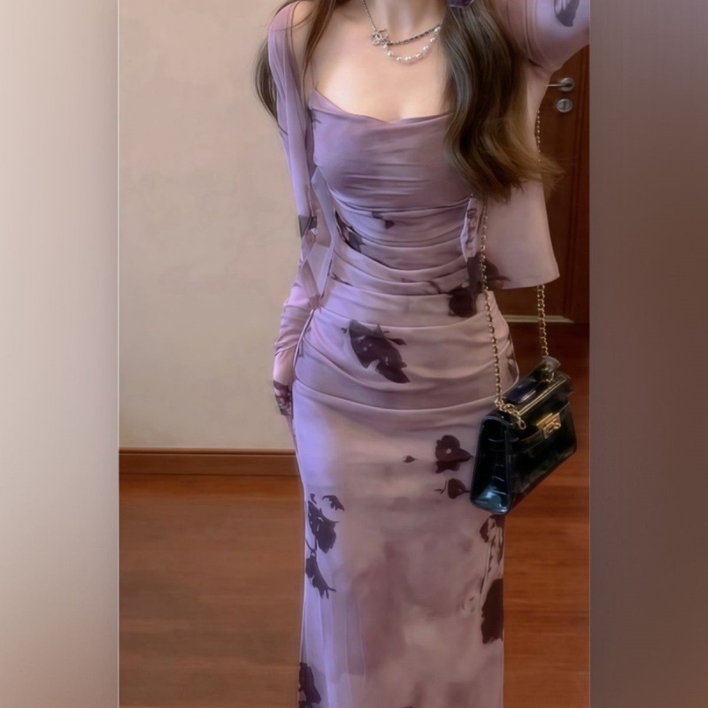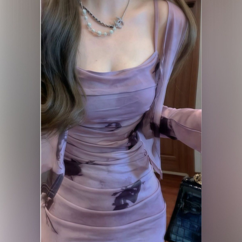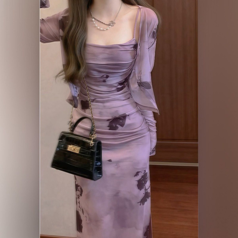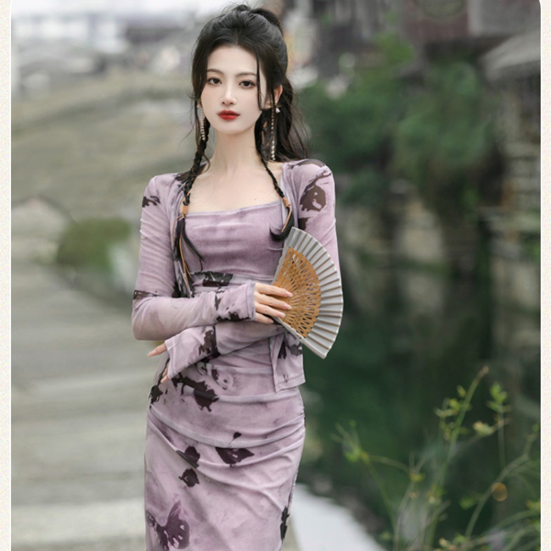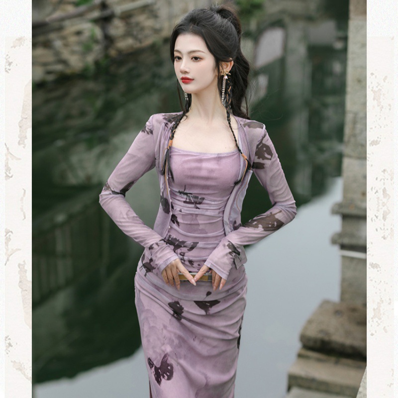 Новый китайский стиль, осенняя французская ретро-фиолетовая юбка на подтяжках с чернилами, комплект из двух предметов с облегающим платьем