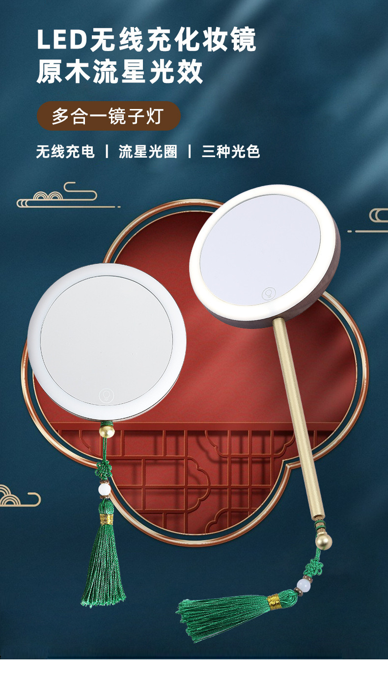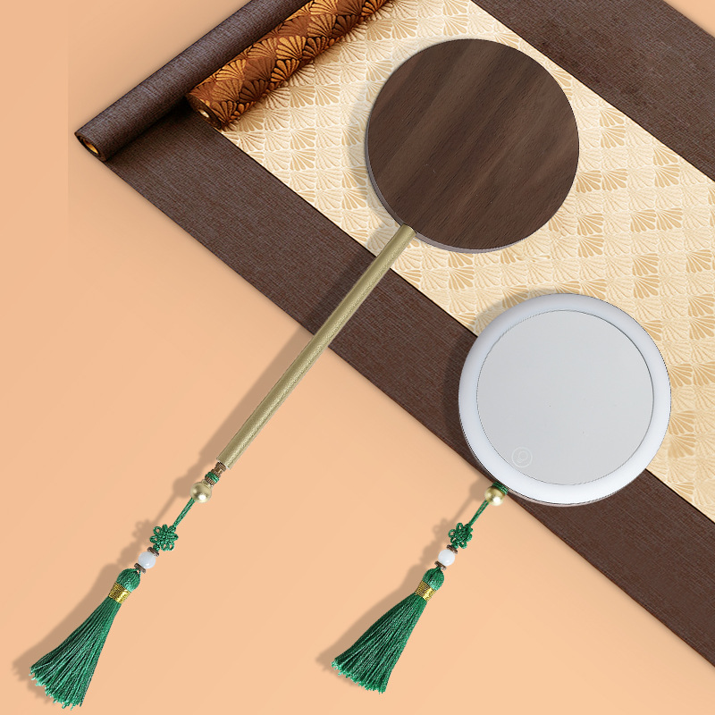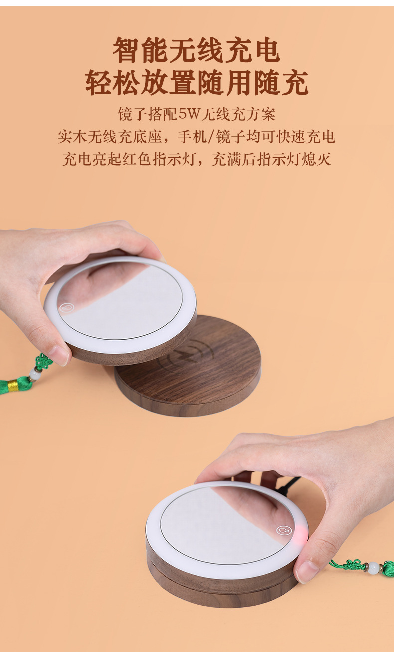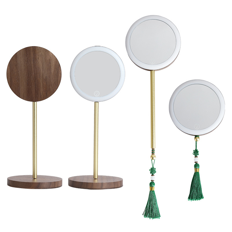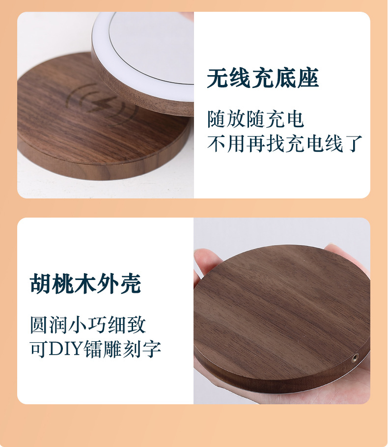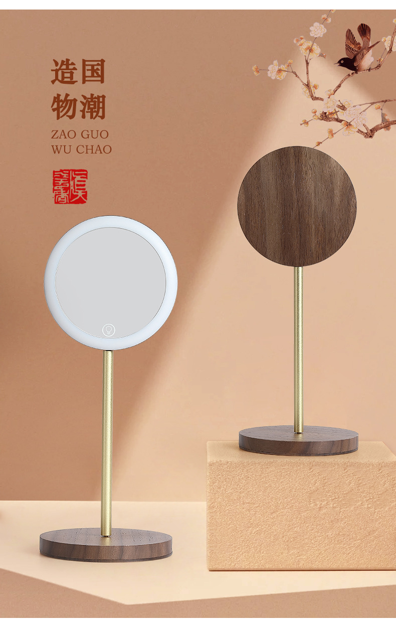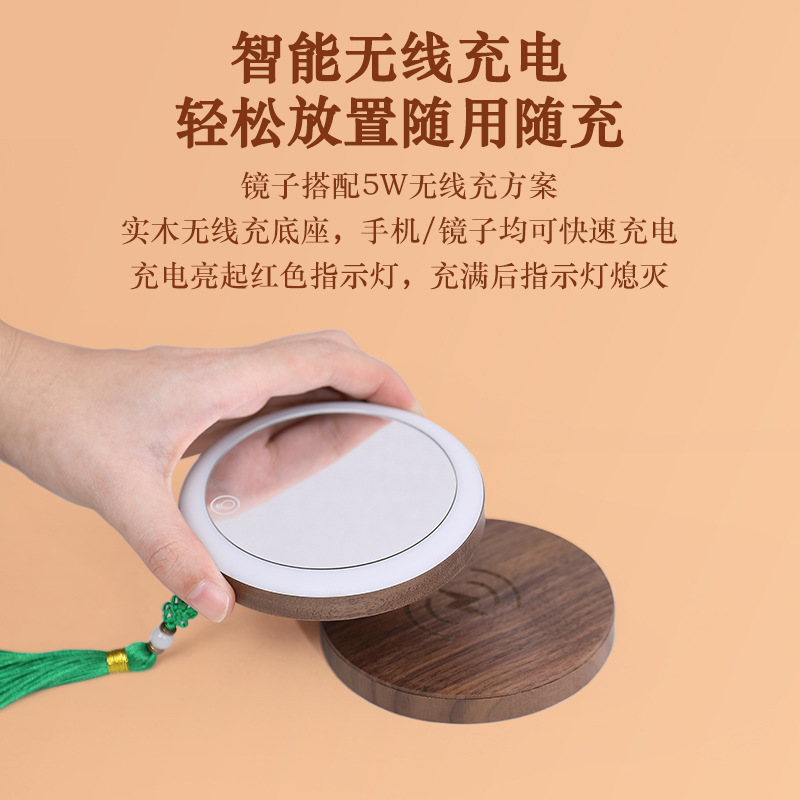 Зеркало для макияжа с беспроводной зарядкой LED, портативное круглое зеркало в китайском стиле из орехового дерева, зеркало для макияжа с подсветкой в подарок