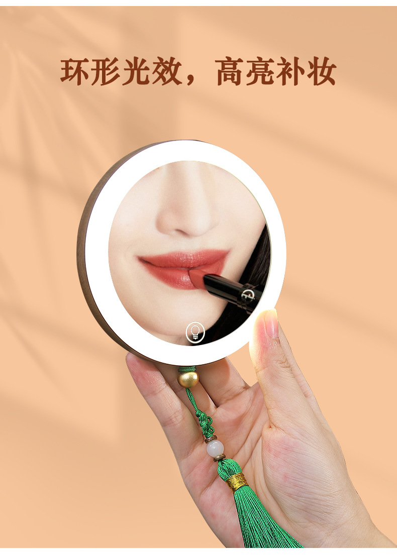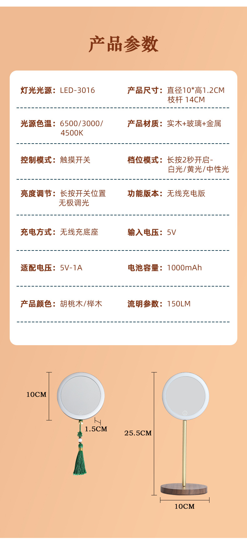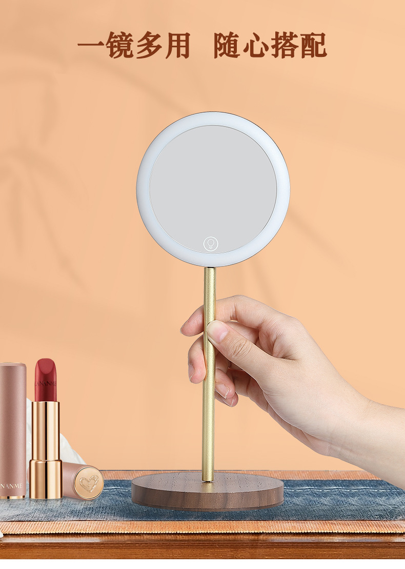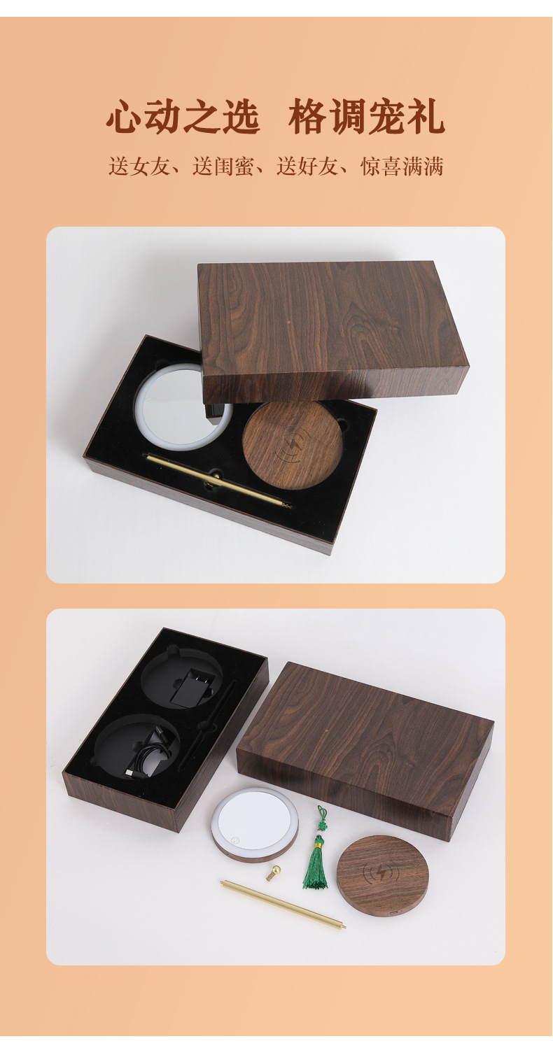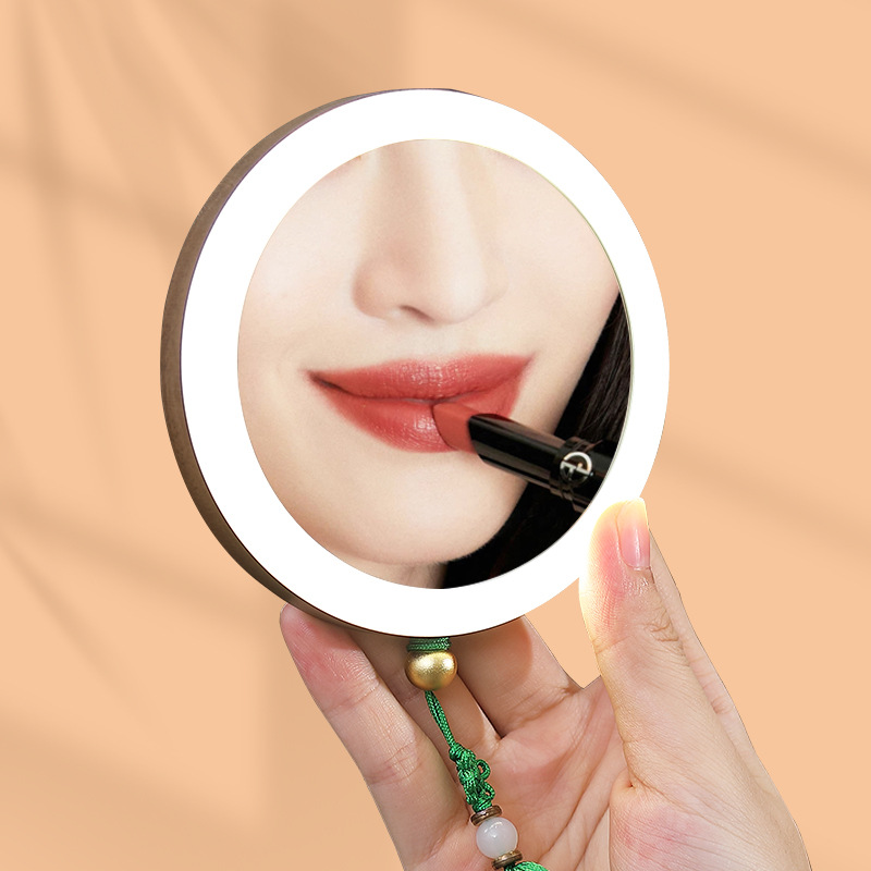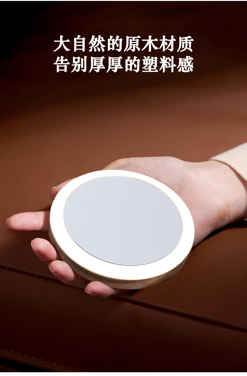 Зеркало для макияжа с беспроводной зарядкой LED, портативное круглое зеркало в китайском стиле из орехового дерева, зеркало для макияжа с подсветкой в подарок