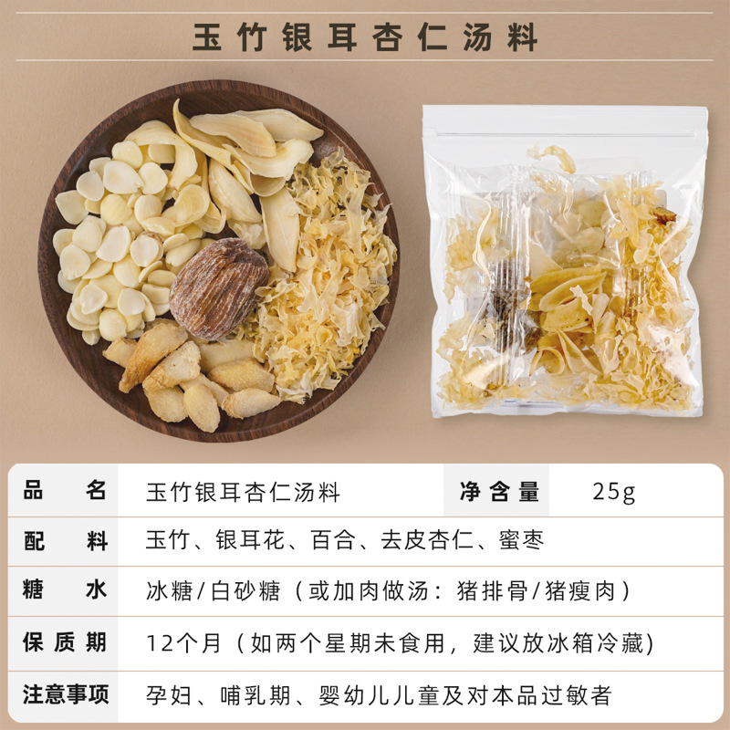 S01 Суп Сишэн (Суп из ямса, горгона и пории) 25г; С02 Суп из грецких орехов и ямсовых корней Yizhiren, 27 г; С03 Суп из полигонатума, тремеллы и миндаля, 25 г; Вопрос 04 Суп из астрагала, лонган и красной даты, 21 г; Вопрос 05 Суп с рейши, кордицепсом и астрагалом, 20 г; Вопрос 06 Смесь для супа с женьшенем, полигонатумом и малиной, 21 г; Вопрос 07 Суп «Пятипалый персик и пория» 26 г; Вопрос 08 Суп из гастродии, астрагала и лилии, 25 г; Вопрос 09 Суп из дендробиума и полигонатума, 24 г; Вопрос 10 Красная фасоль, арахис, пять красных супов, смесь, 33 г; Вопрос 11 Суп из сушеной капусты и южного и северного абрикоса, 25 г; Вопрос 12 Суп из миндаля и инжира Bawanghua, 26 г; Вопрос 13 Смесь для супа из грибов агарикуса бразильского, ямса и плодов горгонии, 21 г.; Вопрос 14 Суп из герициума, ямса и чечевицы, 26 г; Q15 Суп из тигрового молока, грибов, руки Будды и миндаля, 23 г; В16 Суп из морилов, гортензий и пории, 22 г; Вопрос 17 Суп из морских гребешков с кордицепсом китайским, 21 г; Вопрос 18 Суп из кодонопсиса, астрагала и полигонатума, 24 г; Вопрос 19 Суп из улиточного мяса, инжира и полигонатума, 25 г; С20 Суп из грибов, ямсовых корней и лонганов, 26 г; В21 Суп из семян цистанческой, кодонопсиса и гортензии 23 г; В22 Суп из рыбьей пасти, кордицепса и полигонатума, 21 г; В23 Суп из зимней дыни, семян коикса и полигонатума, 26 г; S24 Суп из бобов Адзуки, семян коикса и пории, 22 г; S25 Корень тростника, пория и суп из корня травы 23г; Смесь для супа из семян коикса, пории кокосовой и цедры мандарина S26, 27 г; S27 Суп из листьев лотоса и семян кассии, 25 г; Смесь для супа S28 с шелковицей, полигонатумом и персиковыми косточками, 23 г; S29 Суп из кодонопсиса, офипогона и бергамота, 25 г; S31 суп из черной фасоли, персиковых косточек и ямса, 26 г; S32 Суп из яблока, астрагала и красной даты, 26 г; S33 Суп из дудника, башкира и пуэрарии 21г; S34 Суп из ландыша, пории и гриба, 26 г; S35 Суп из липового листа, мандариновой цедры и рукавичника Будды, 21 г; S36 Плавающий пшеничный солодовый суп с солодом 24 г