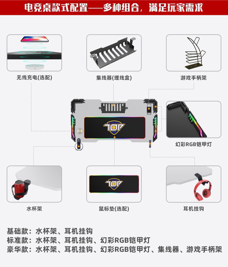 | 1.0米 | 红、黑 | 贴纸、水杯架、耳机架、幻彩RGB铠甲灯、集线器、无线充电 | 100*60*75 | 105.5*66*13 | 20.0KG |