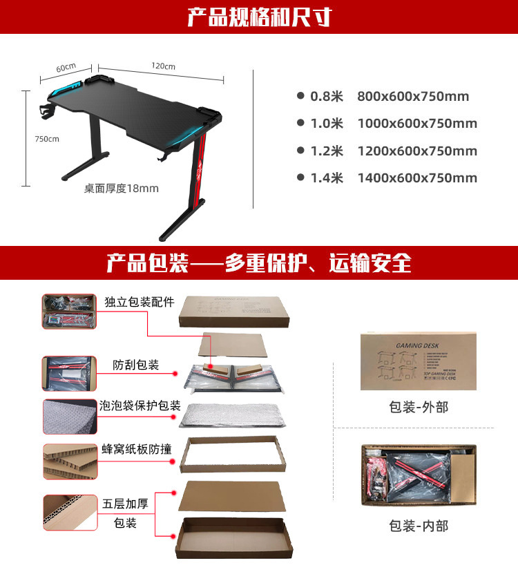 | 0.8米 | 红、黑 | 贴纸、水杯架、耳机架、幻彩RGB铠甲灯、集线器、无线充电 | 80*60*75 | 85.5*66*13 | 18.0KG |