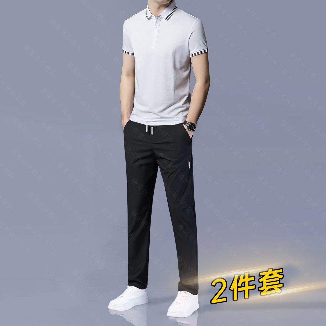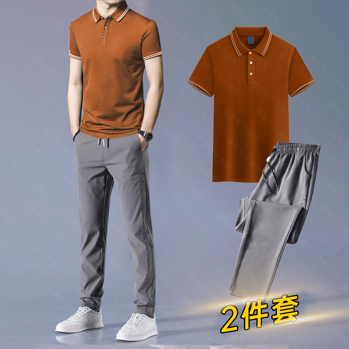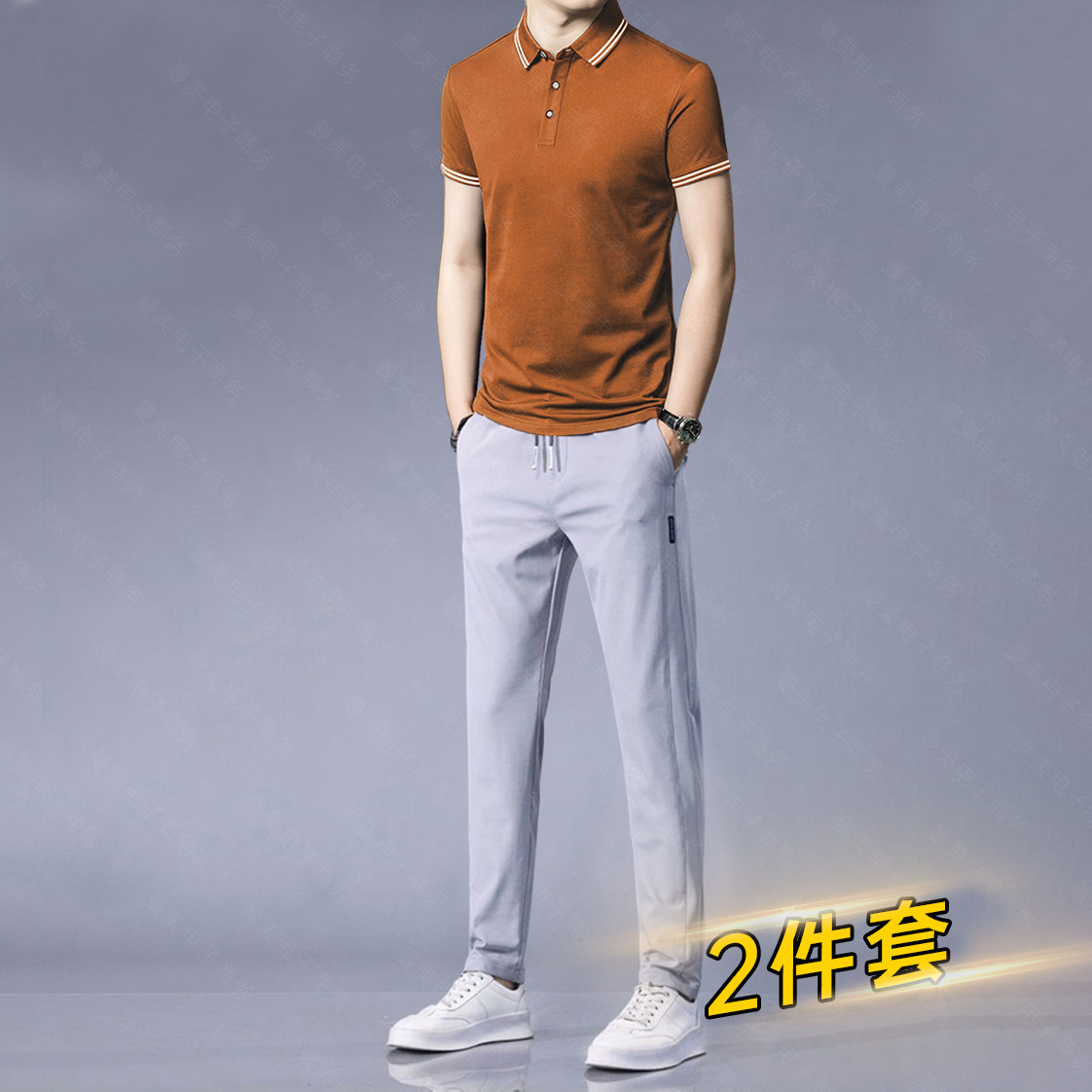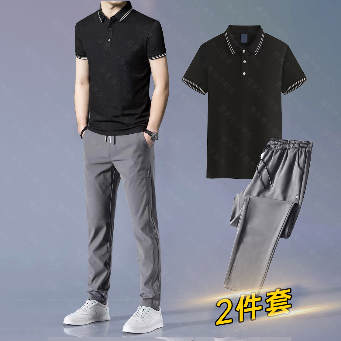 Летний мужской костюм из ледяного шелка с короткими рукавами для пап среднего и пожилого возраста, рубашка-поло с лацканами, повседневные эластичные брюки, две части