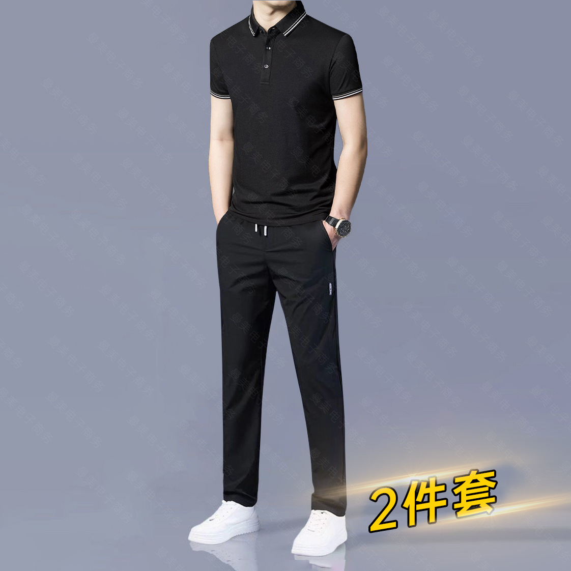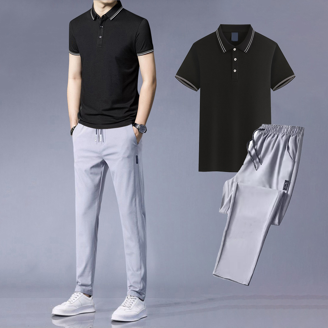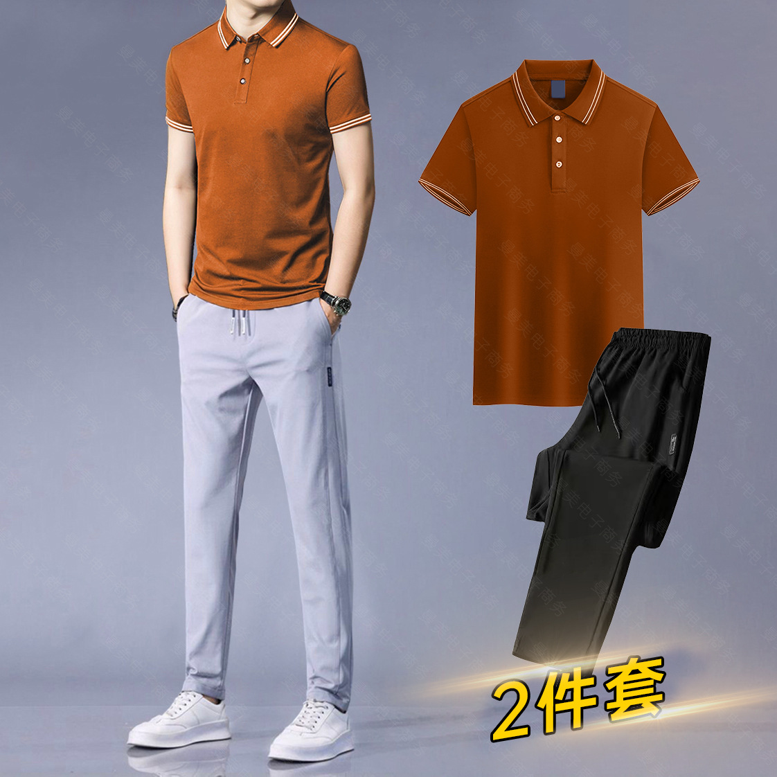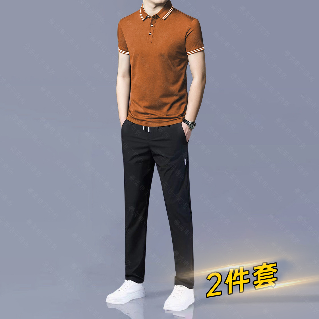 Летний мужской костюм из ледяного шелка с короткими рукавами для пап среднего и пожилого возраста, рубашка-поло с лацканами, повседневные эластичные брюки, две части