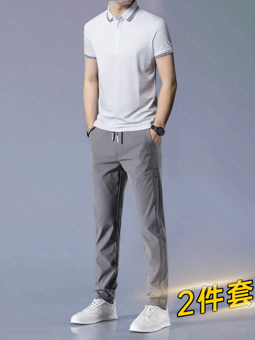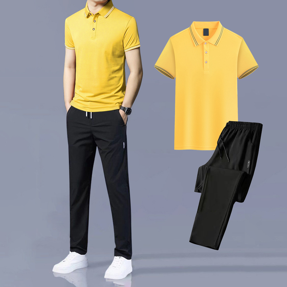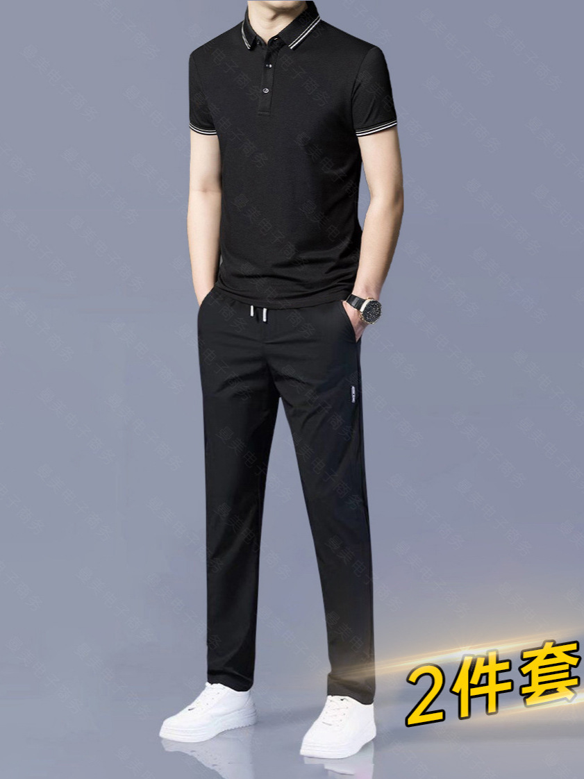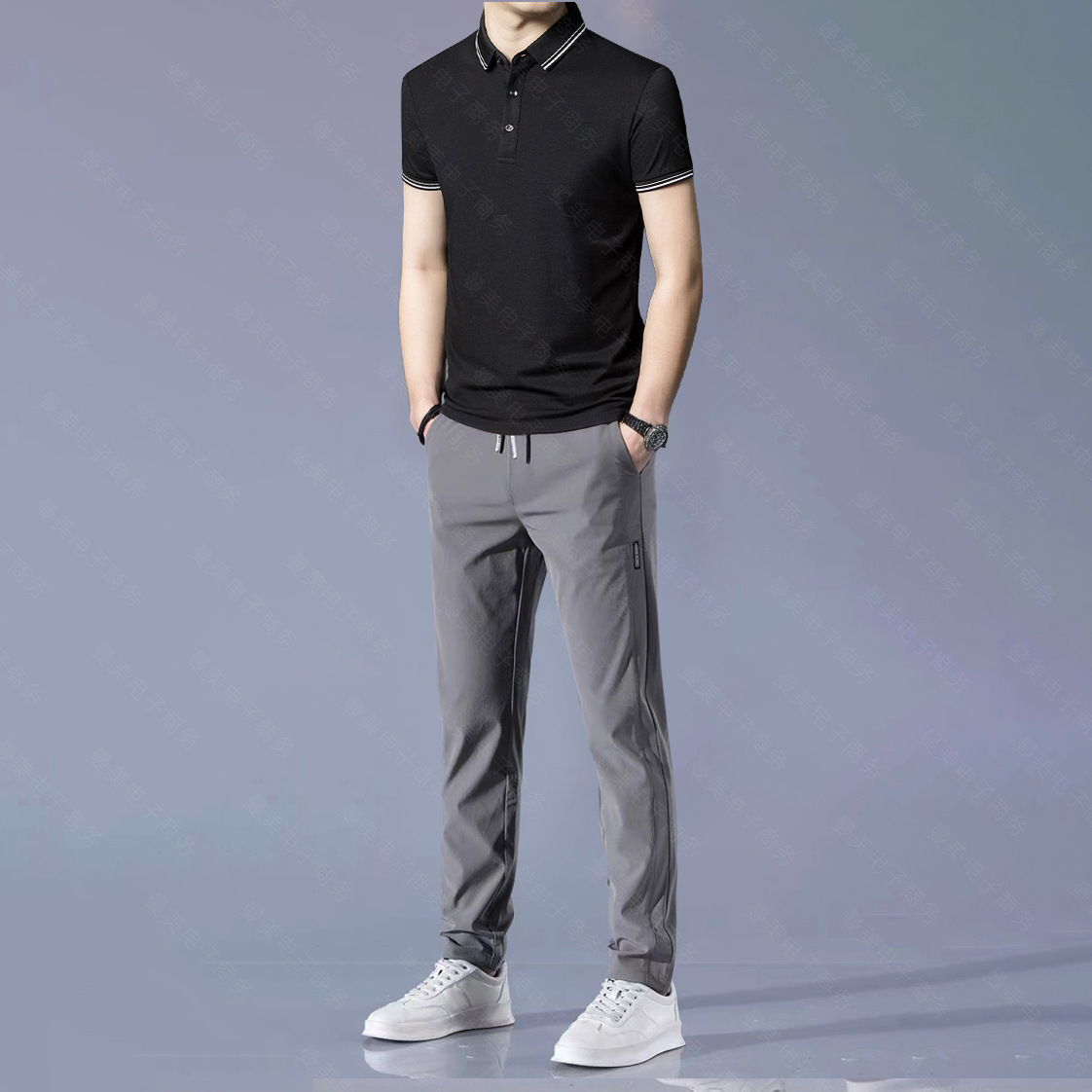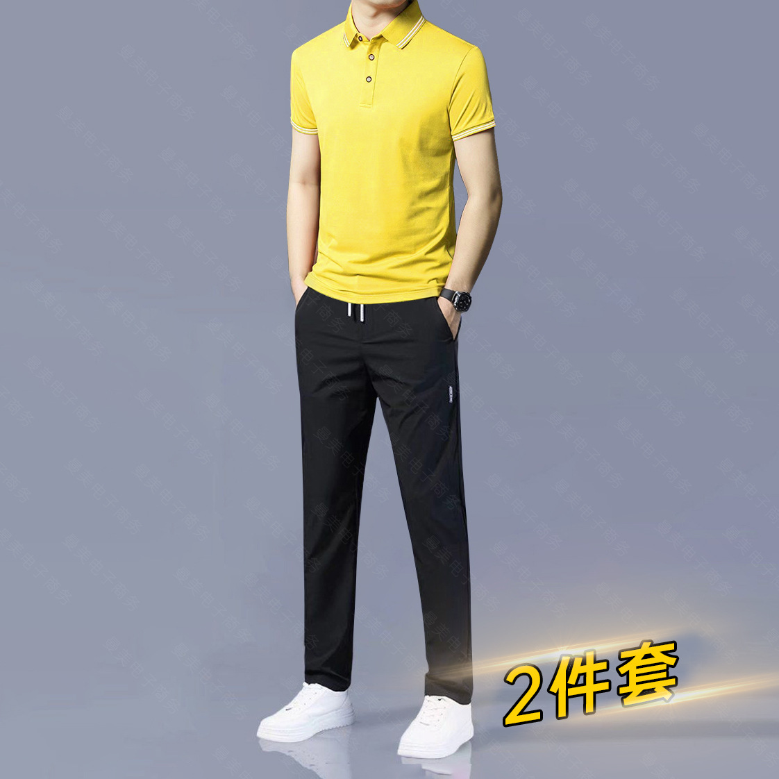Летний мужской костюм из ледяного шелка с короткими рукавами для пап среднего и пожилого возраста, рубашка-поло с лацканами, повседневные эластичные брюки, две части