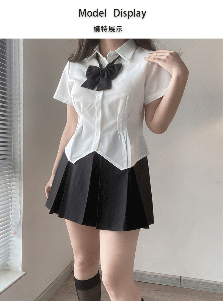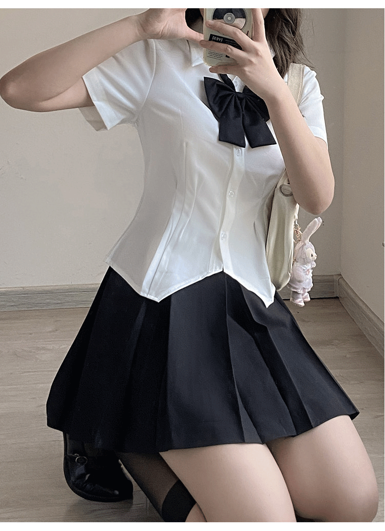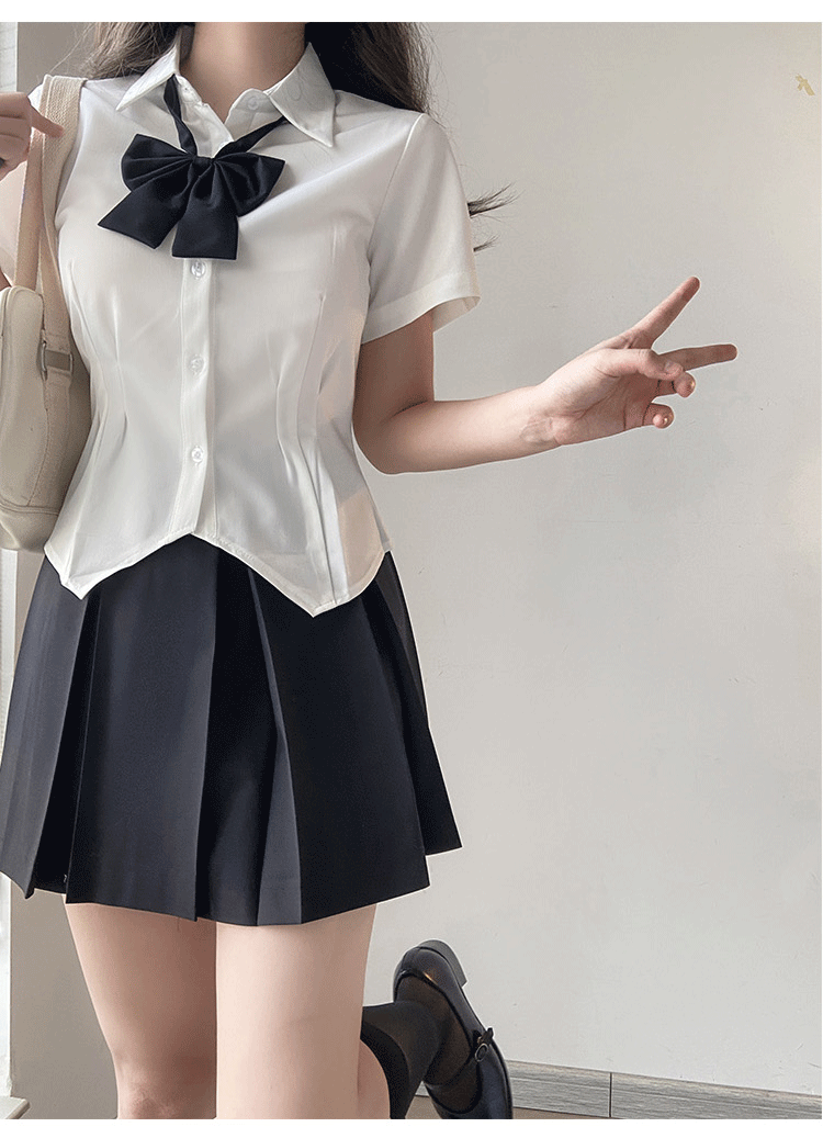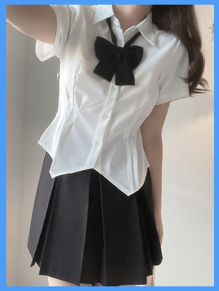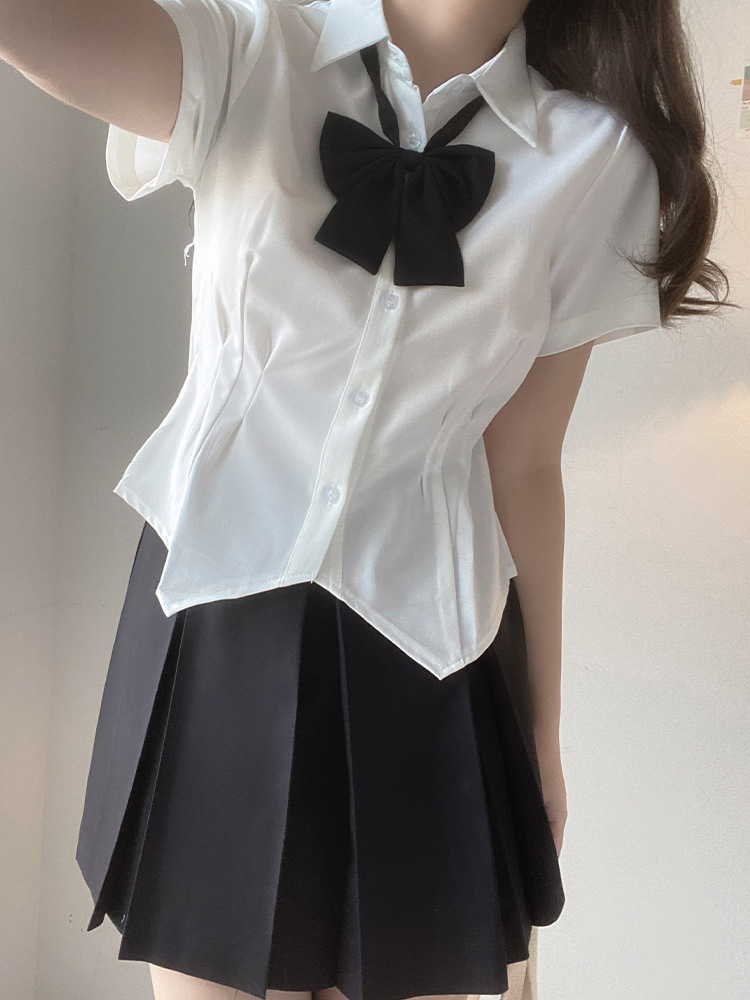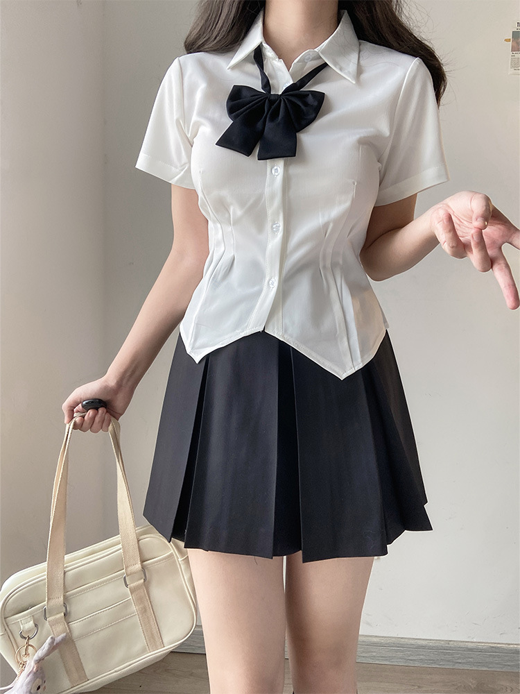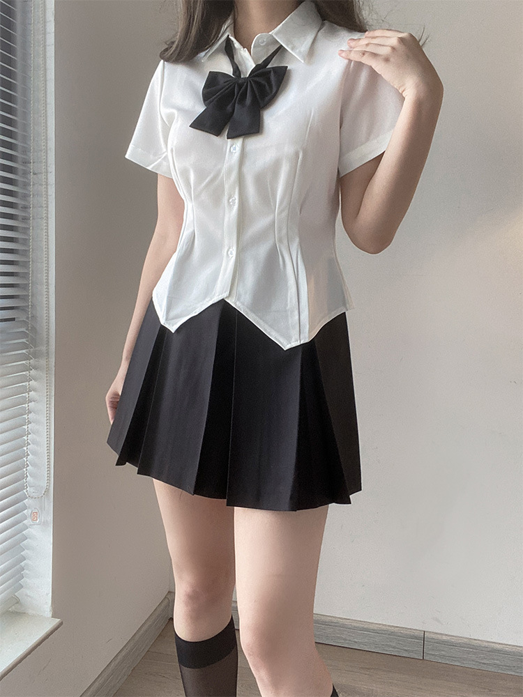 Белая рубашка с короткими рукавами, облегающая талию (без галстука-бабочки); Белая рубашка с длинными рукавами, облегающая талию (без галстука-бабочки); Белая рубашка с короткими рукавами и завязками на талии + черный галстук; Белая рубашка с длинными рукавами и черным галстуком.; Белая рубашка с короткими рукавами и завязками на талии + черный галстук + черная плиссированная юбка-бокс; Белая рубашка с длинными рукавами с талией + черный галстук + черная плиссированная юбка-бокс