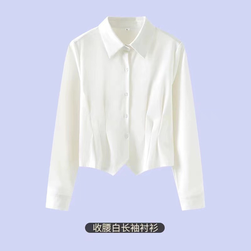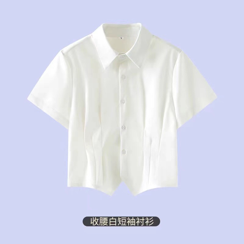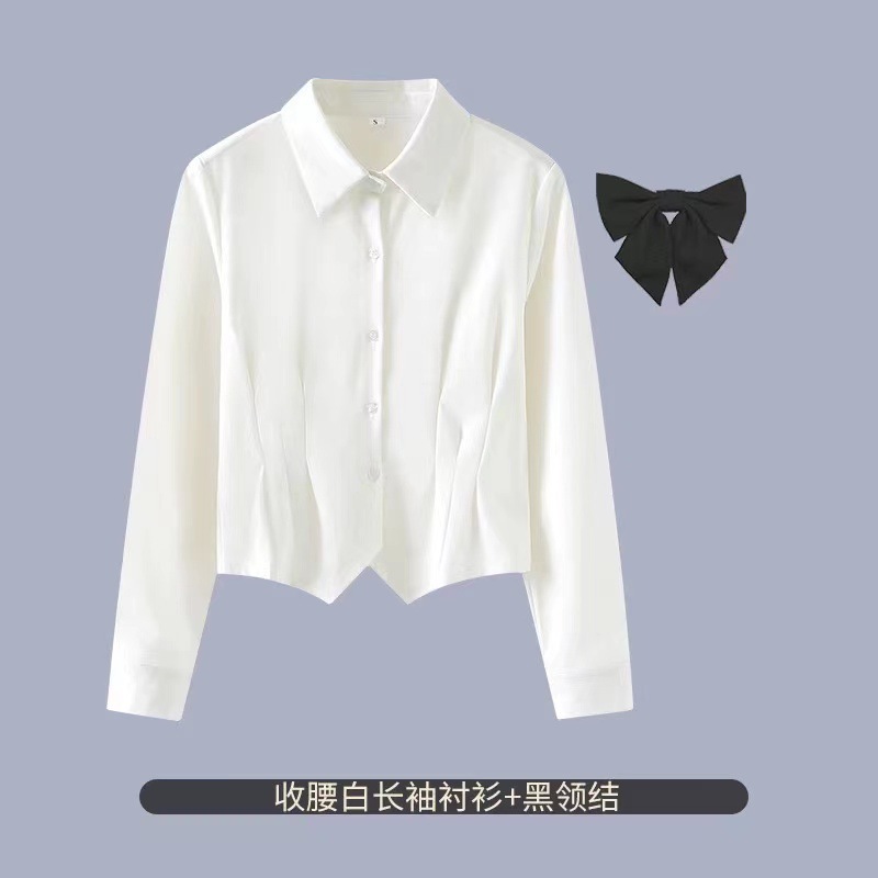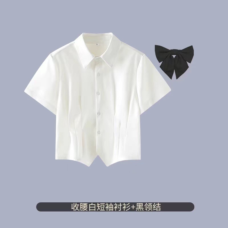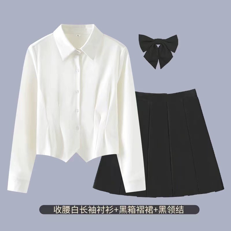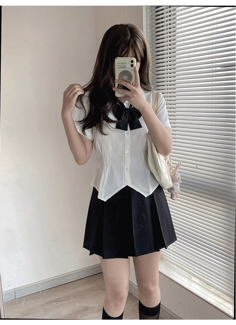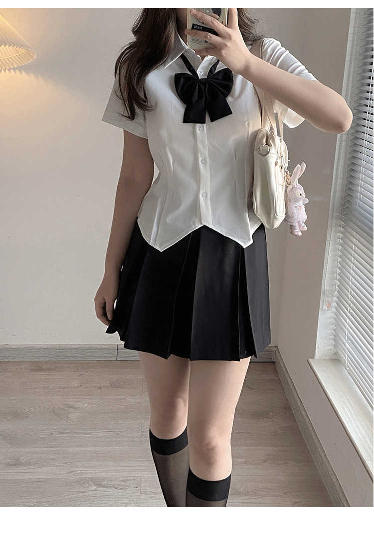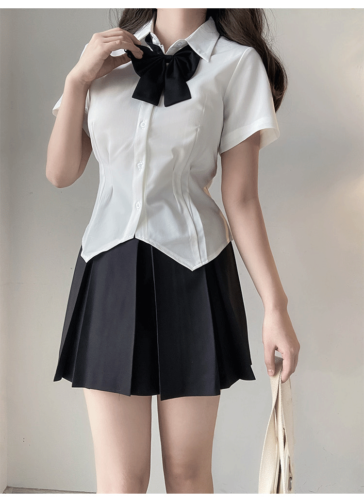 Белая рубашка с короткими рукавами, облегающая талию (без галстука-бабочки); Белая рубашка с длинными рукавами, облегающая талию (без галстука-бабочки); Белая рубашка с короткими рукавами и завязками на талии + черный галстук; Белая рубашка с длинными рукавами и черным галстуком.; Белая рубашка с короткими рукавами и завязками на талии + черный галстук + черная плиссированная юбка-бокс; Белая рубашка с длинными рукавами с талией + черный галстук + черная плиссированная юбка-бокс