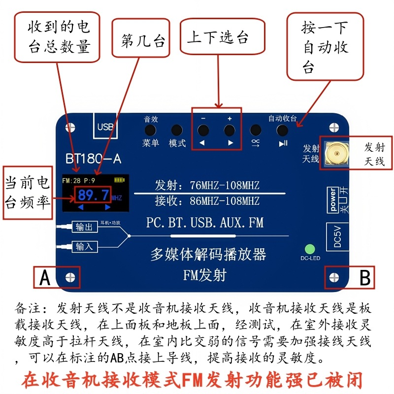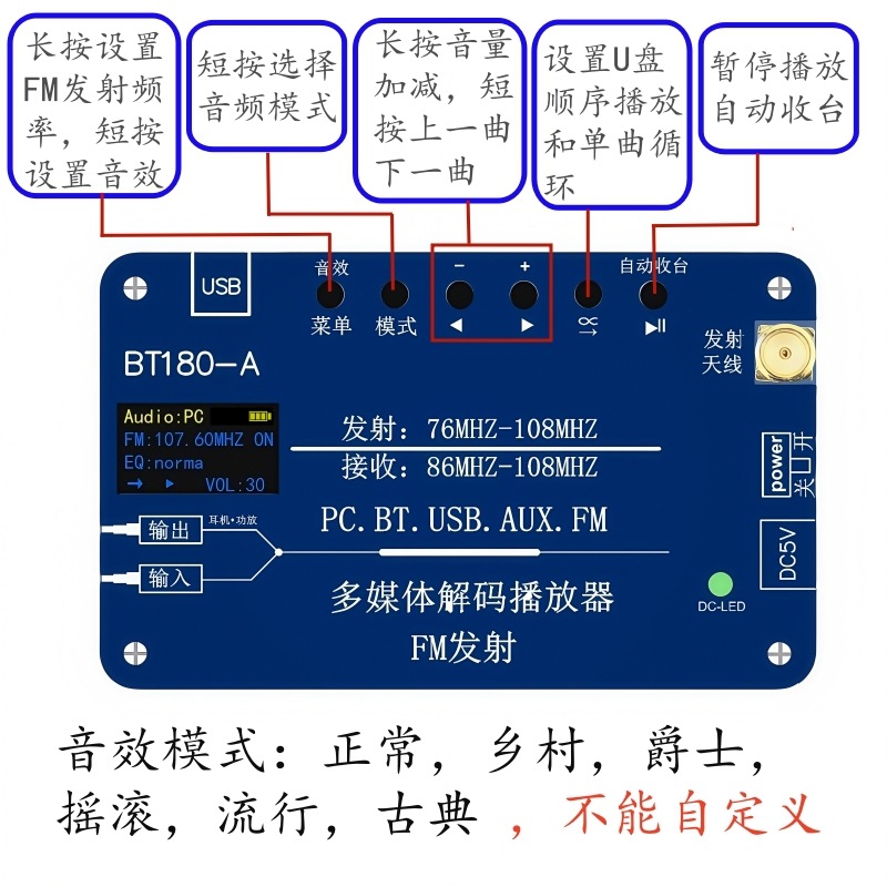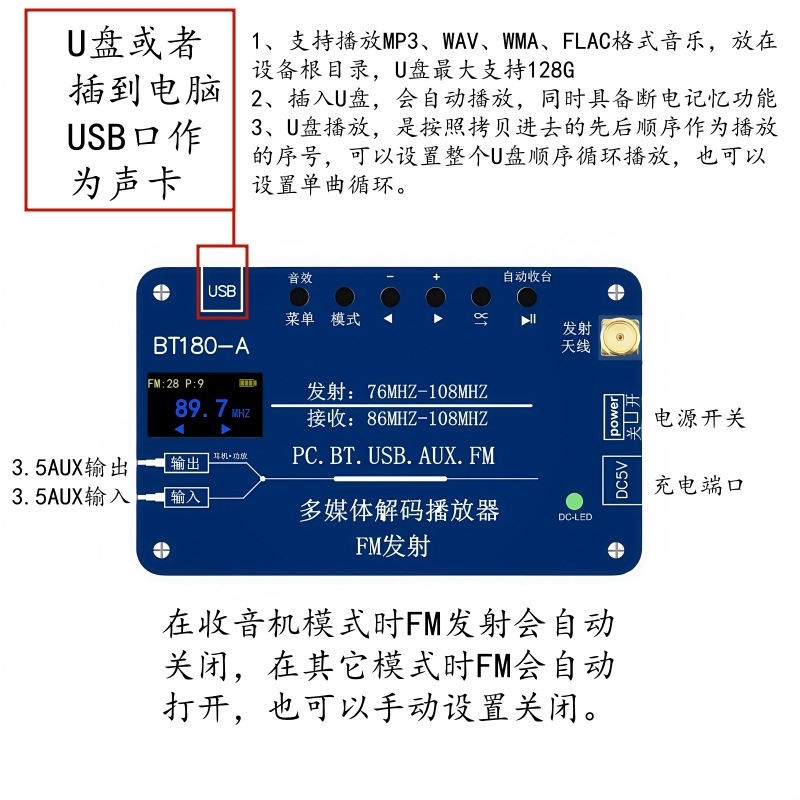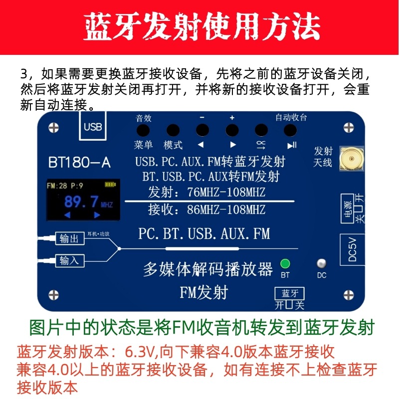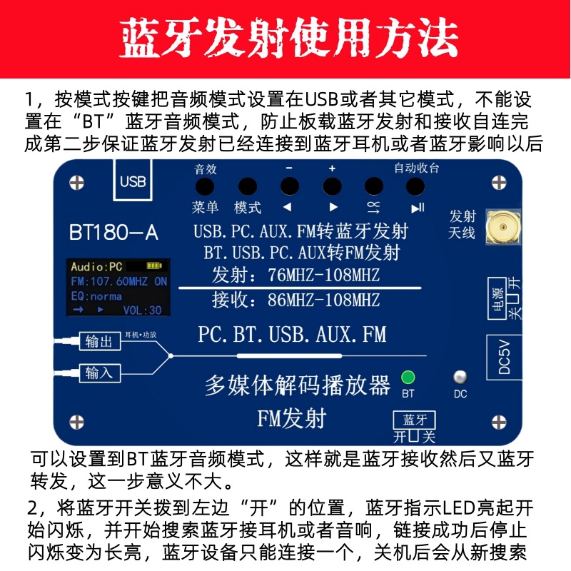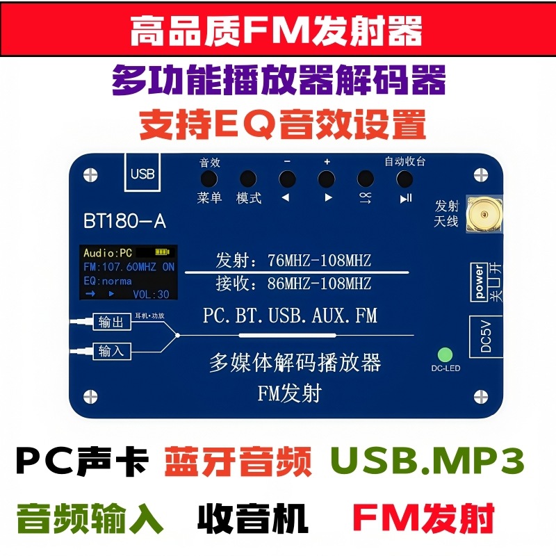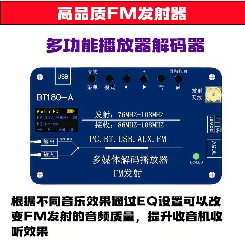 BT180-A是一款多功能音频解码器,集于音频解码FM调频信号发射功能,同时兼容FM收音机 功能。蓝牙音频,USB解码播放,AUX输入,PC声卡,FM发射,FM收音机,六合一功能。芯片选用 的是SOC,集成了一个32位的MCU,以及一个专门针对音频解码的aDSP,采用硬解码的方式, FM发射功能: 它可以将手机蓝牙音频,USB,AUX,PC音频信号通过FM发射出去,然后用收音机 收听。 解码播放功能:它可以将手机蓝牙音频,USB,AUX,PC音频信号通过3.5音频输出端口接 入到功放。 U盘解码格式:1,支持播放MP3、WAV、WMA、FLAC格式,支持断点记忆和曲目记忆功能,最大支 持128G。 蓝牙接收: 1,蓝牙5.3版本,支持HFP/A2DP/AVRCP/HSP/GAVDP/IOP/SPP/BLE,距离10M左右, 2,Class2 4dbM频率范围在2.4G--2.480G。 2,支持所有比特率11172-3和 ISO13813-3 layer3音频解码。 3,采样率支持(KHZ):8/11.025/12/16/22.05/24/32/44.1/48。 4,支持EQ音效设置。 5,支持单曲循环播放,整个U盘文件顺序循环播放,默认从第一首开始。 更加 保证了系统的稳定性和音质,音频信号可以设置EQ音效模式,提高了FM发射的品质,用户可以根 据音乐的播放质量设置自己喜欢的模式。 蓝牙发射: 1,蓝牙6.3V,向下兼容4.0版本接收设备,如果链接不上检查蓝牙版本。 PC声卡:免驱USB声卡功能,可以用USB将电脑和播放器连接起来,可以将电脑音频接入功放 和通过FM发射器出去供收音机收听。 AUX音频输入:可以将其它播放器的音频信号通过AUX输入接口输入,然后通过FM信号发出,同时 收音机:1,显示接收到的电台数量,当前电台号,当前电台频率,记忆保存 2,接收频率87.5MHZ--108MHZ,不支持日本频率。 3,自动收台/手动调频。 4,板载收音机天线,或者外接天线(自备)。 FM发射:1,立体声发射,输入的是立体声就发射立体声,输入的是单声道或者混音就发射单声道 或者混音,无法设置。 2,立体声分离度>35dB. 3, 发射频率76MHZ--108MHZ ,支持全球频率。 4,设置频率步进0.1MHZ. 5, 发射功率0.5W。 6,发射距离和环境有关,和收音机的接收灵敏度有关,当然最大原因还是发射功率,一般 情况再200米-500米。 供电:1,板载锂电池,2800毫安,在不接耳机的情况下工作8小时以上,可边充电边用。 2,充电电压,5V/1-2A 3,TP-C充电线。 也可以通过AUX输出端口输出接入功放。 EQ音效模式功能:正常,摇滚,爵士,乡村,流行,古典。 3,支持EQ音效设置。 2,在连接耳机或者蓝牙音响前,先将音频模式设置在USB或者其它模式,意思是关闭 该产品的蓝牙接收,然后再打开蓝牙发射,以免该产品自连。 3,将蓝牙开关拨到左边“开”的位置,蓝牙LED点亮并闪烁搜索蓝牙接收设备,并且 自动取链接蓝牙接收设备,成功后变为长亮。 4,一次只能连接一台设备,如果需要更新连接设备,将之前连接的蓝牙设备关机, 然后把需要链接的设备打开处于链接搜索状态,再将该产品蓝牙发射开关关闭一次 再打开就会自动搜索连接新设备。 5,蓝牙可以接受再转发,必须先实现上面的2,3步确认蓝牙发射已经和其它产品链接 后,可以将该产品设置到BT蓝牙接收模式,这样就是将接收到的蓝牙信号再通过蓝 牙转发出去,该功能可以增加蓝牙距离。