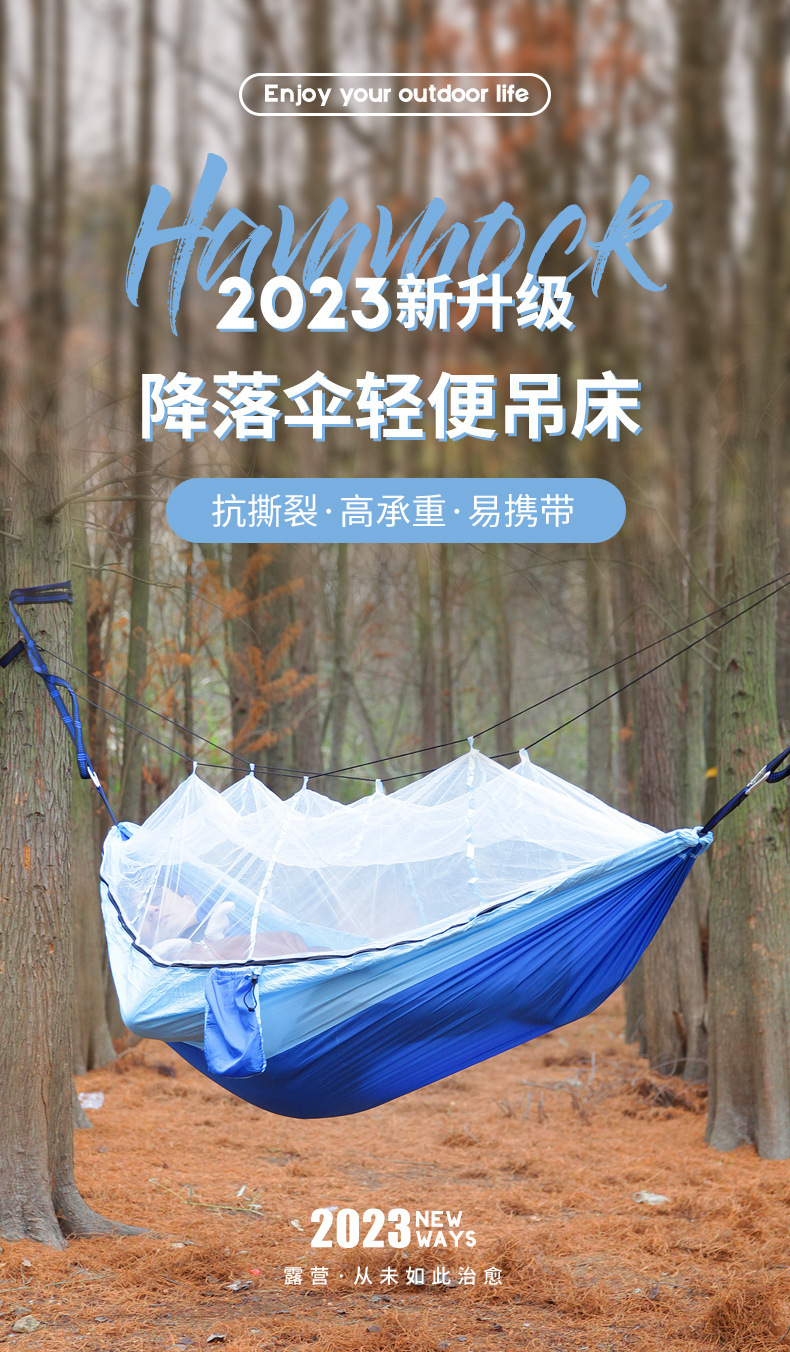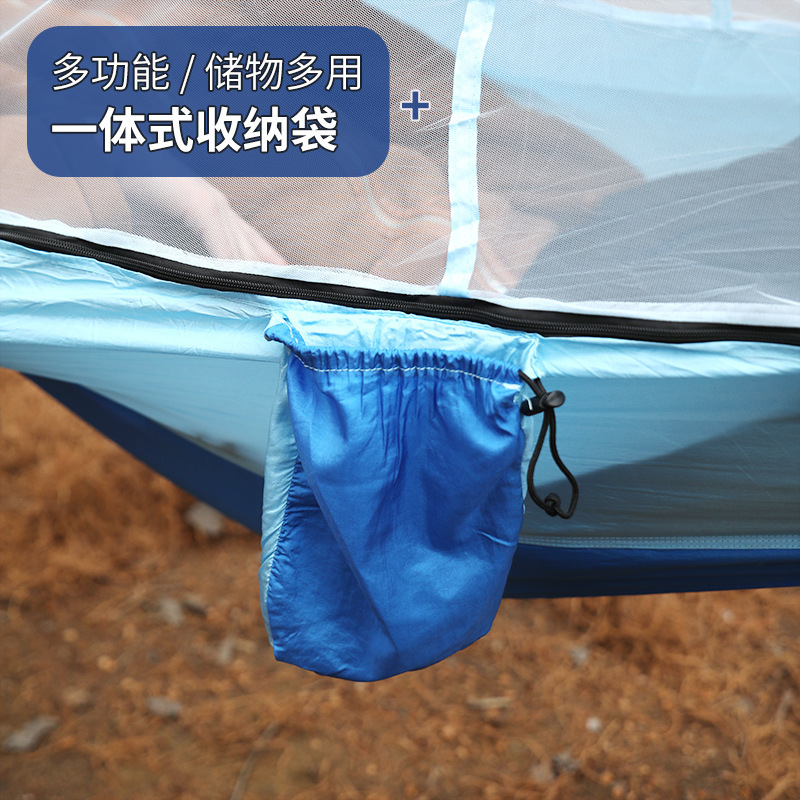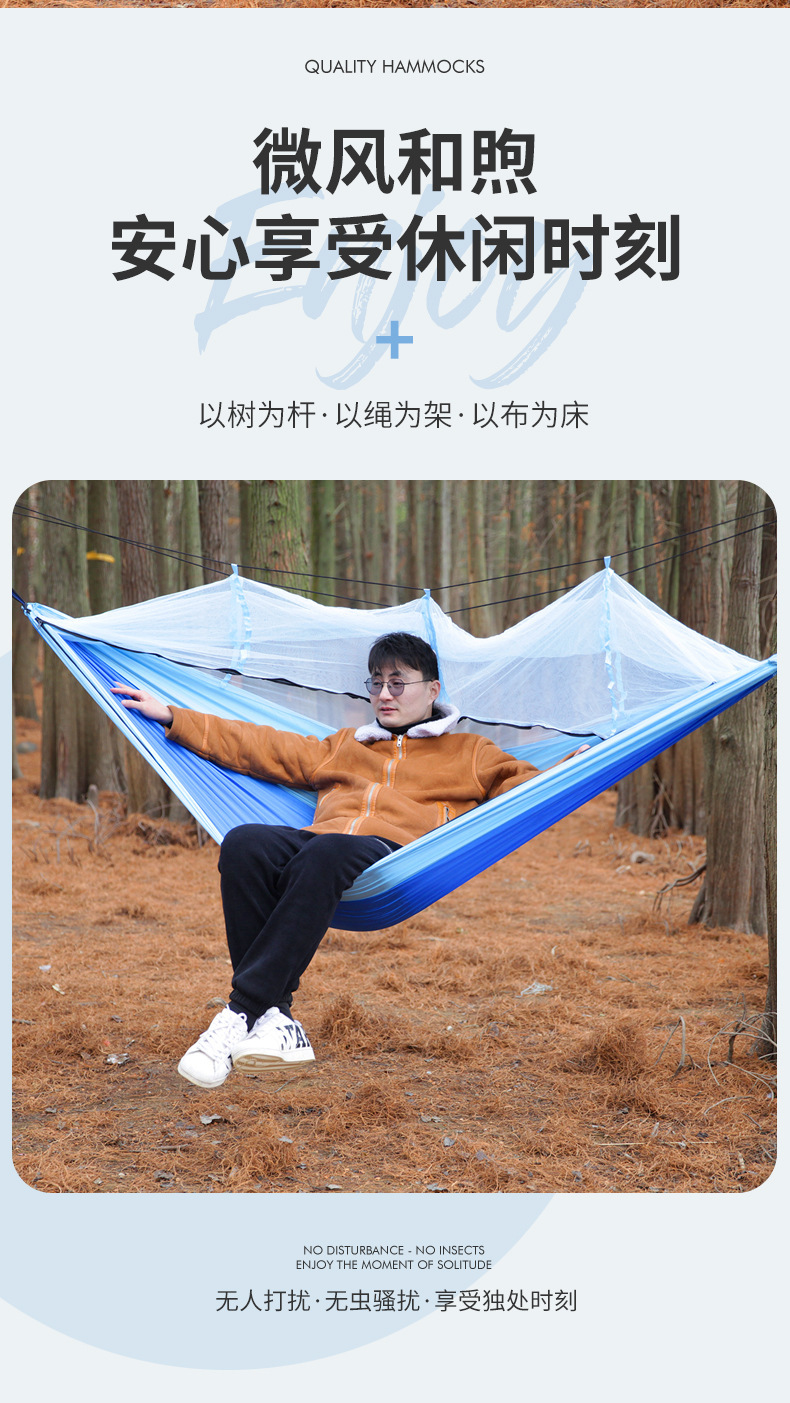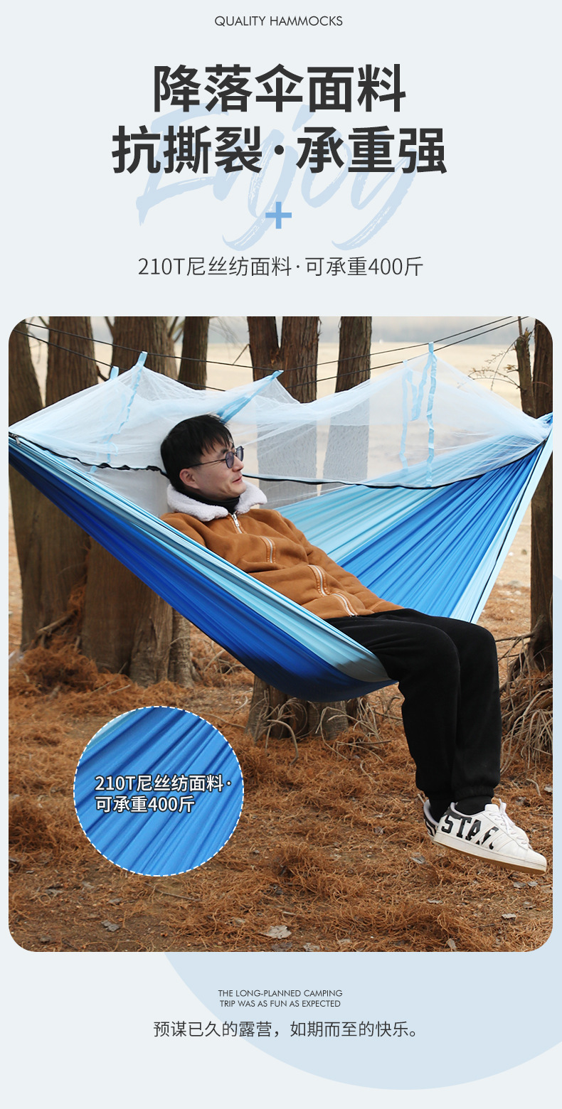 品名:蚊帐吊床 面料:210T起皱尼丝纺(俗称降落伞布)+涤纶网纱