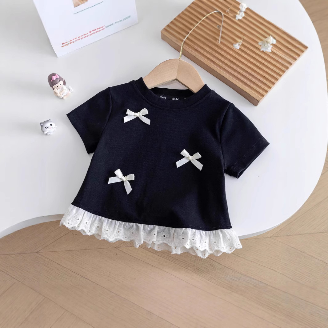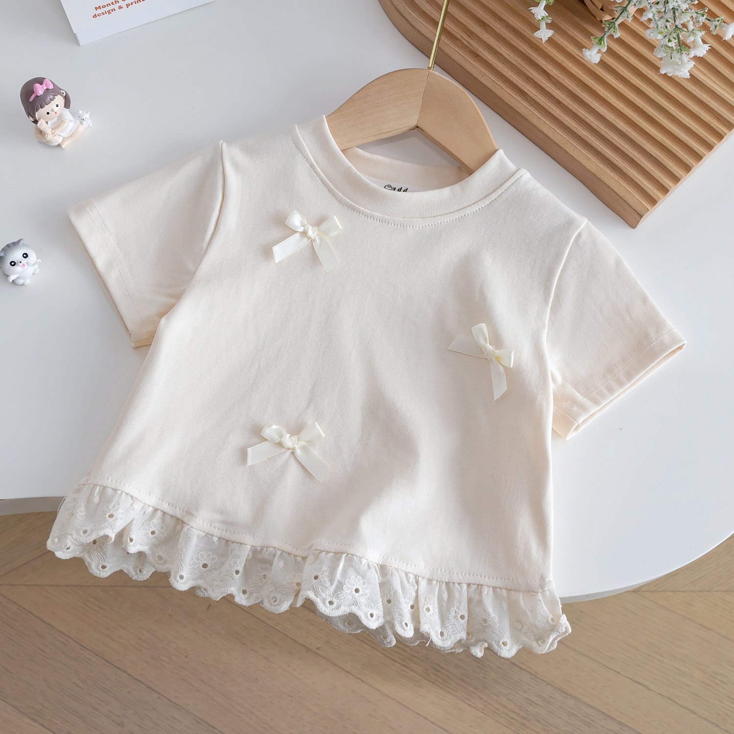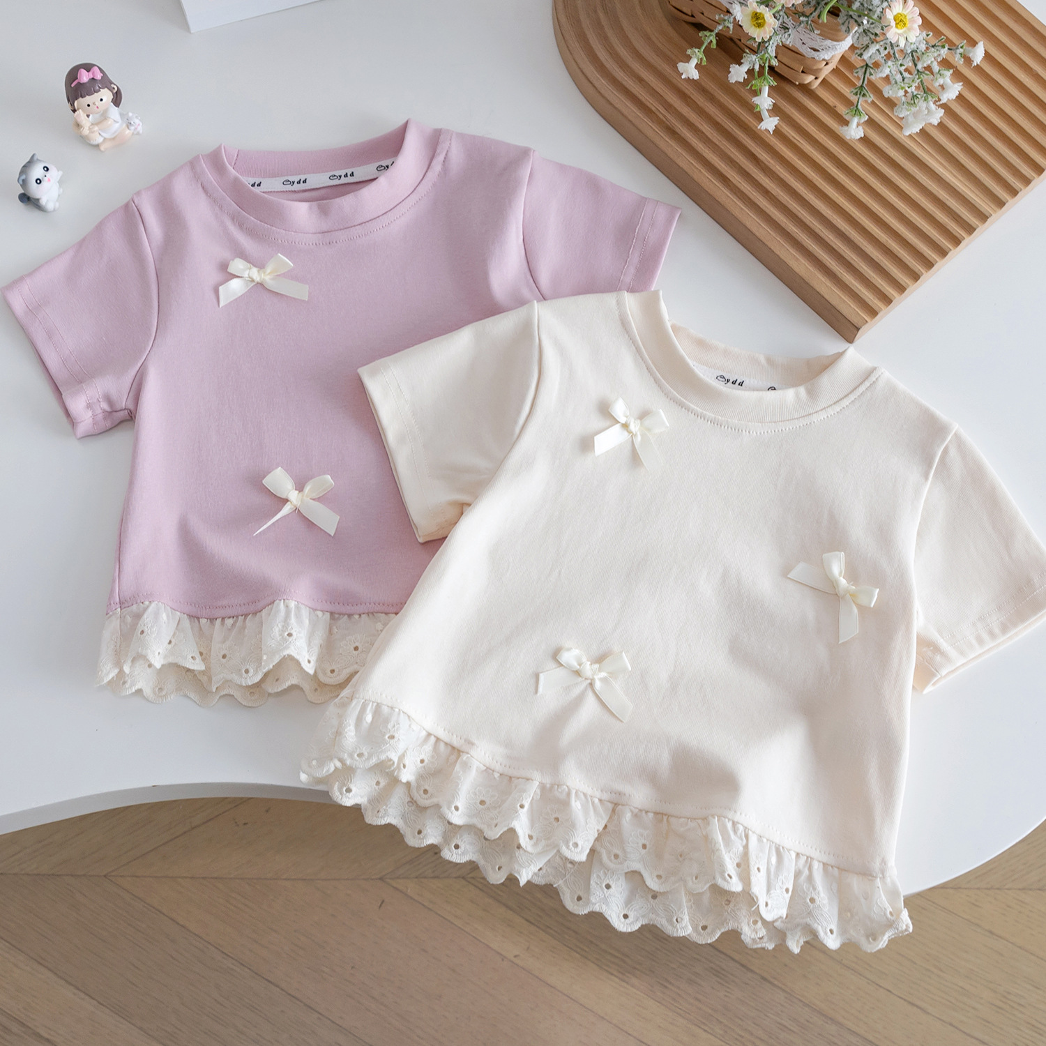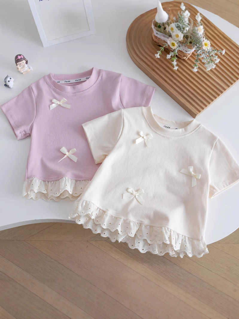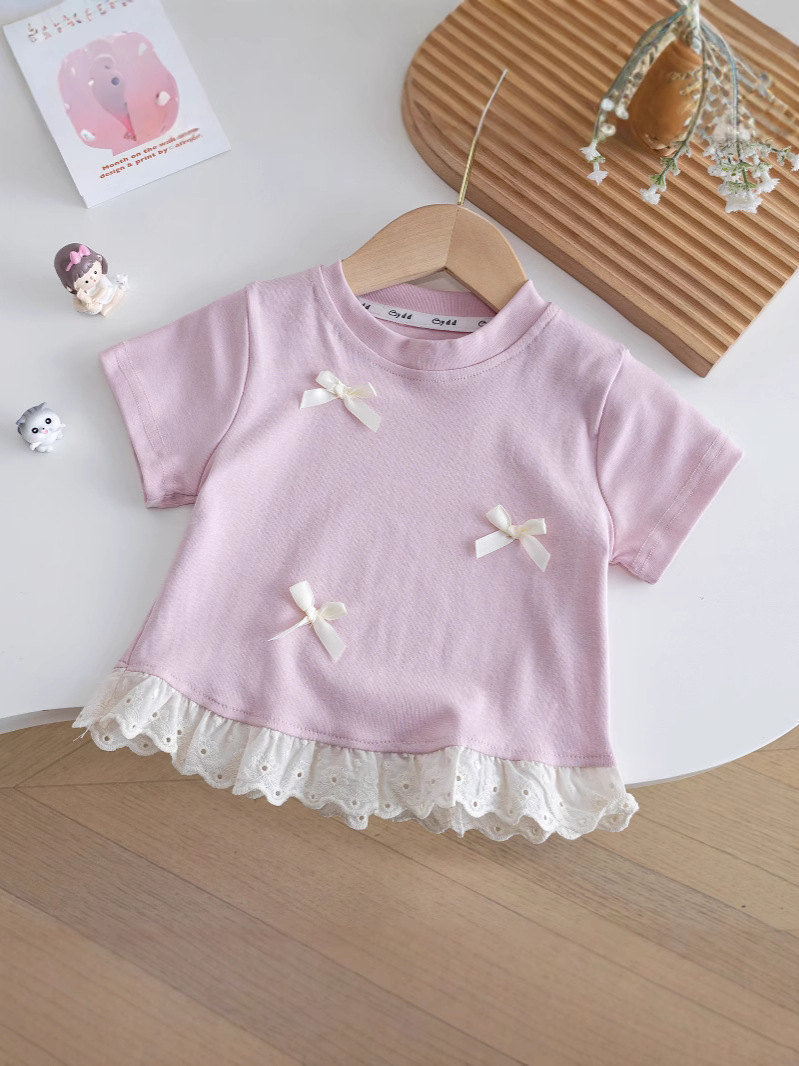 Доставка за 48 часов. Летняя одежда для девочек: розово-белая кружевная футболка с коротким рукавом для лета.
