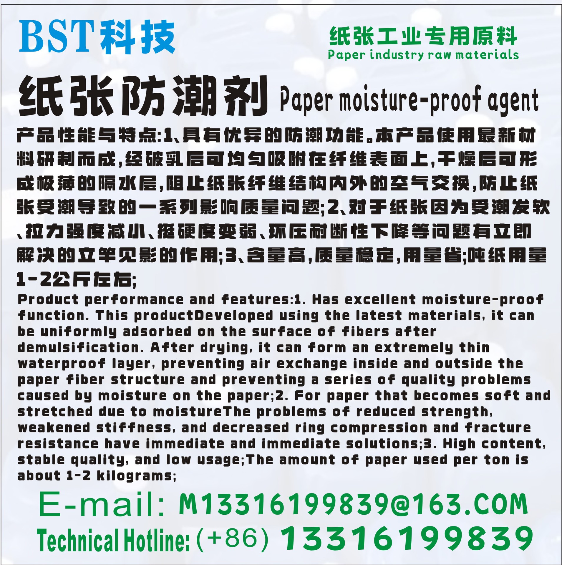 使用最新材料研制而成,经破乳后可均匀吸附在纤维表面上,干燥后可形成极薄的隔水层,阻止纸张纤维结构内外的空气交换,防止纸张受潮导致的一系列影响质量问题;