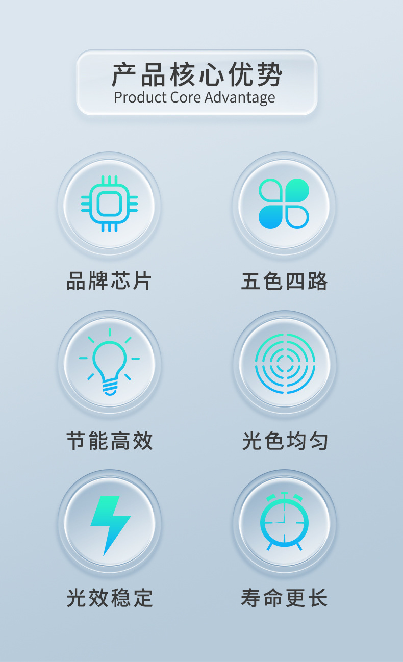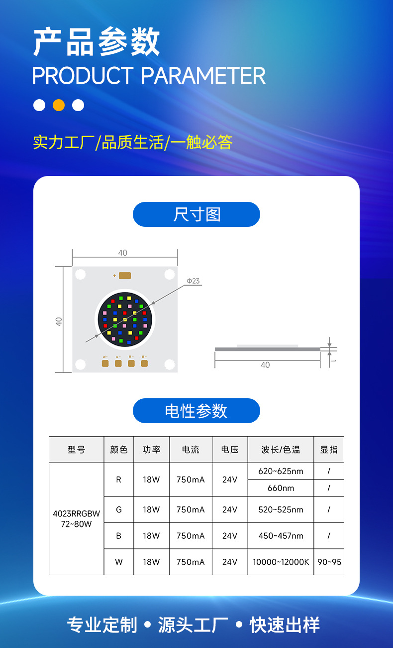 R:620-625nm;G:520-525nm;B:450-457nm;W:8000-10000K