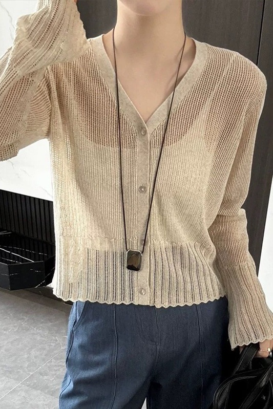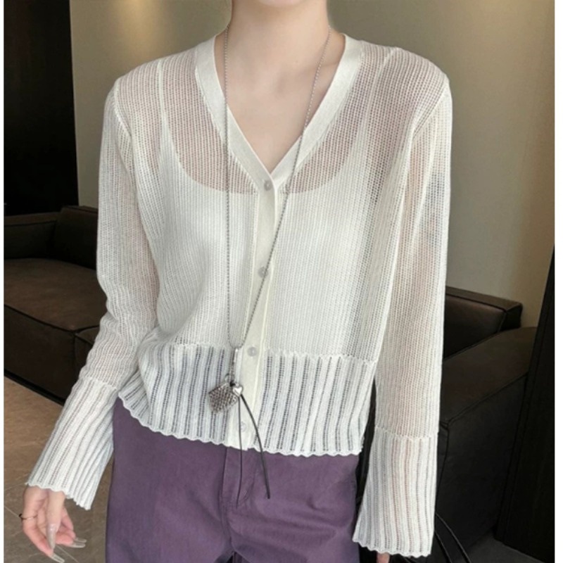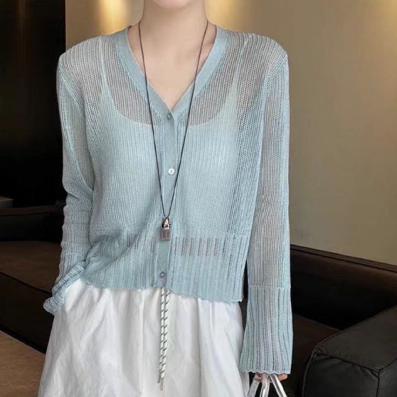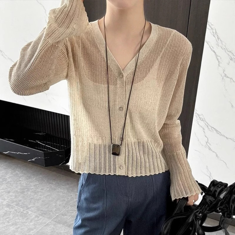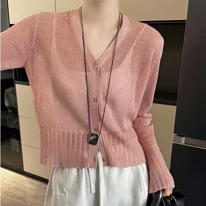 Модный однобортный вязаный кардиган из ледяного шелка в корейском стиле с v-образным вырезом для женщин, лето 2025, новый универсальный солнцезащитный топ с длинными рукавами
