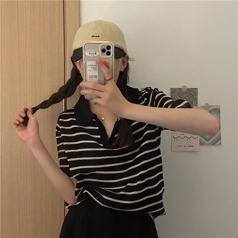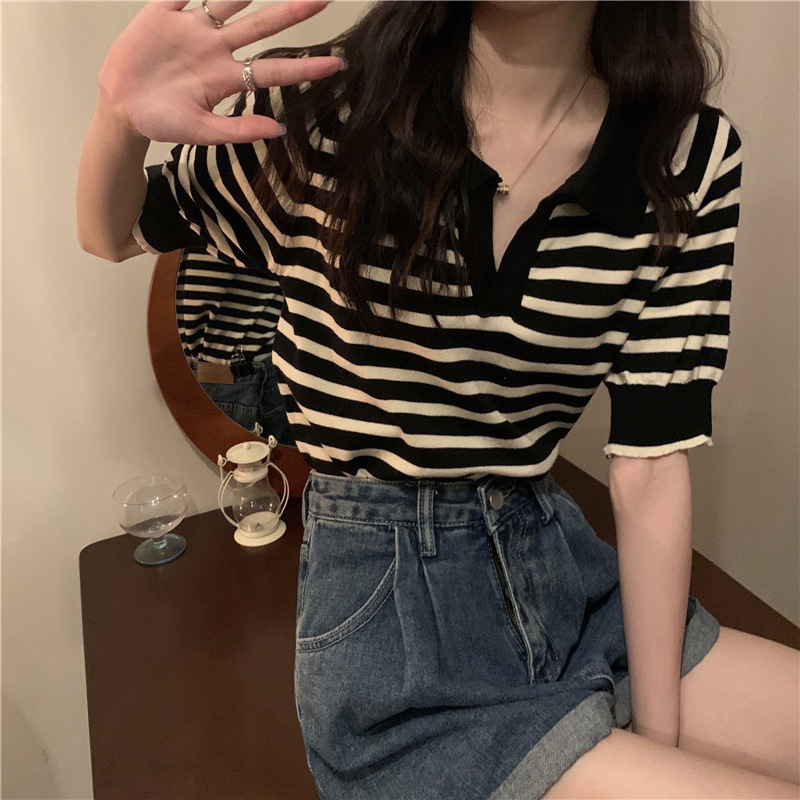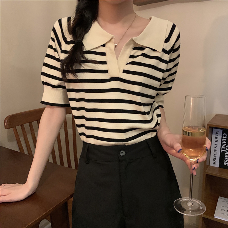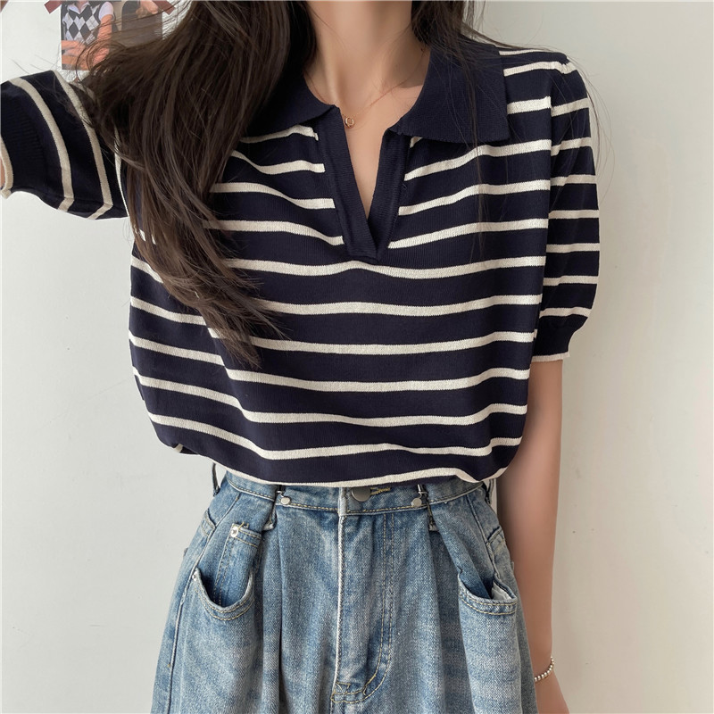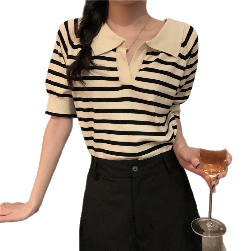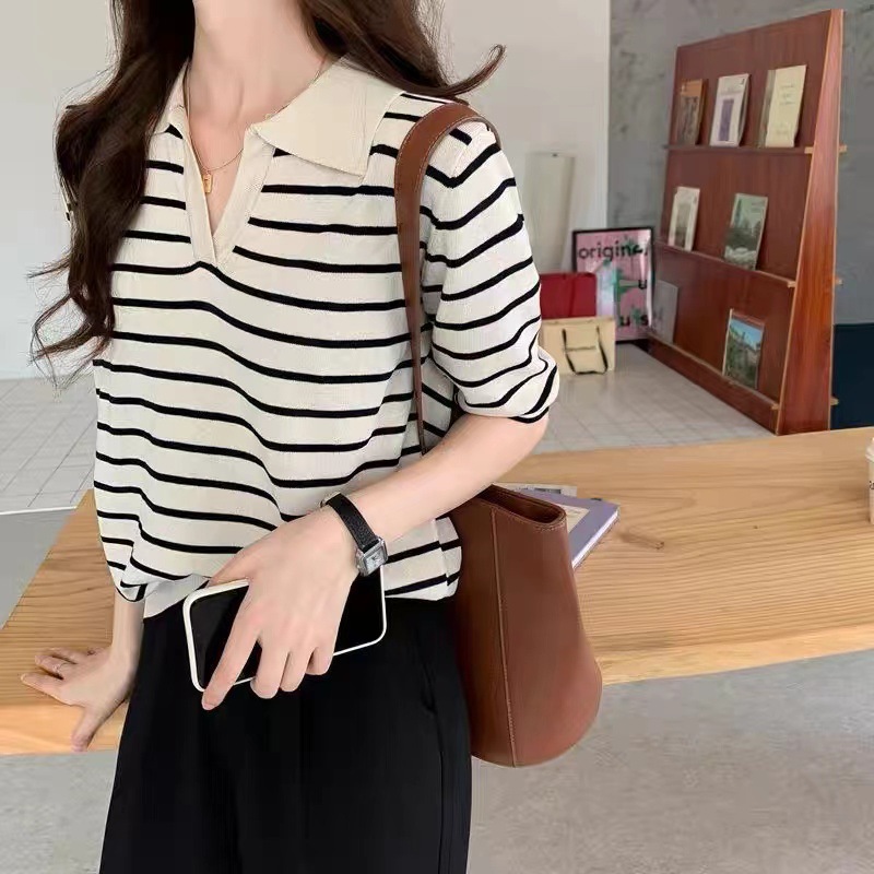 Корейский стиль, свободная футболка в полоску с короткими рукавами для женщин, лето 2024, новый универсальный топ с v-образным вырезом и половиной рукавов, тренд