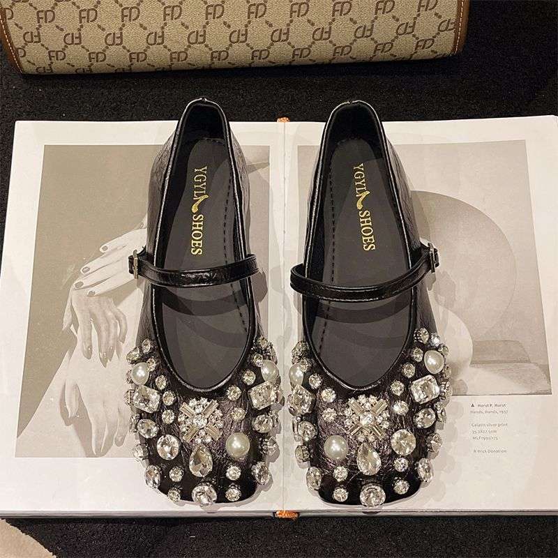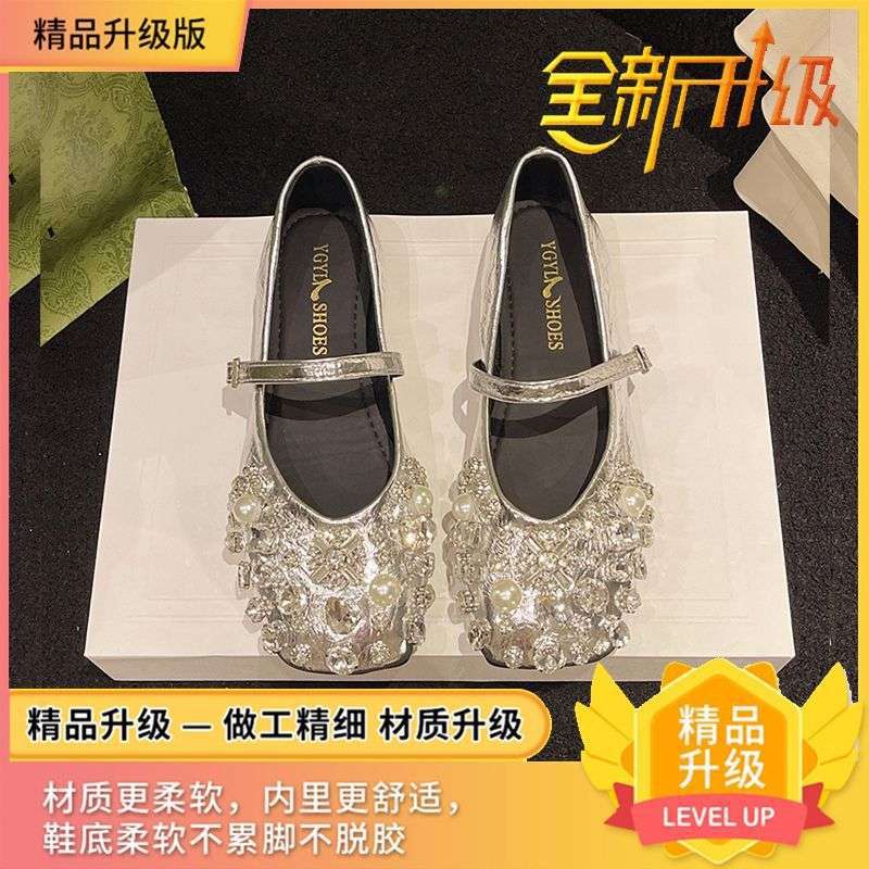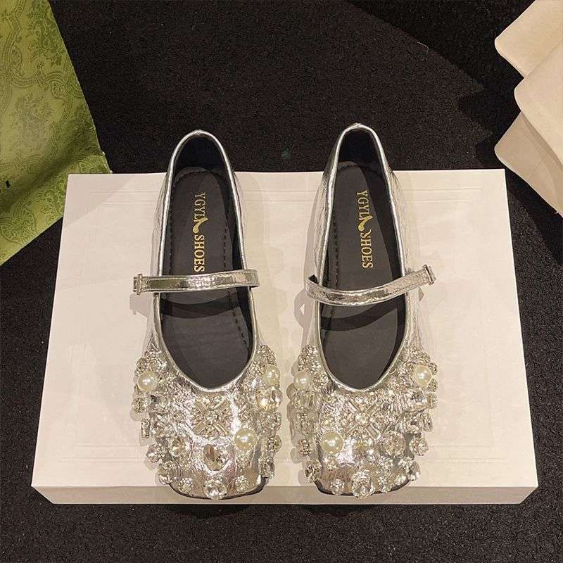 Женские туфли Мэри Джейн в стиле французской феи, серебряные, с яркими бриллиантами, весна 2025, новая модель, с юбкой, плоский каблук.