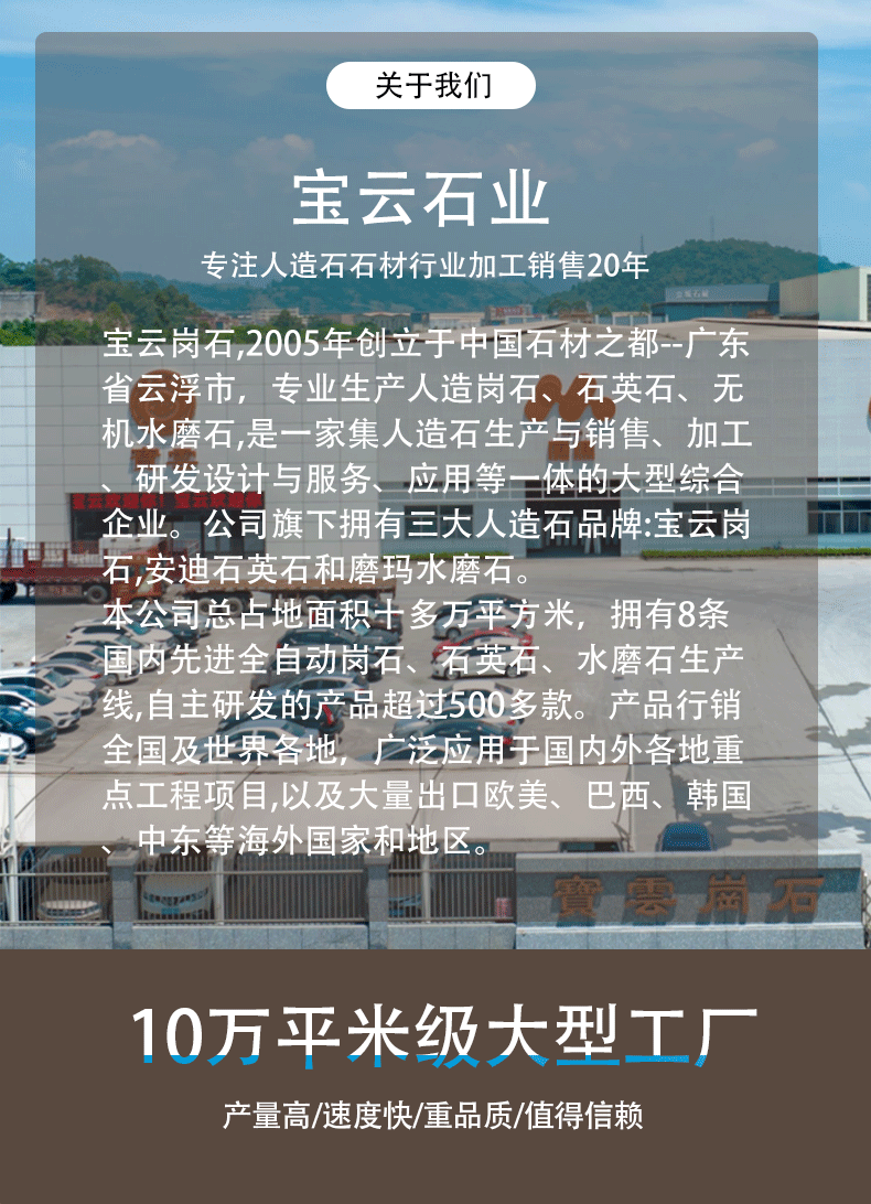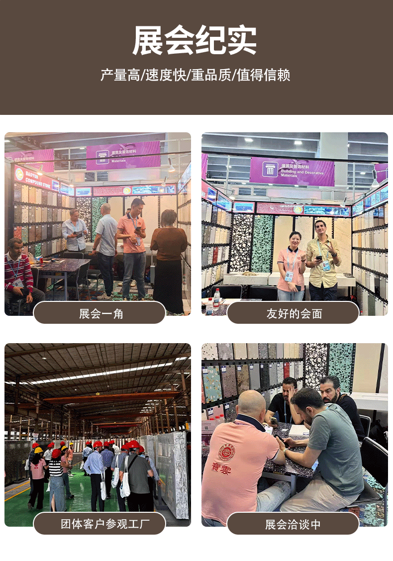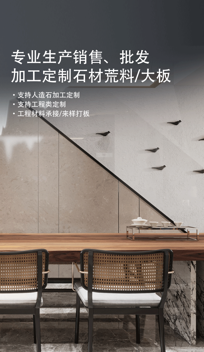 从家居的温馨角落到商业的大气空间,从地面的稳固铺装到墙面的精致装饰,我们的产品覆盖人造石石材、石英石、岗石、大理石、水磨石等全品类,用品质石材为你打造 “颜值与实用并存” 的理想空间,让每一次目光停留,都能感受到生活的美好质感。人造石荒料