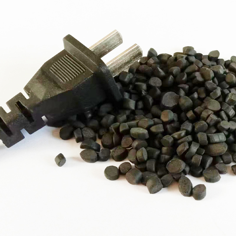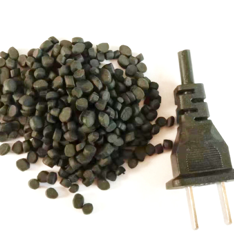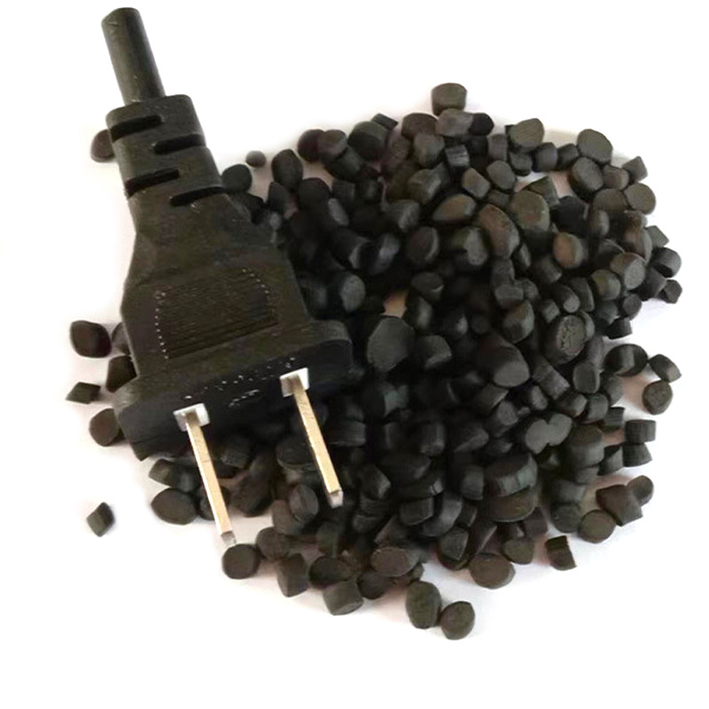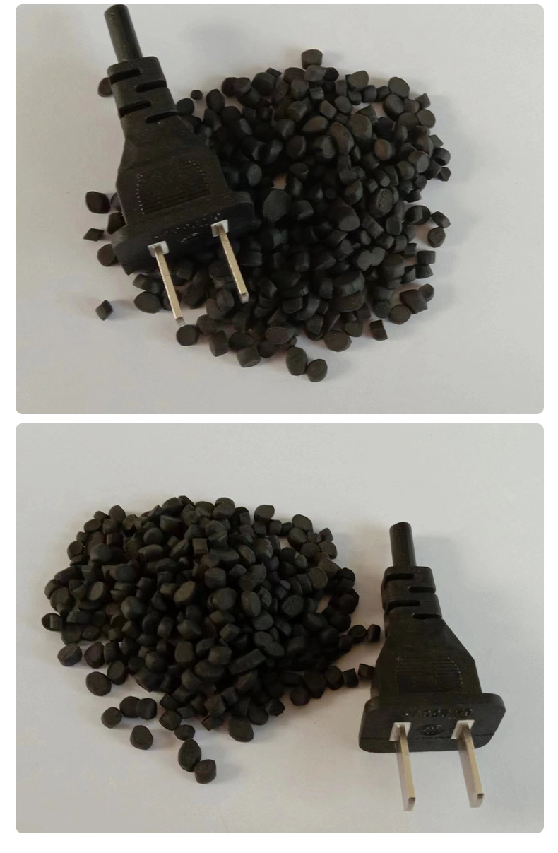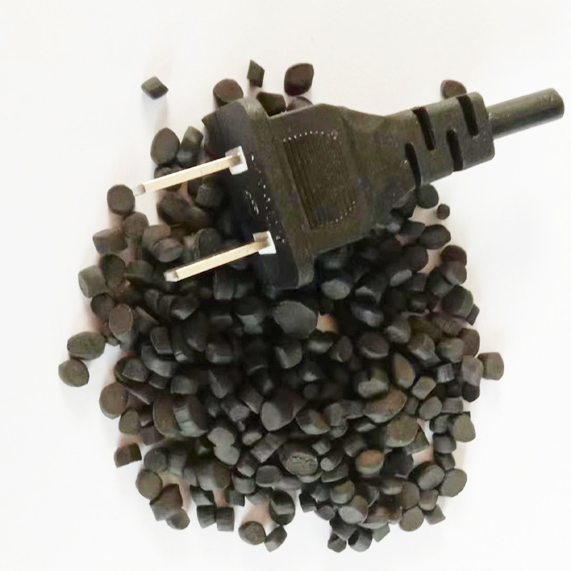 Огнестойкий материал для вилок-разъемов: гранулы ПВХ, экструзионный и инжекционный сорт, поливинилхлорид, мягкие черные гранулы из переработанного сырья.