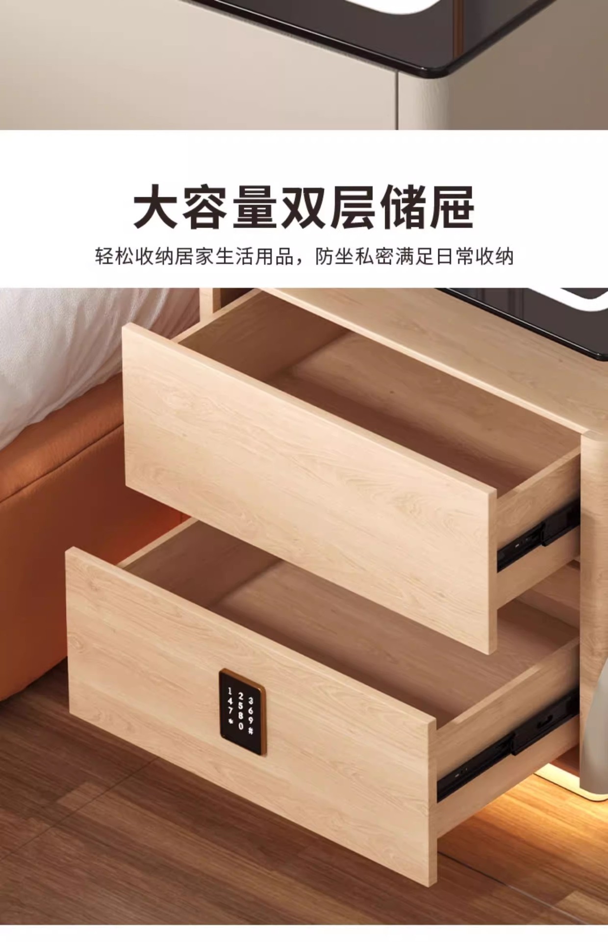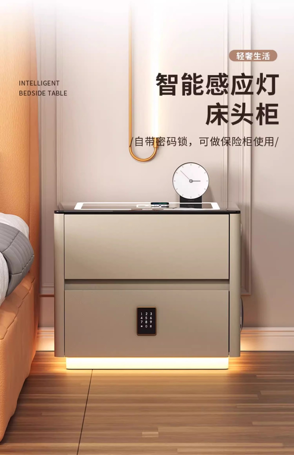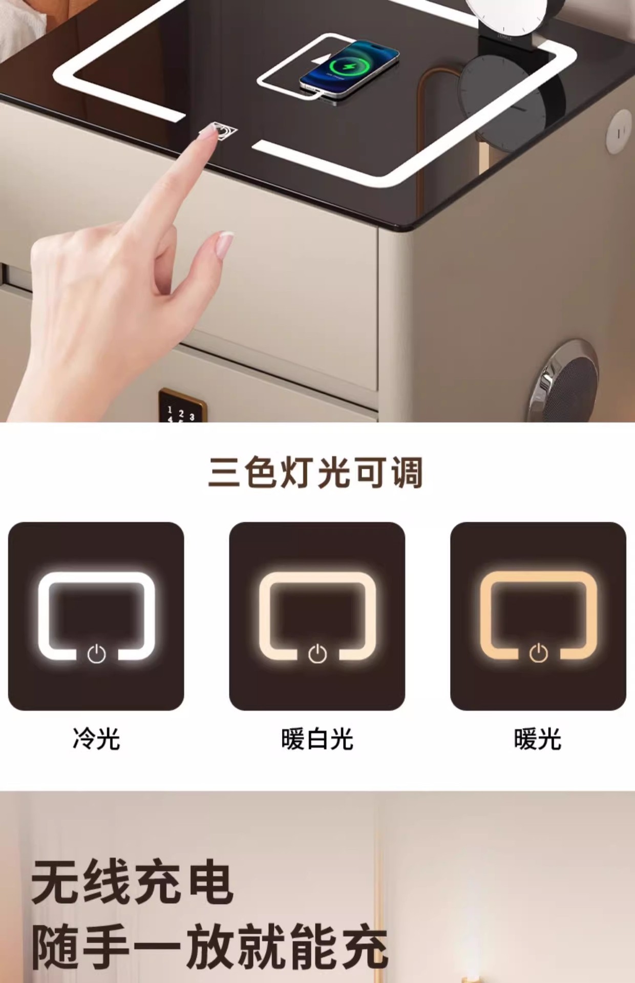 Умная прикроватная тумбочка для дома и спальни 2025 года, новый стиль, доступная роскошь, высококлассная компактная тумбочка с беспроводной зарядкой и аудиосистемой.