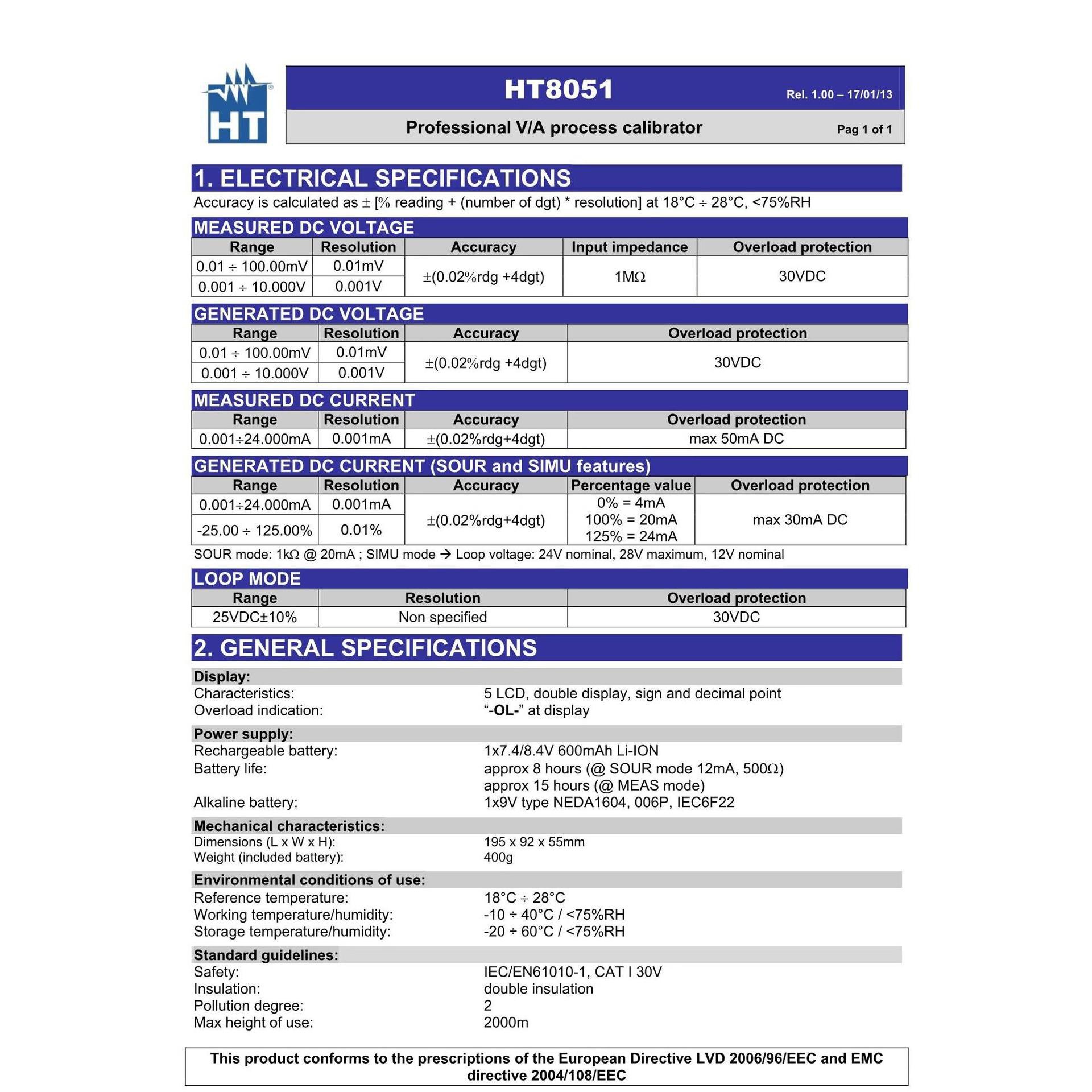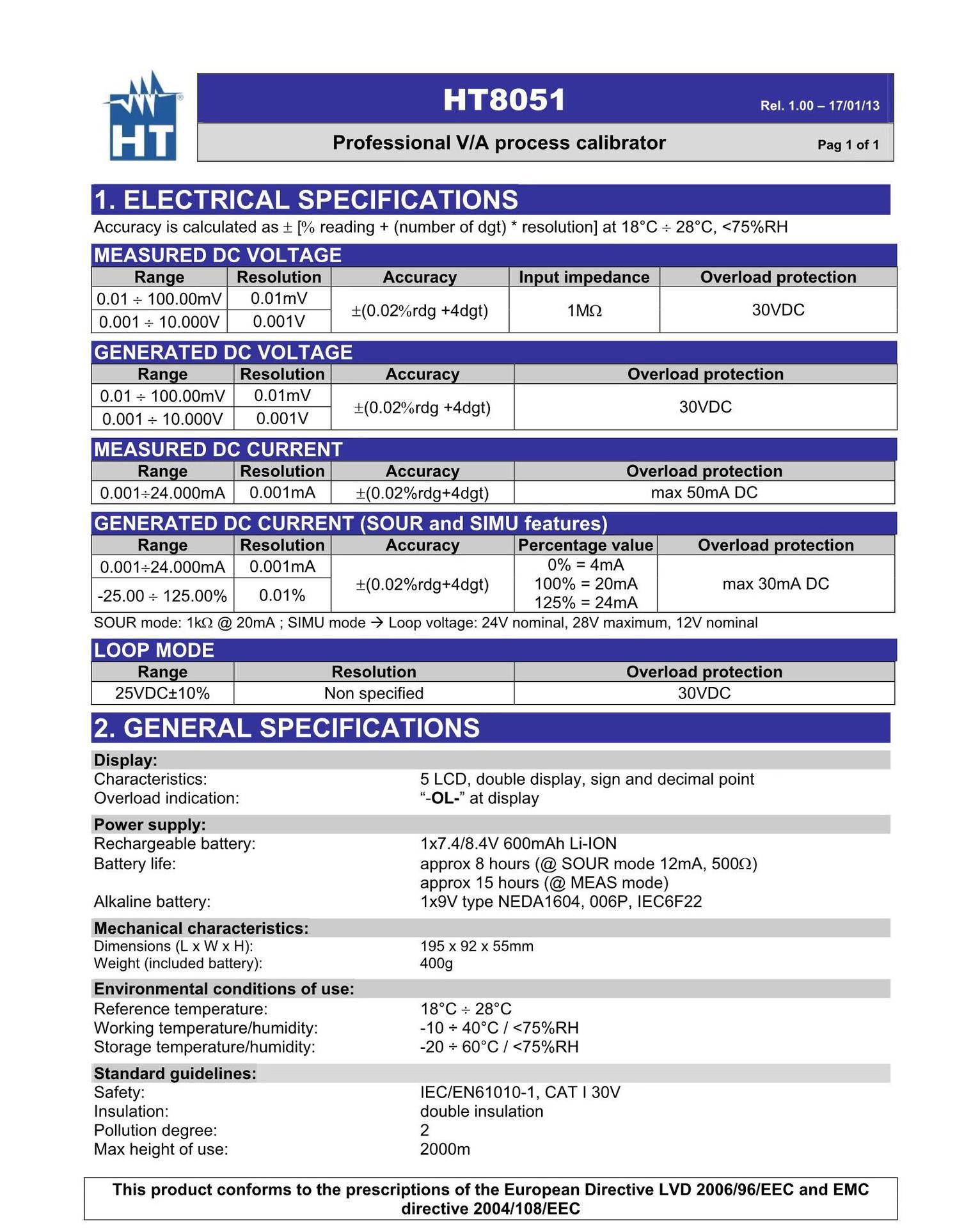 Италия HT Instruments HT8051 Многофункциональный процессный калибратор 4-20 мА / 0-10 В