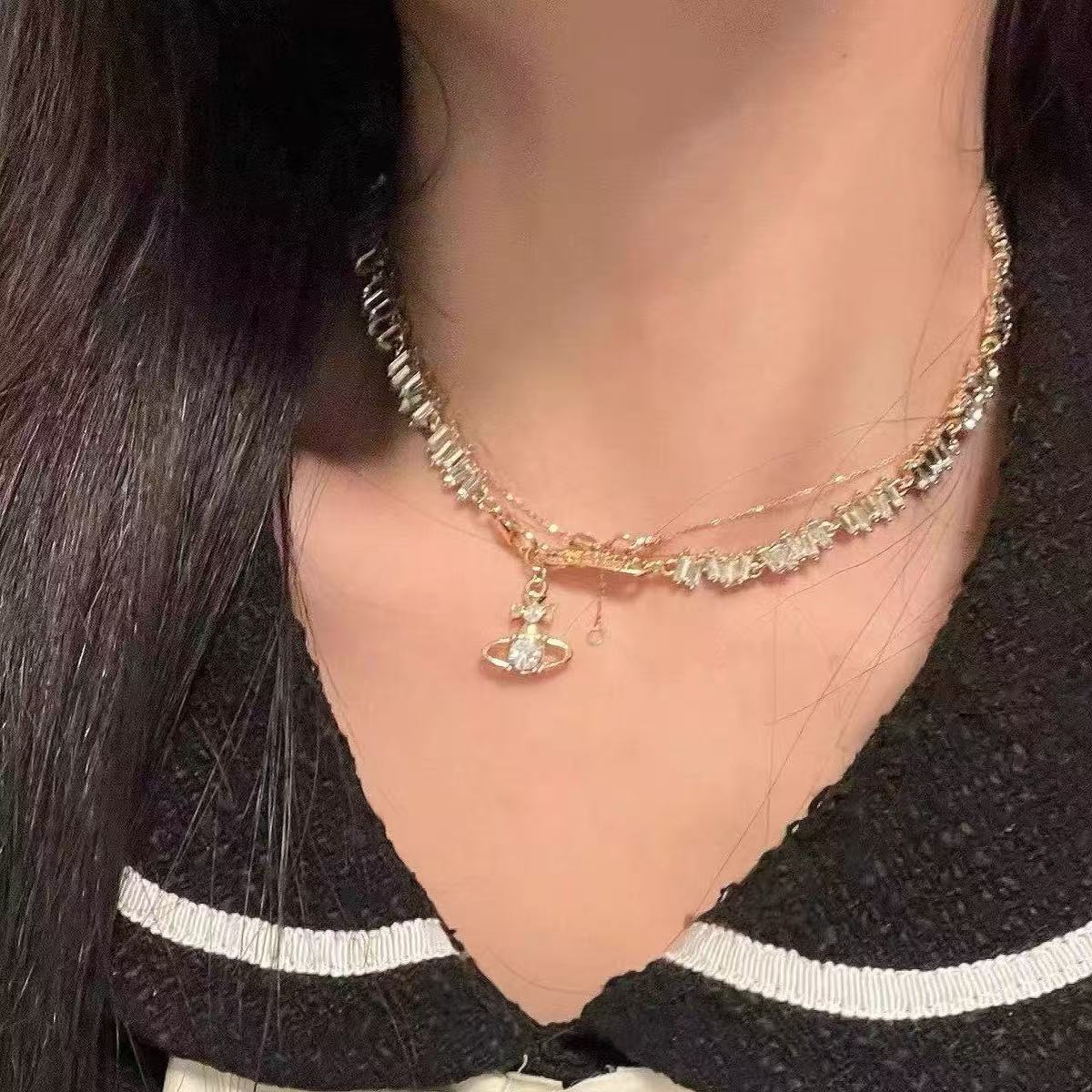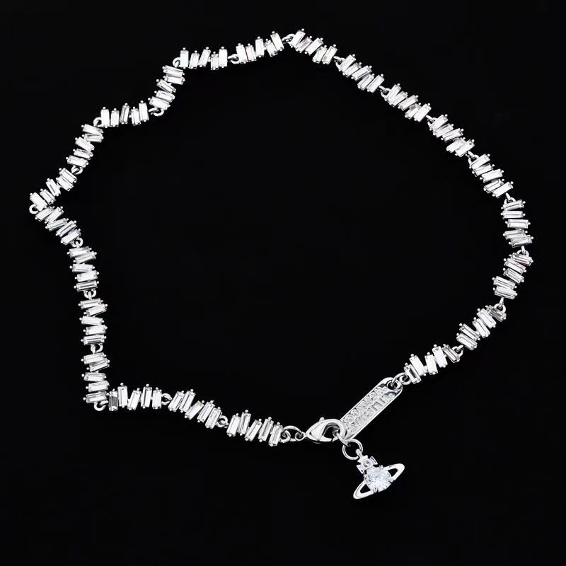 Ожерелье Empress Queen Mother Square Diamond Saturn с цирконом Vivian Planet Fashion Light Luxury Style Высококачественная универсальная элегантная цепочка на ключицу.