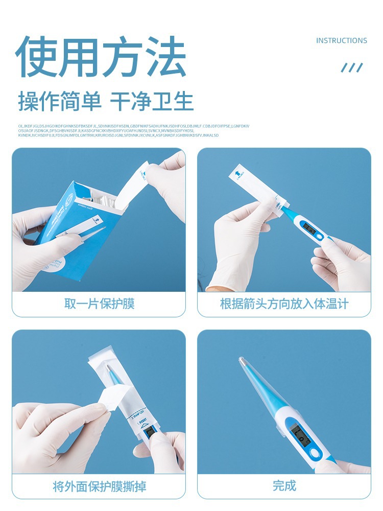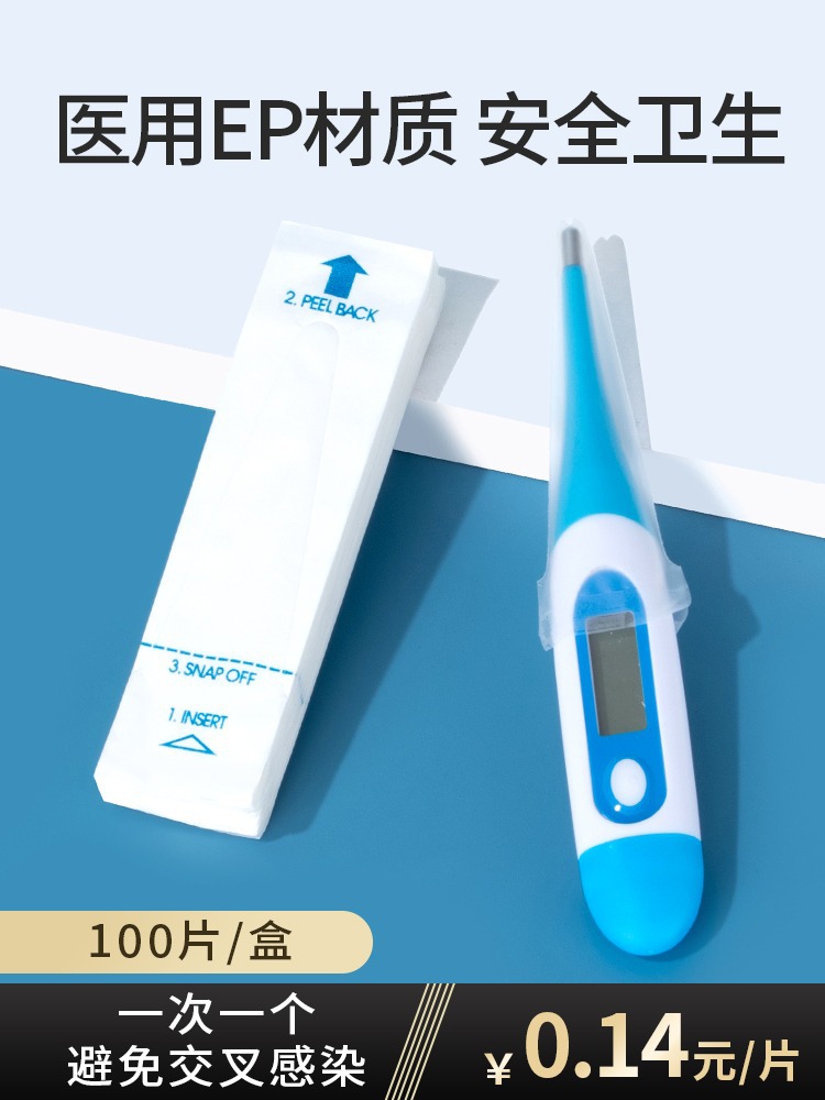 本品供体温计测量体温时使用,为一次性使用,卫生方便,避免使用体温计时交叉传染, 同时不影响测量准确性。