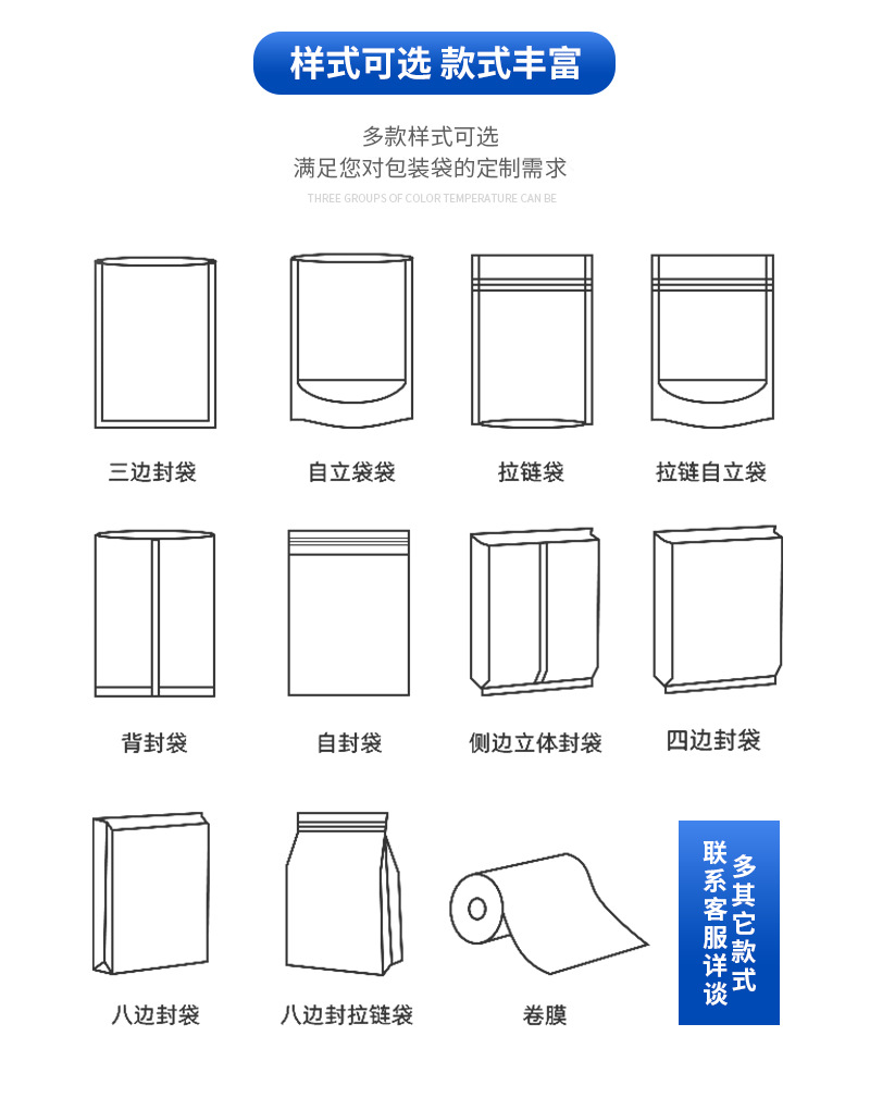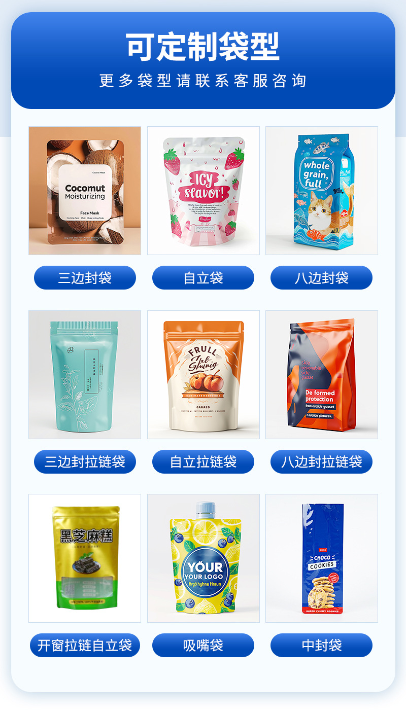 Трехсторонний герметичный пакет; Сумка на молнии с тремя боковыми уплотнителями; стоячая сумка; Отдельная сумка на молнии.; Восьмисторонняя сумка на молнии.; Композитная рулонная пленка; мешок для насадок; сумка со средним уплотнением; Легкая сумка; лазерная сумка; кофейный пакетик; чайный пакетик; сумка для маски для лица