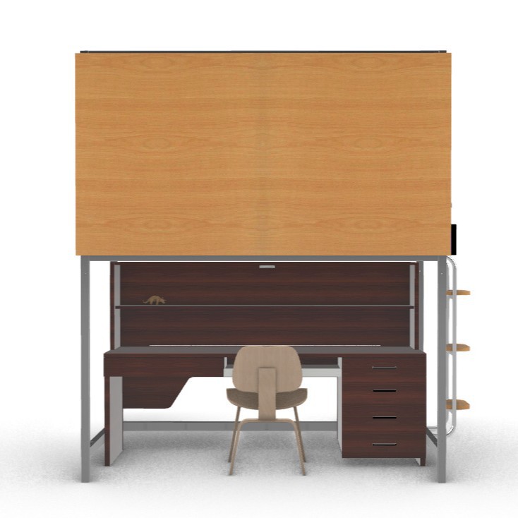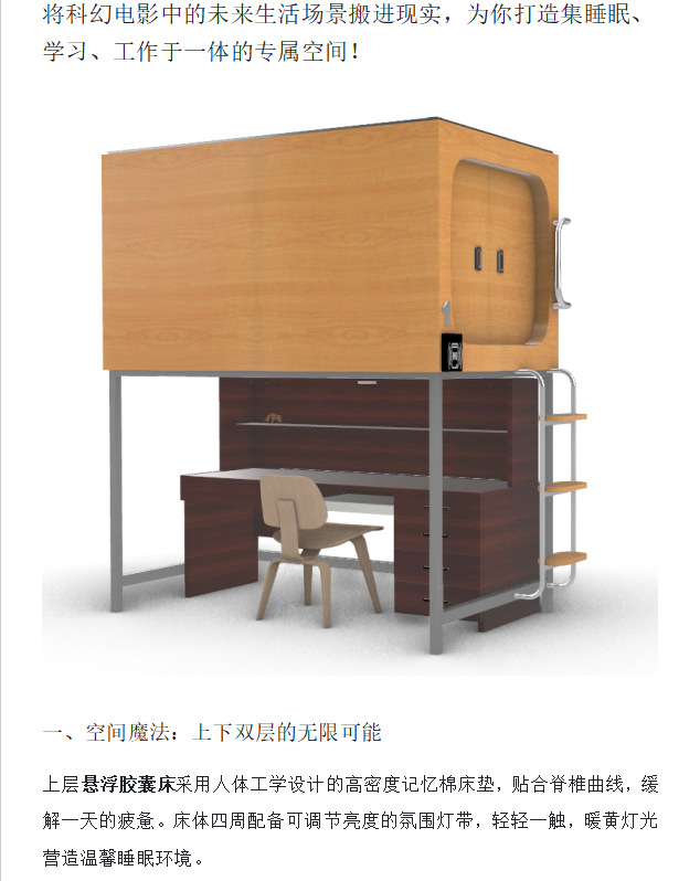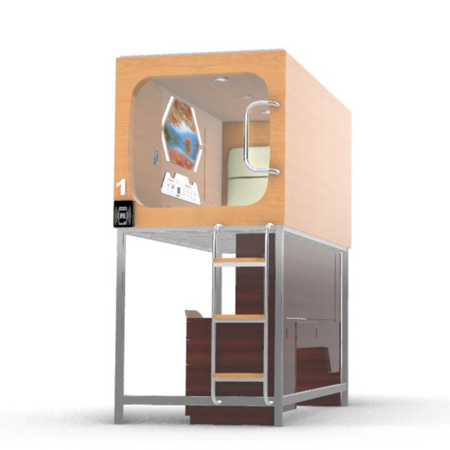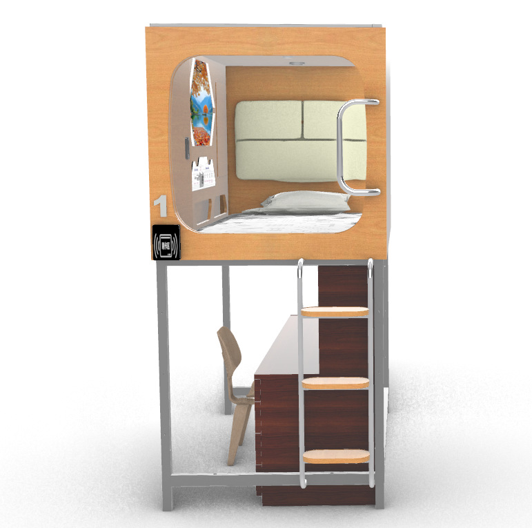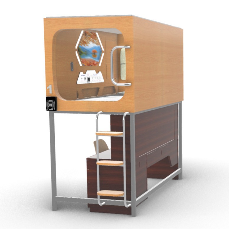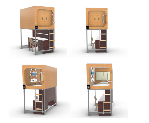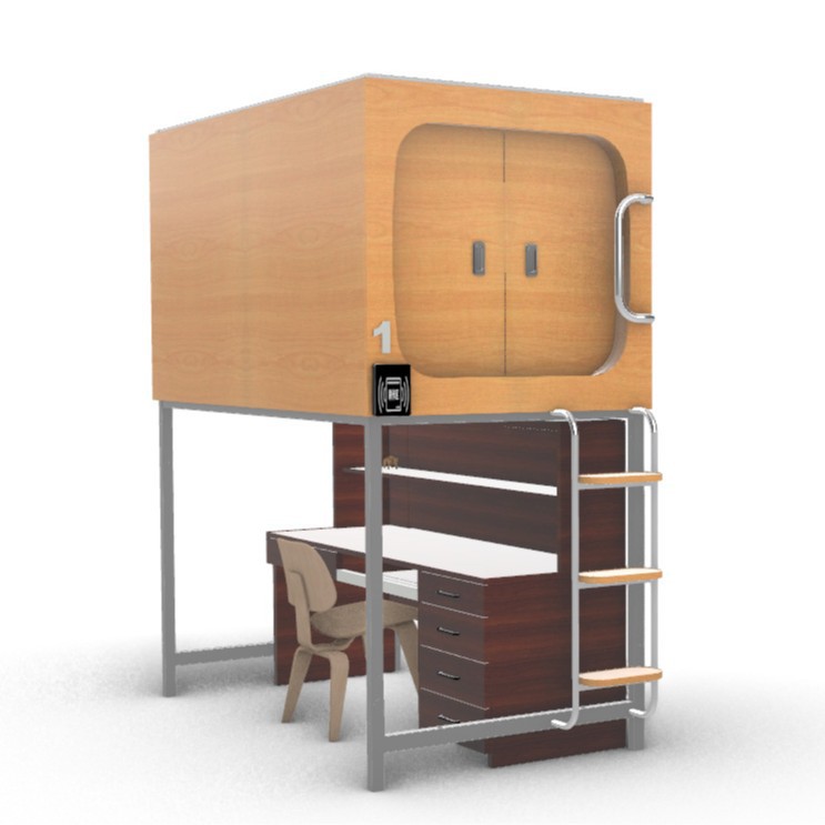 Кровать-капсула для рабочего стола может быть собрана и разобрана над капсулой и под столом.
