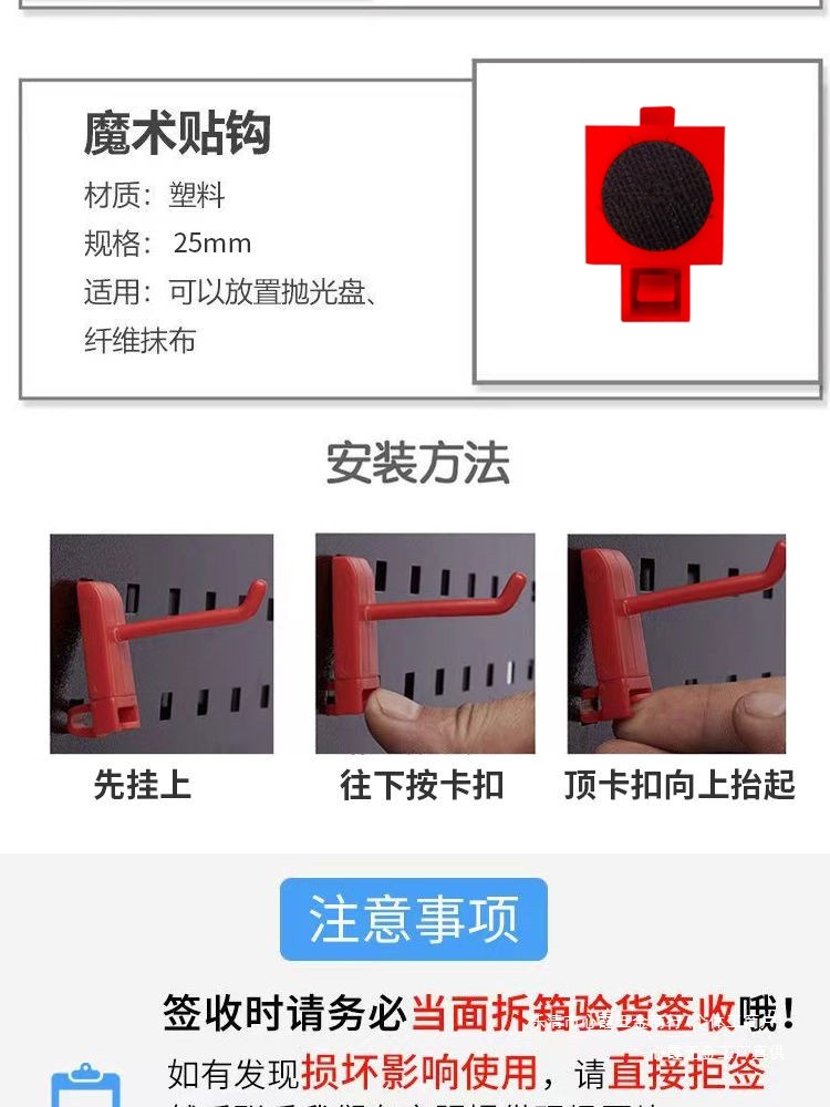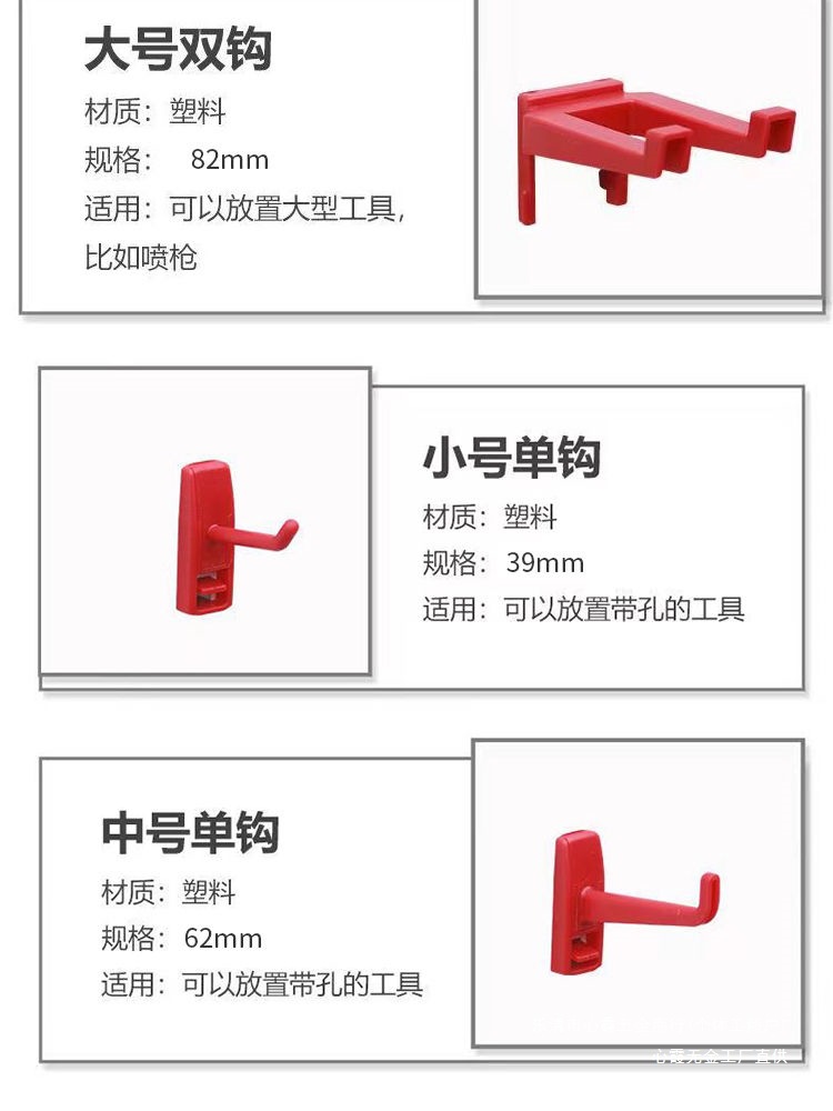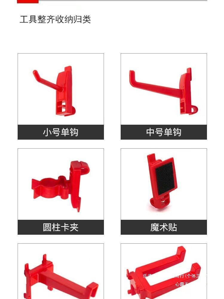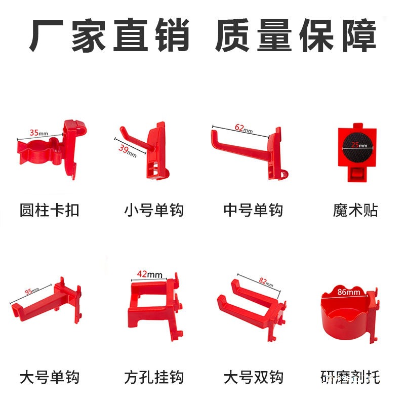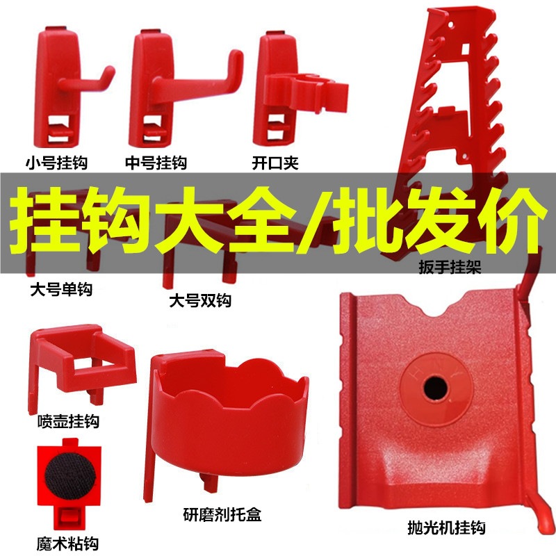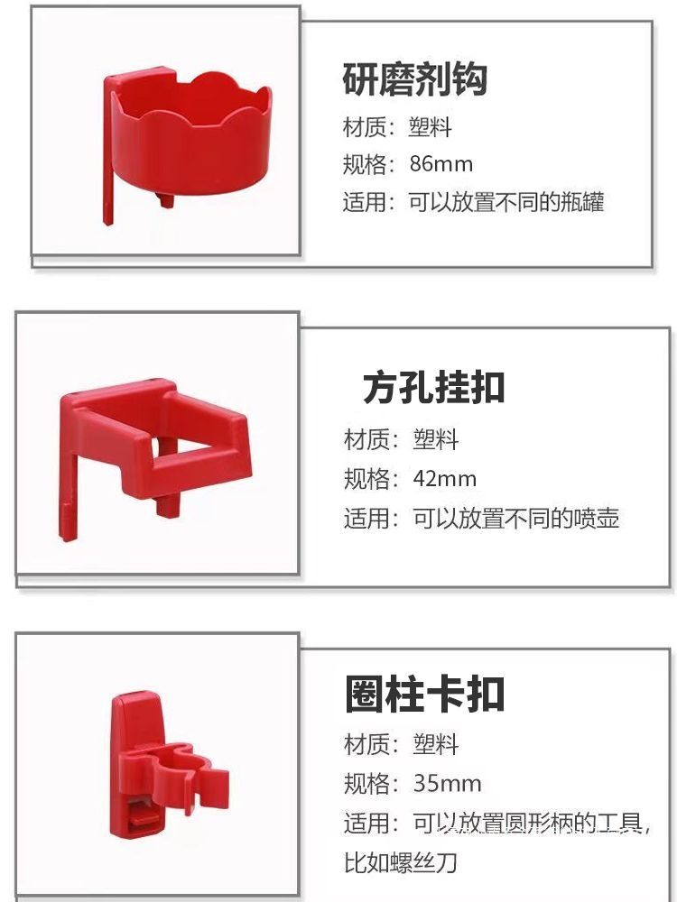10 маленьких крючков из АБС-пластика [для квадратных отверстий]; 10 средних крючков из АБС-пластика [только для квадратных отверстий]; 10 открывающихся зажимов из АБС-пластика [для квадратных отверстий]; 6 крючков на липучке из АБС-пластика [для квадратных отверстий]; 5 больших одинарных крючков из АБС-пластика [для квадратных отверстий]; 4 больших двойных крючка из АБС-пластика [для квадратных отверстий]; 5 крючков для лейки из АБС-пластика [для квадратных отверстий]; 2 держателя абразивных дисков из АБС-пластика [для квадратных отверстий]; 1 кисточка для подвешивания полотенец для лейки; 1 держатель ключа из АБС-пластика; Крюк для полировки АБС 1