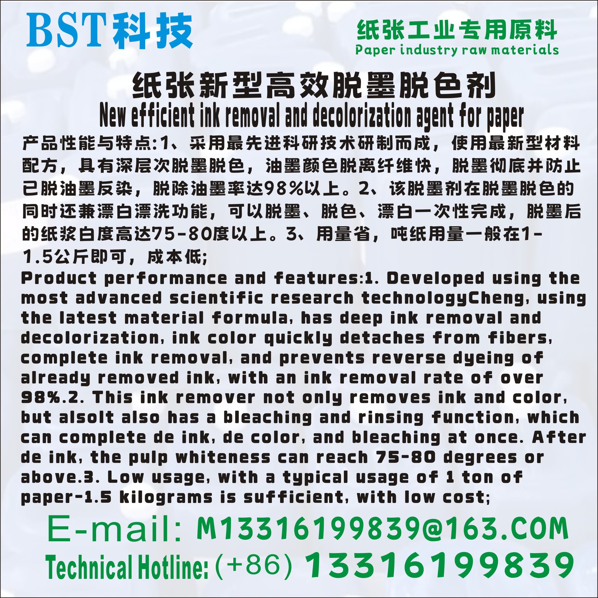 成,使用最新型材料配方,具有深层次脱墨脱色,油墨颜色脱离纤维快,脱墨彻底并防止已脱油墨反染,脱除油墨率达98%以上。
