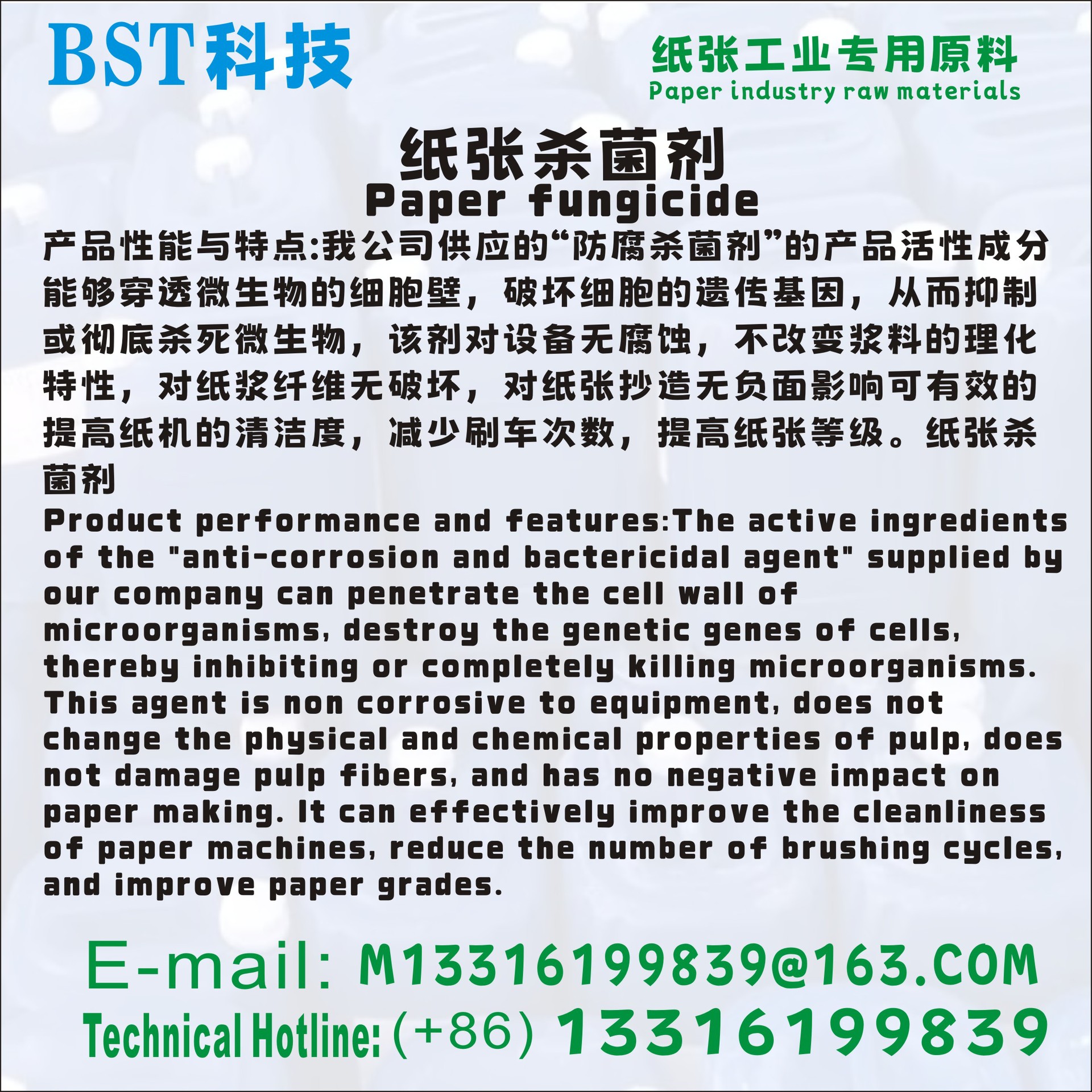 The active ingredients of the "anti-corrosion and bactericidal agent" supplied by our company can penetrate the cell wall of microorganisms, destroy the genetic genes of cells, thereby inhibiting or completely killing microorganisms. This agent is non corrosive to equipment, does not change the physical and chemical properties of pulp, does not damage pulp fibers, and has no negative impact on paper making. It can effectively improve the cleanliness of paper machines, reduce the number of brushing cycles, and improve paper grades.
