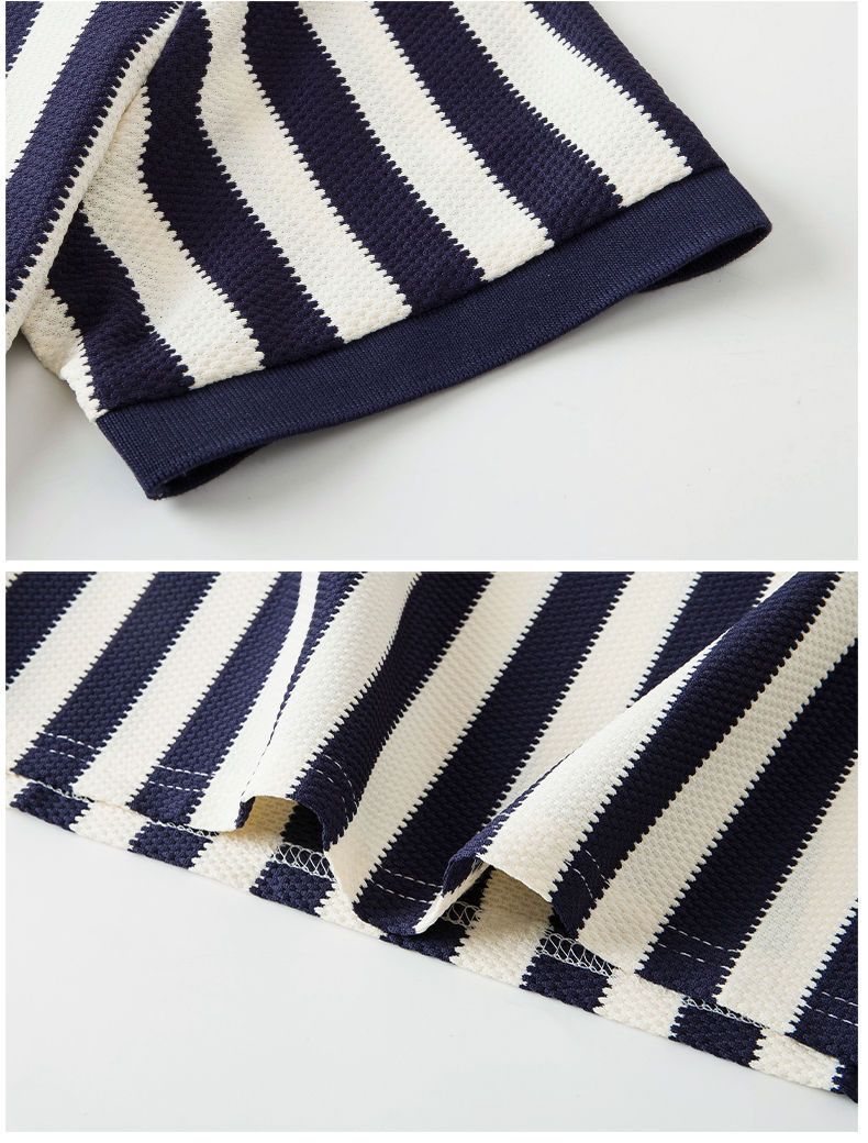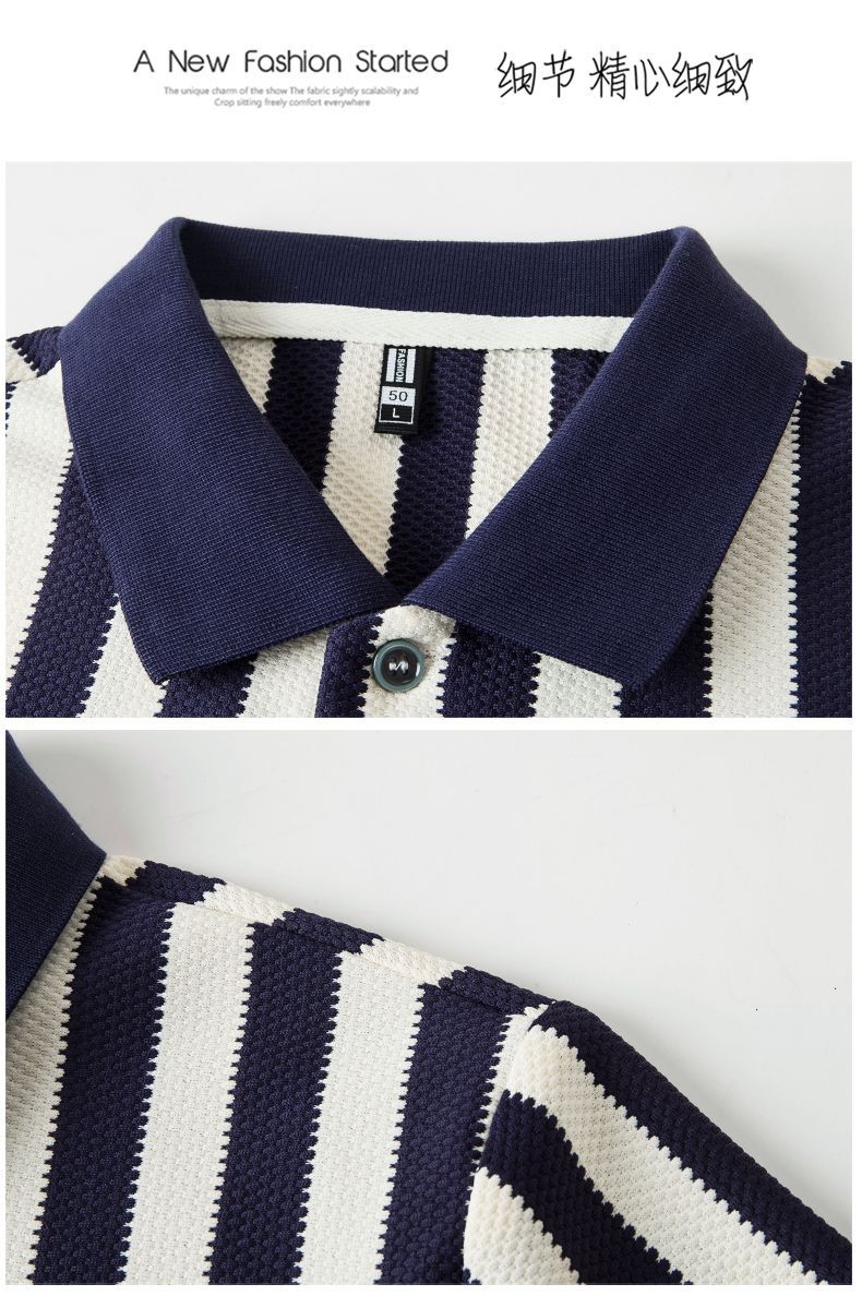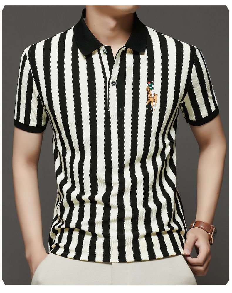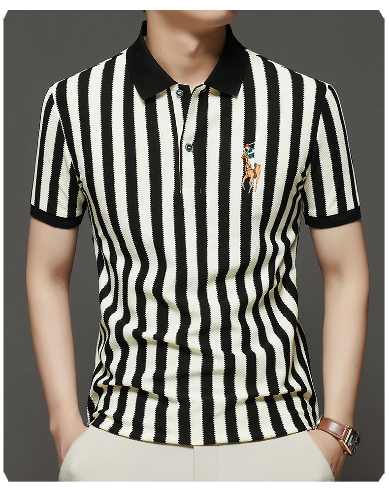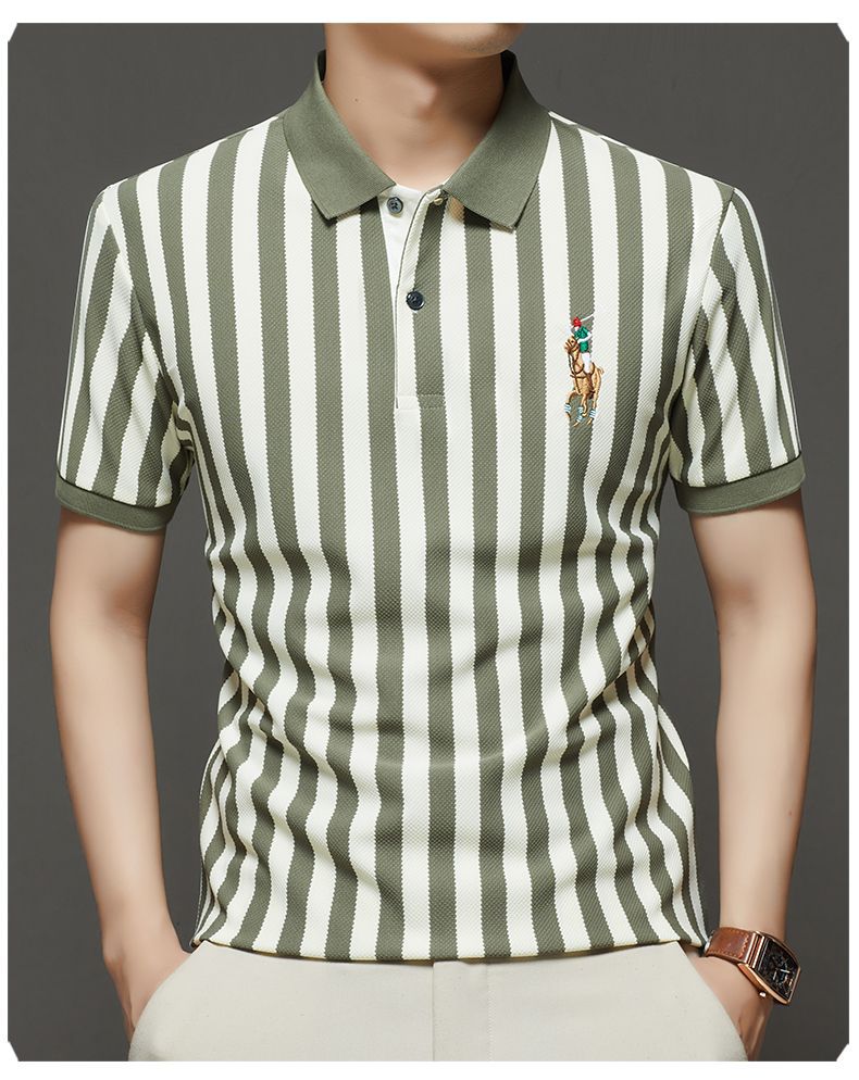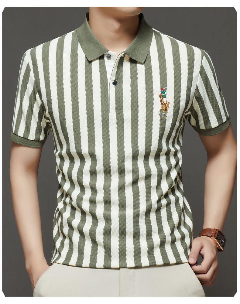 【Qi02】Летняя мужская легкая роскошная футболка с короткими рукавами, полосатая рубашка-поло, свободный деловой топ с отложным воротником, мужская одежда