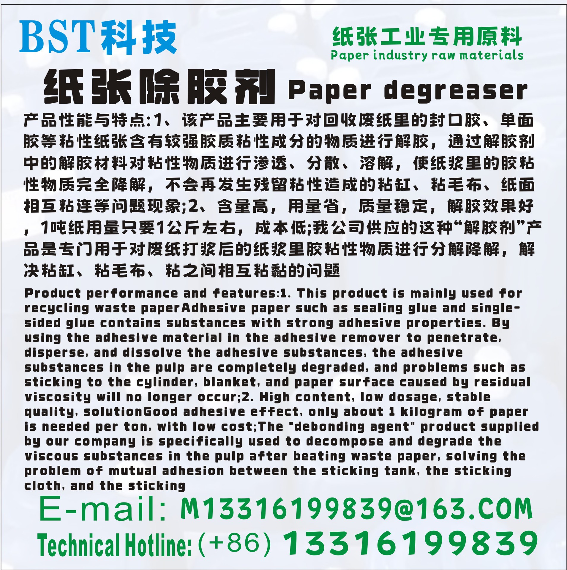 封口胶、单面胶等粘性纸张含有较强胶质粘性成分的物质进行解胶,通过解胶剂中的解胶材料对粘性物质进行渗透、分散、溶解,使纸浆里的胶粘性物质完全降解,不会再发生残留粘性造成的粘缸、粘毛布、纸面相互粘连等问题现象;