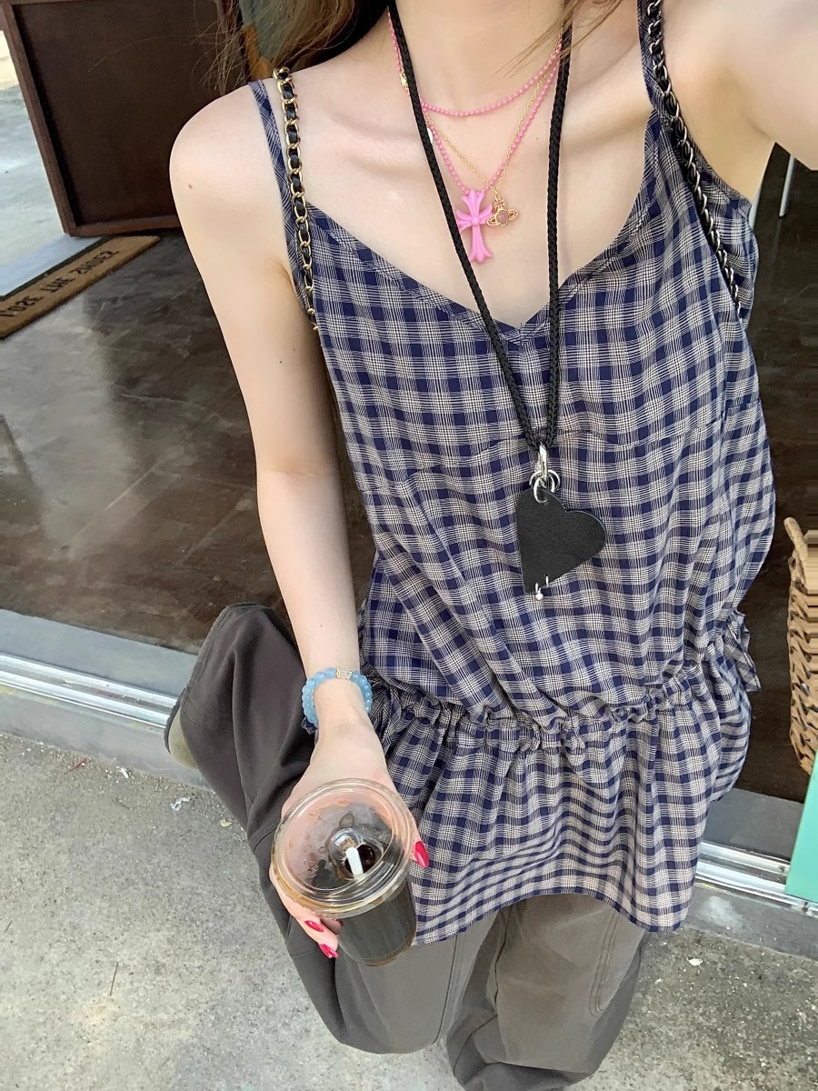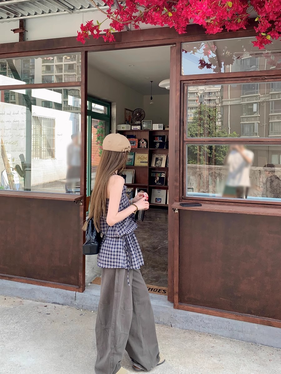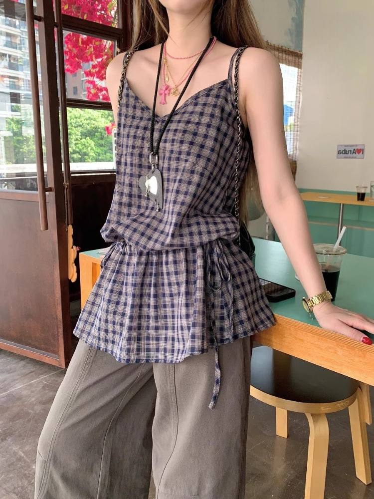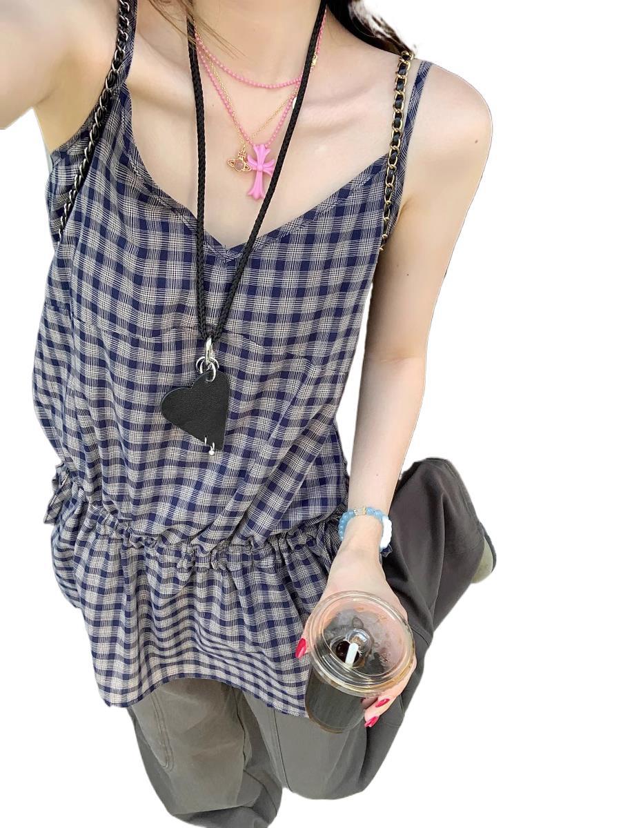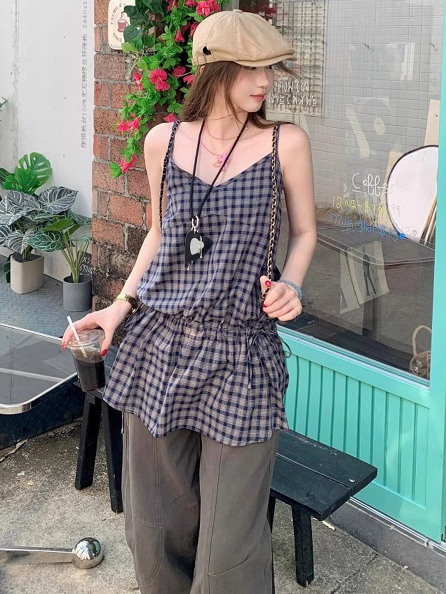 Корейское платье-камзол с V-образным вырезом, клетчатым принтом, поясом на талии и длинными контрастными рукавами для женщин, летняя верхняя одежда, облегающий топ Miu.