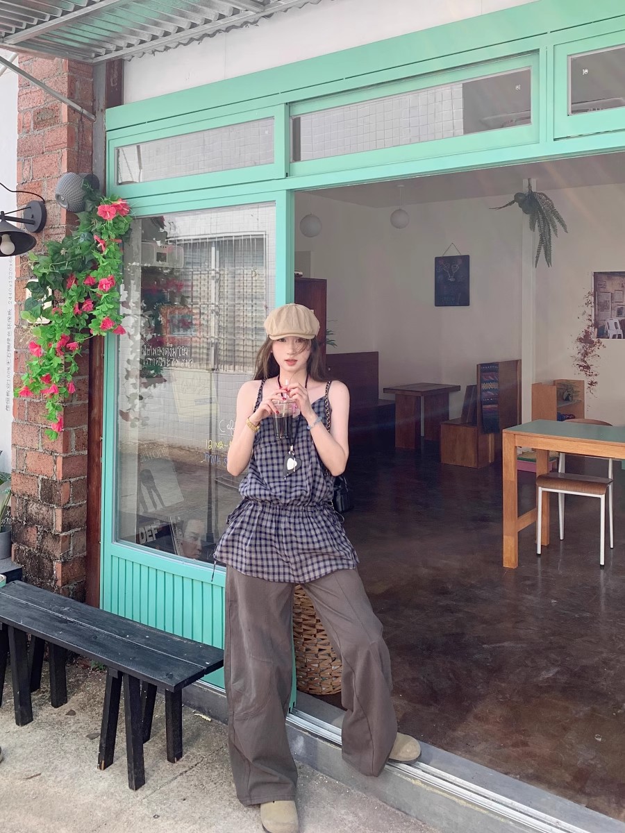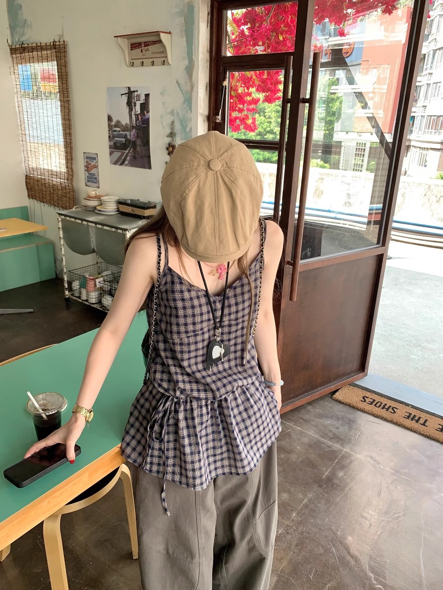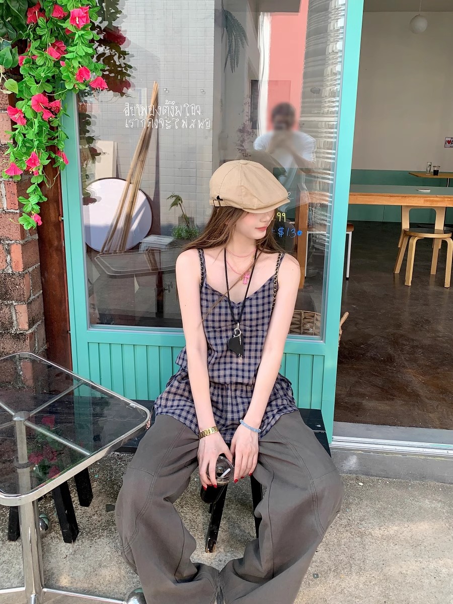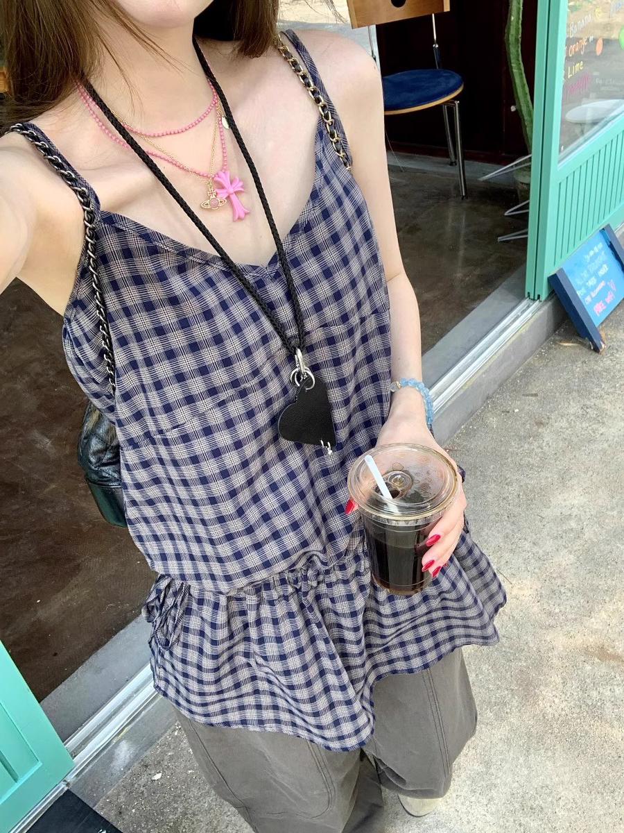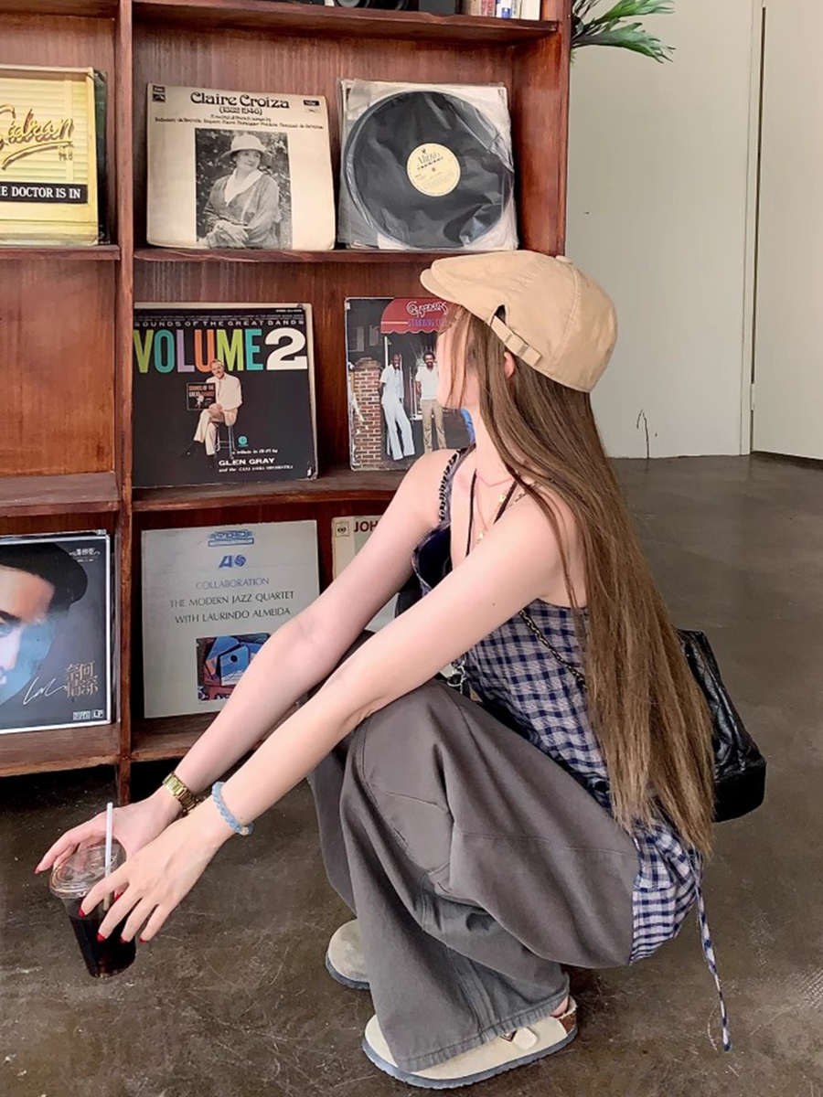 Корейское платье-камзол с V-образным вырезом, клетчатым принтом, поясом на талии и длинными контрастными рукавами для женщин, летняя верхняя одежда, облегающий топ Miu.