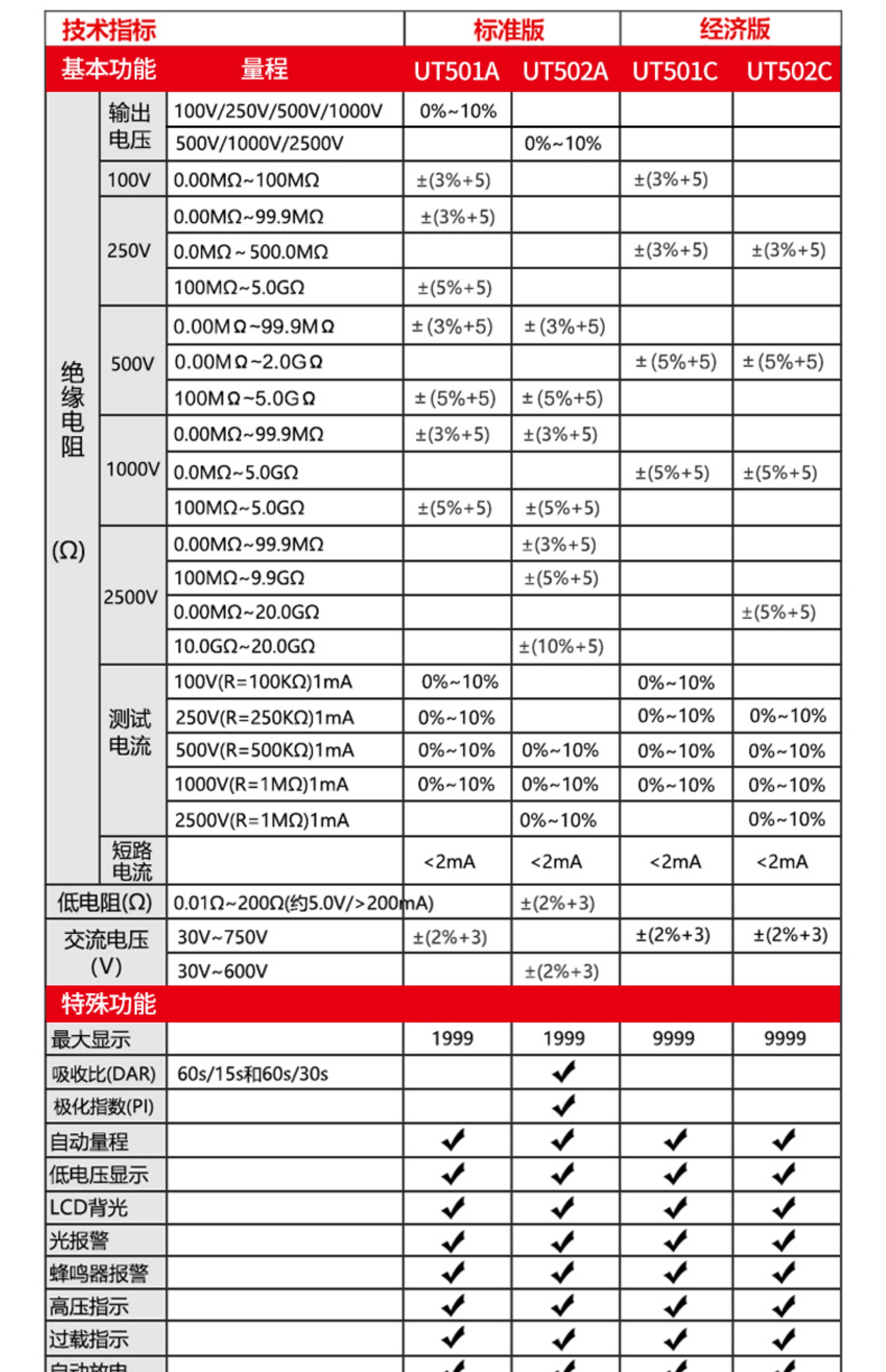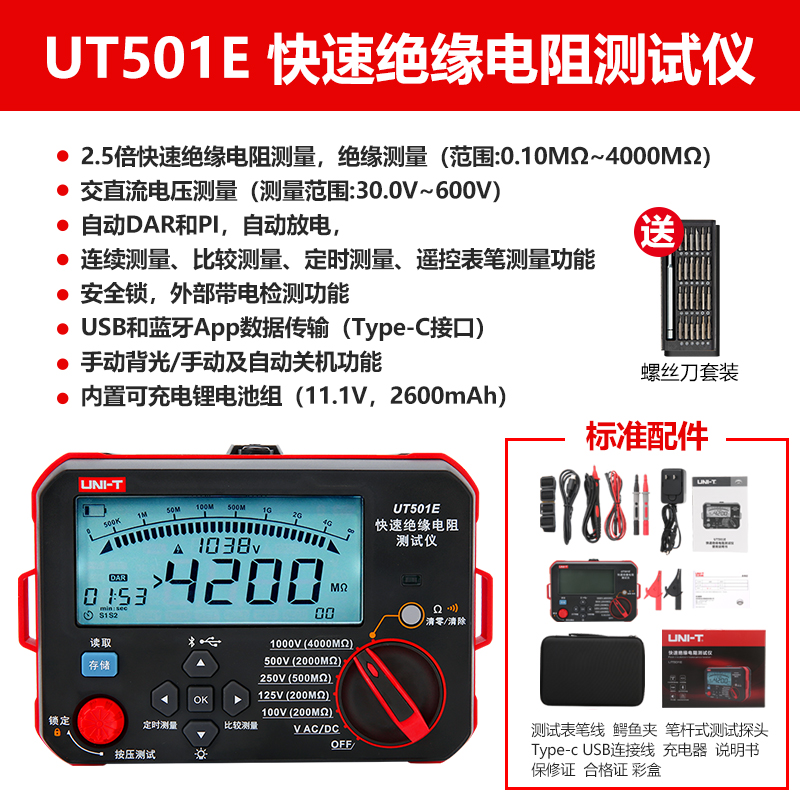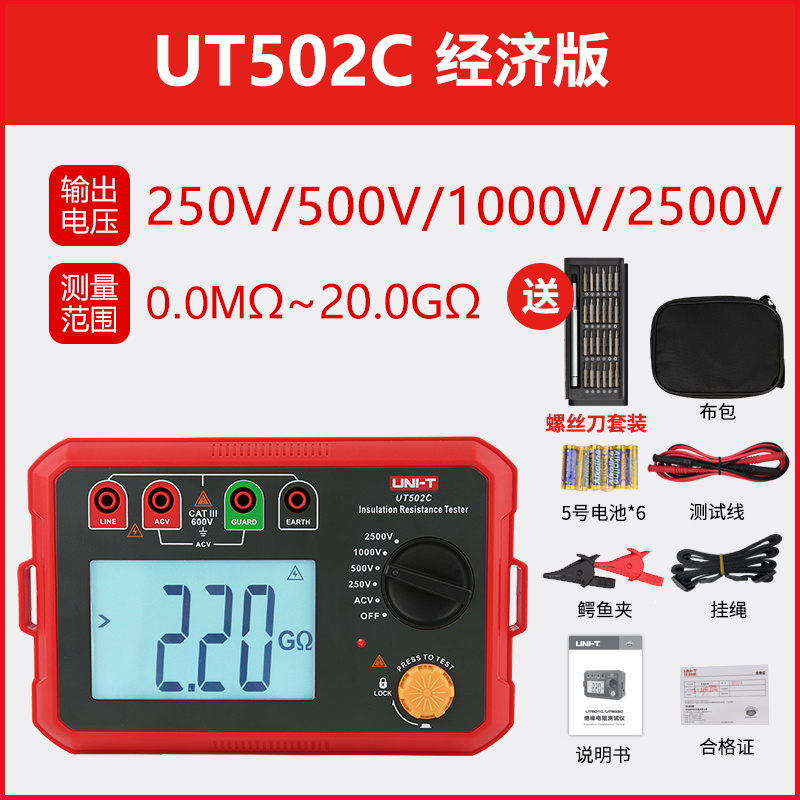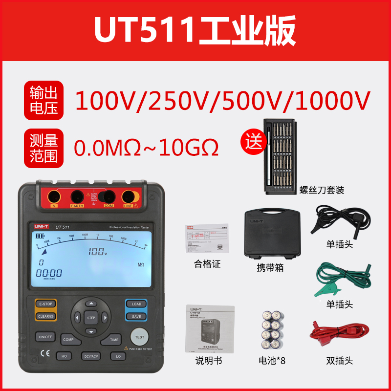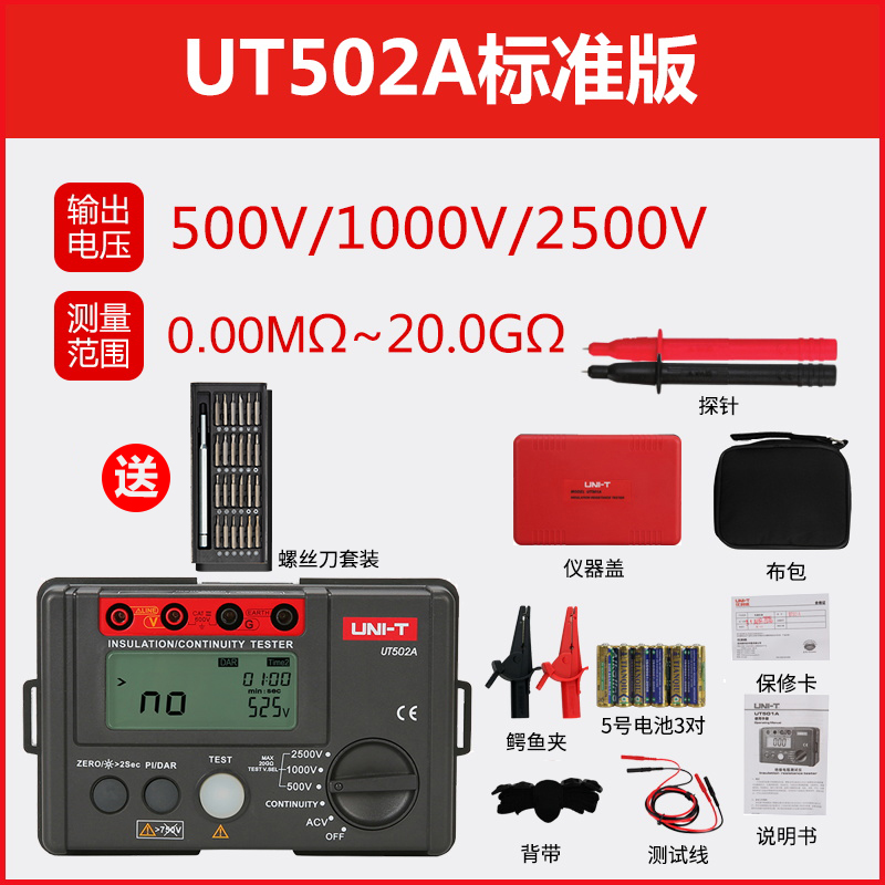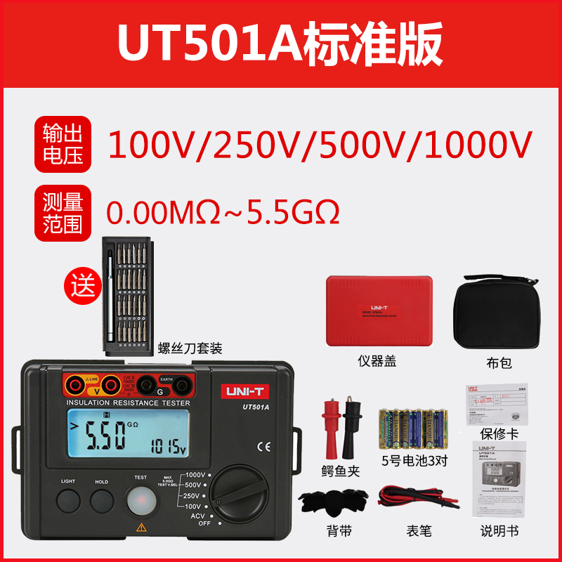 Экономичная версия UT501C (1000 В +5 ГОм) + бесплатный набор отверток; Экономичная версия UT501C (1000 В + 5 ГОм) + адаптер питания + бесплатный набор отверток; Экономичная версия UT502C (2500 В+20 ГОм) + бесплатный набор отверток; Экономичная версия UT502C (2500 В+20 ГОм) + адаптер питания + бесплатный набор отверток; Стандартная версия UT501A (1000 В+5,5 ГОм+сопротивление канала) + бесплатный набор отверток; Стандартная версия UT502A (2500 В+20 ГОм+сопротивление канала+коэффициент всасывания)+поставляется с набором отверток; Промышленная версия UT511 (1000 В+10 ГОм) + бесплатный набор отверток; Промышленная версия UT511 (1000 В+10 ГОм) + адаптер питания + бесплатный набор отверток; Промышленная версия UT512 (2500 В+100 ГОм) + бесплатный набор отверток; Модернизированная версия UT513A (5000 В + 1000 ГОм) + бесплатный набор отверток; Модернизированная версия UT501E (1000 В + 4000 МОм) + бесплатный набор отверток; Модернизированная версия UT512D (2500 В+1,00 ТОм) + бесплатный набор отверток