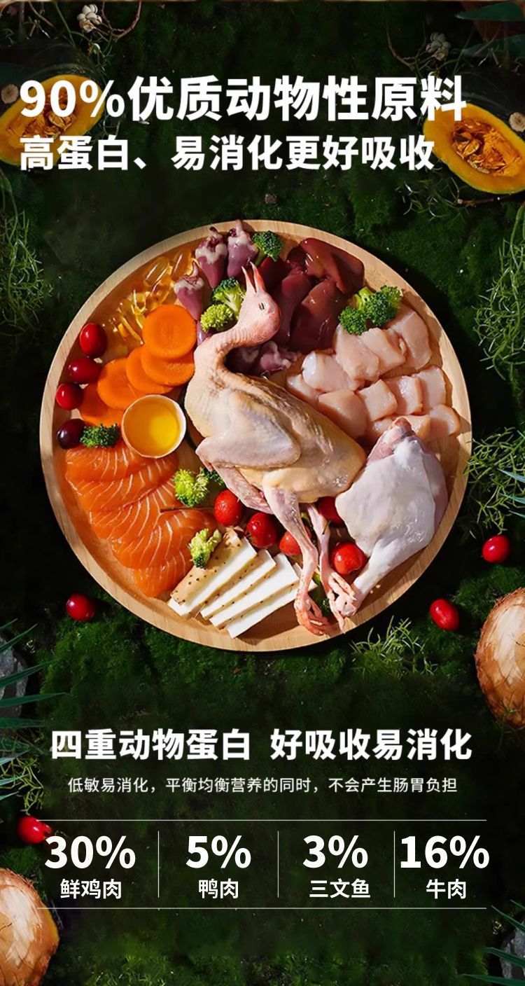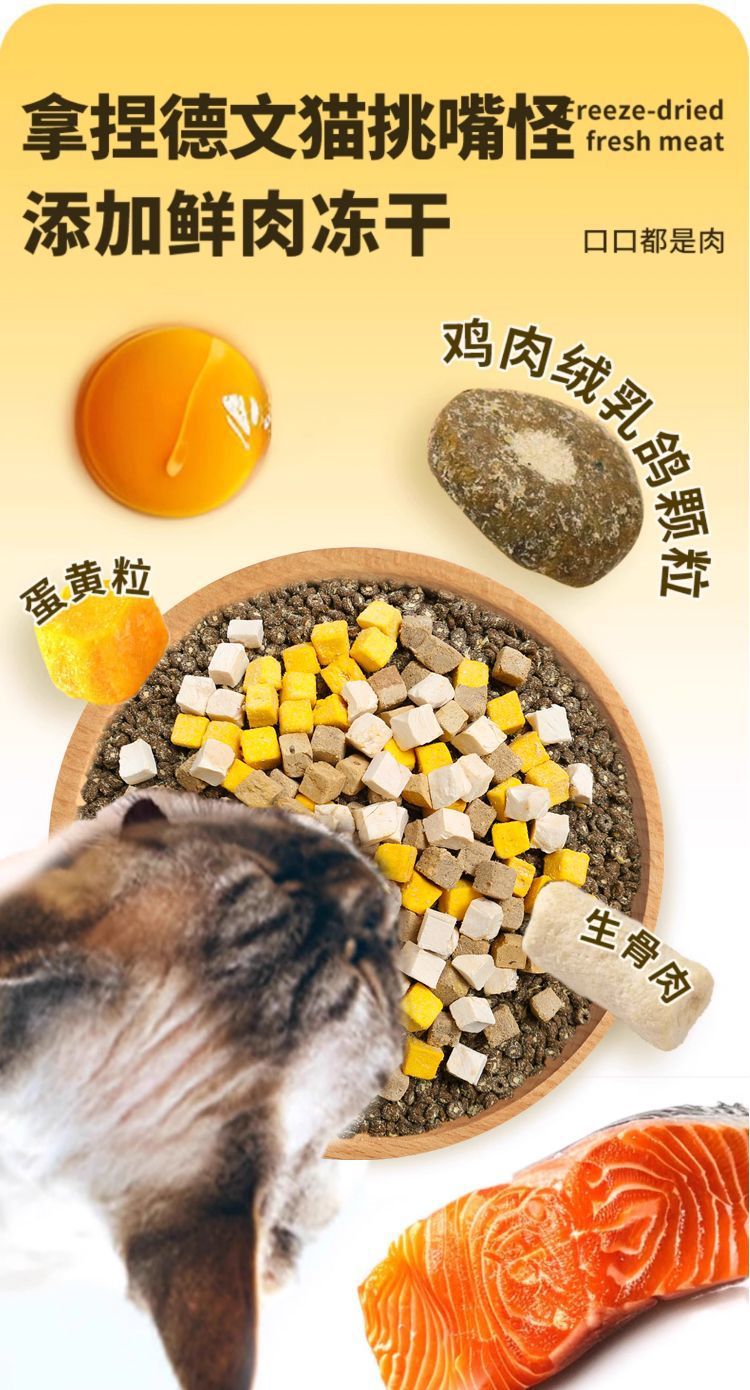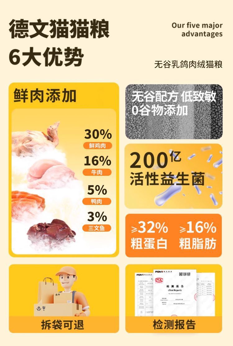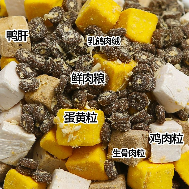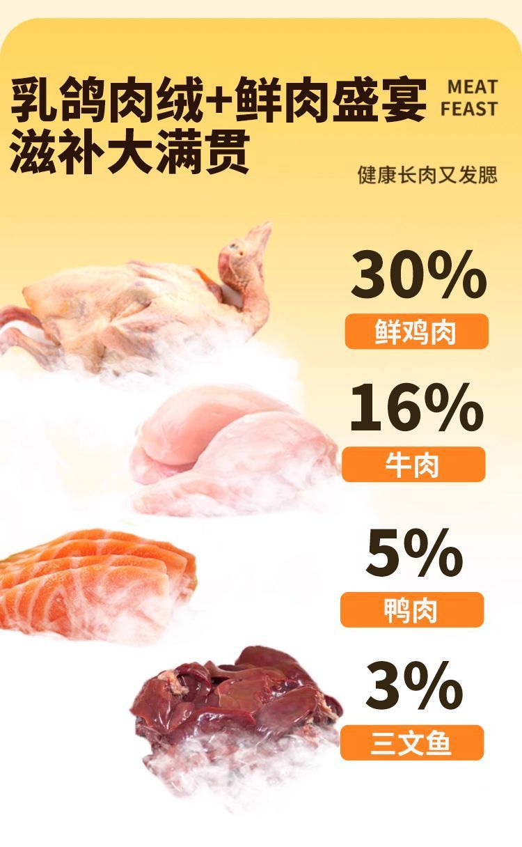 Беззерновое свежее мясо и чистое зерно (полезные и богатые кальцием); Двойное сочетание мяса голубя и бархата (приятная вкусовая гамма); Пищевая сублимационная сушка четырьмя штуками (процесс ферментативного переваривания); Роскошный сублимированный набор из шести предметов (враг для привередливого едока); Лихвейсированные восемь штук (мясной праздник)