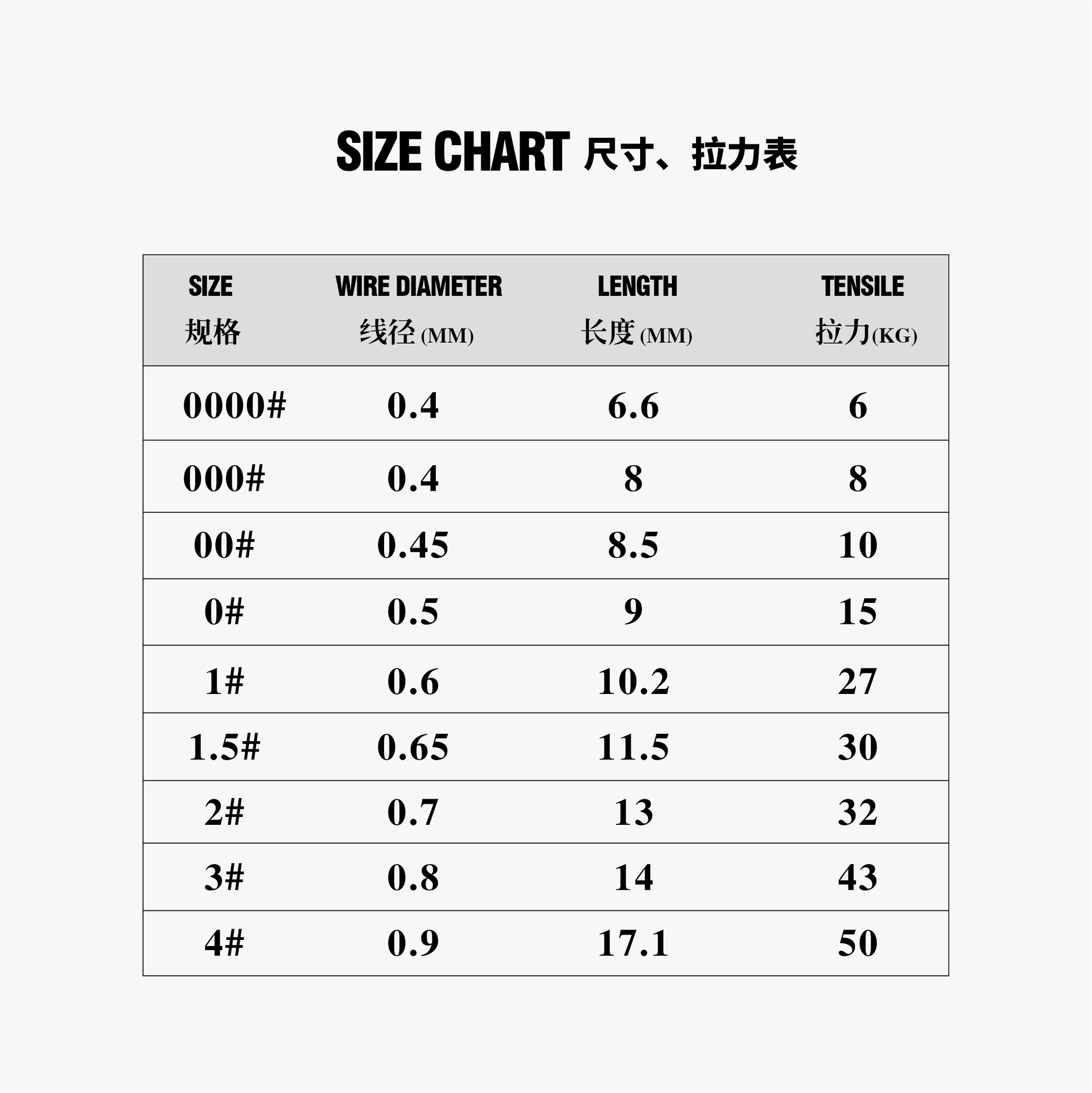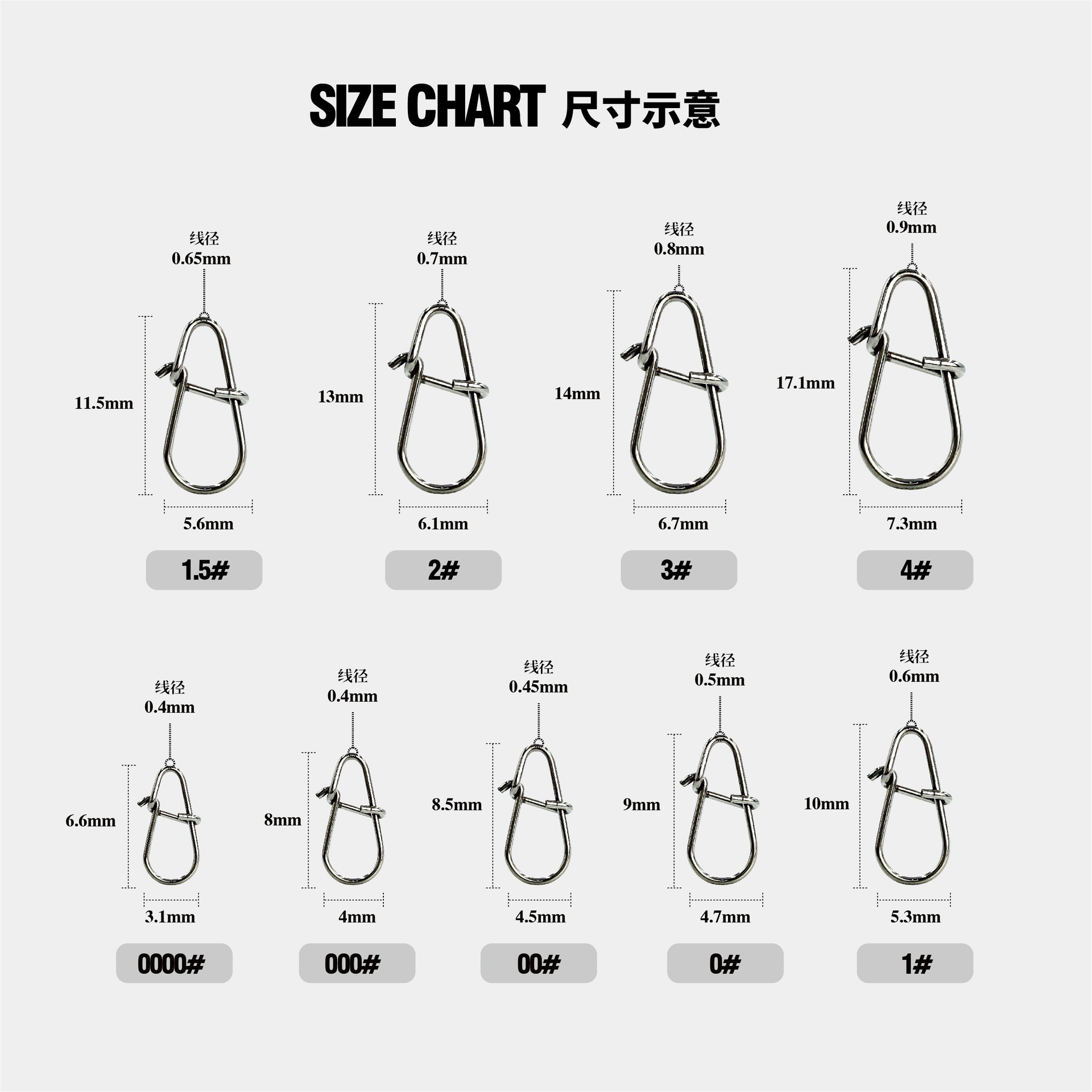 000#(0.4X8.0)mm; 0000 # (0.4X6.5) Открыто; 0000#(0.4X6.5) Закрыто; 00#(0.45X8.5)mm; 0 # (0,5 х 9 мм); 1 # (0,6 х 10 мм); 1.5 # (0,65X11,5 мм); 2 # (0,7 х 13 мм); 3 # (0,8 х 14 мм); 4 #(0.9X17.1mm)