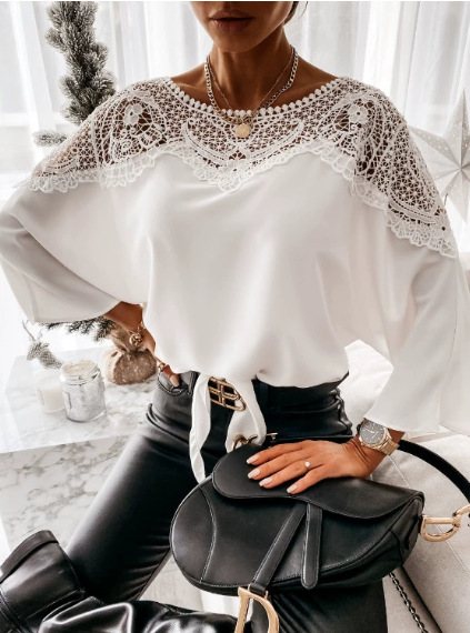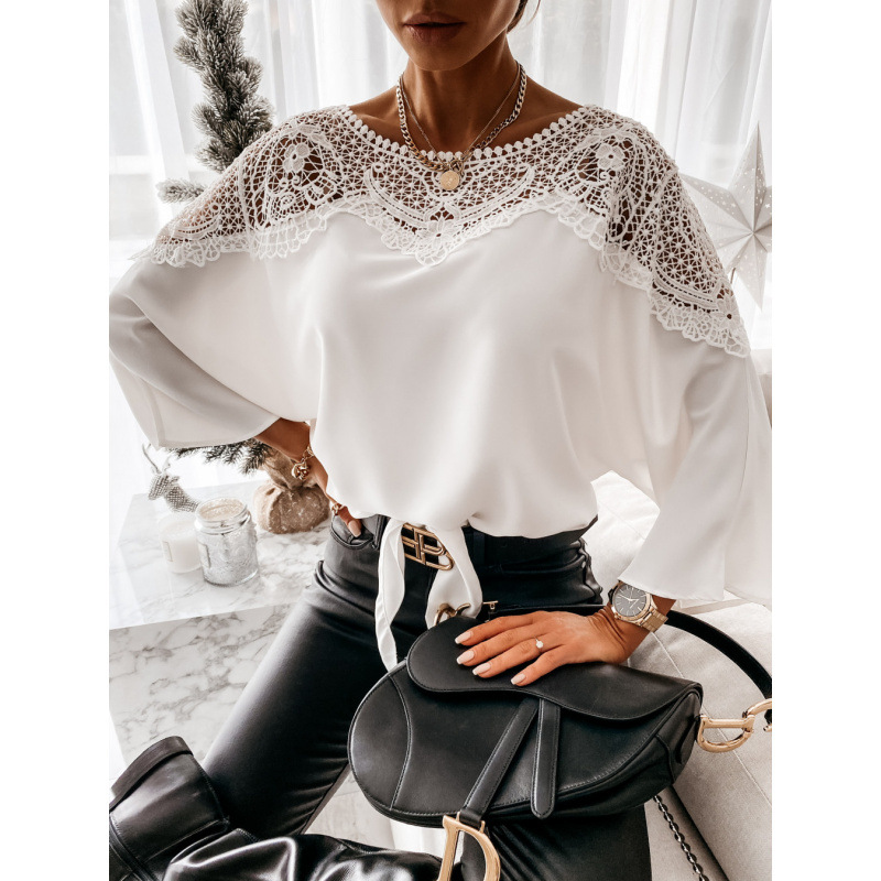 Независимая станция Amazon 2025, весенне-осенняя новая кружевная рубашка с длинными рукавами, однотонная рубашка с круглым вырезом для поездок на работу