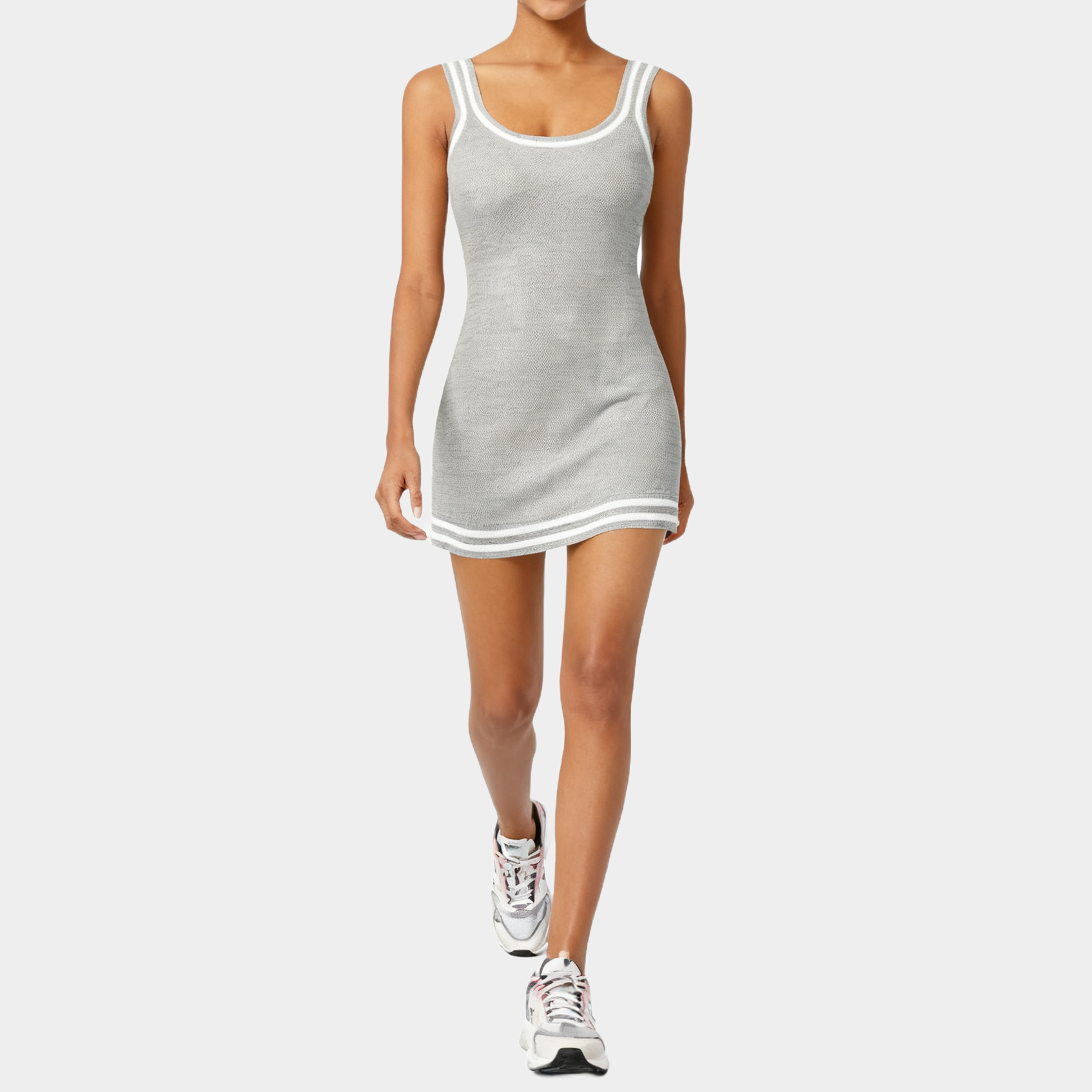采用经典撞色元素,领口与裙摆处的白色条纹装饰,简洁利落,整体版型修身却不束缚,简约中透着利落感