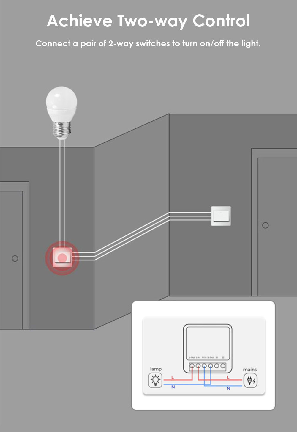 注意:此产品不支持双控,如果想要实现双控,可以购买两个迷你开关,APP上有多控关联,可利用多控关联实现双控。