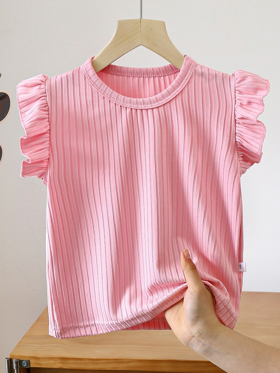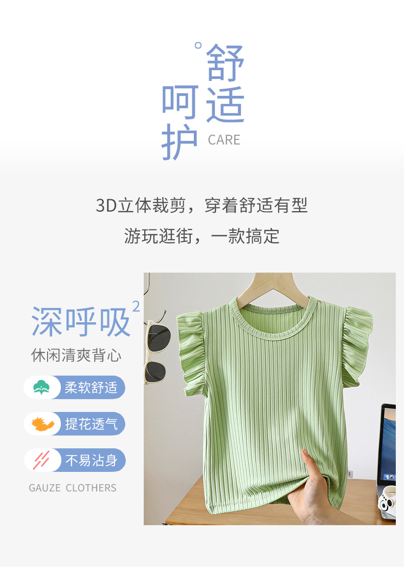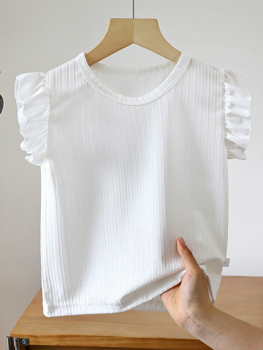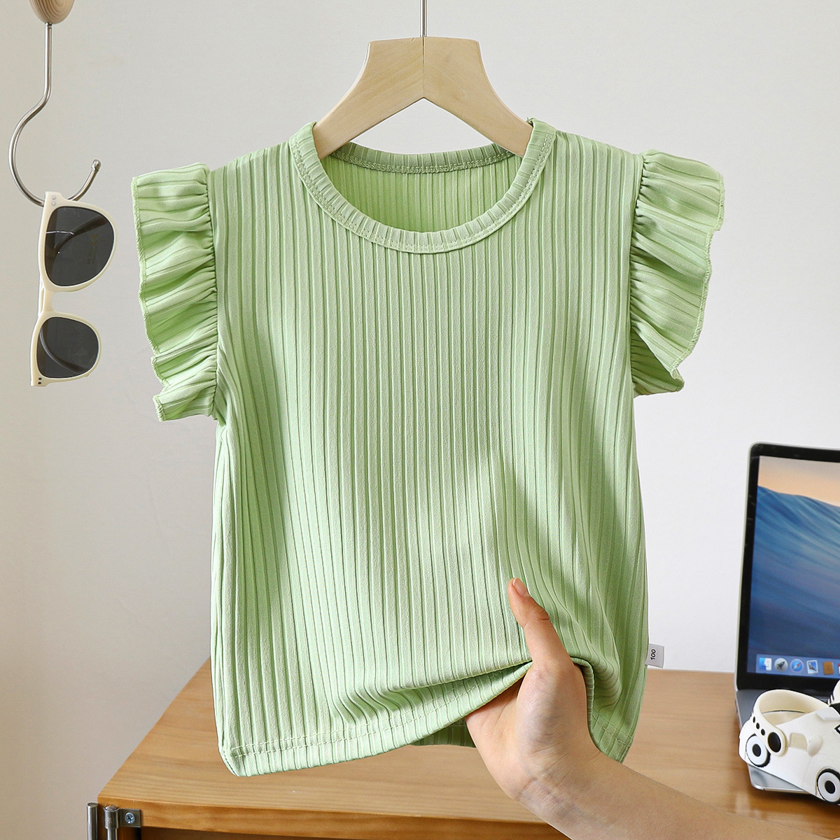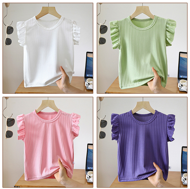 Летняя модная однотонная футболка из ледяного шелка для девочек 2025 года, с милыми короткими рукавами-крылышками, стильный топ для маленьких девочек.