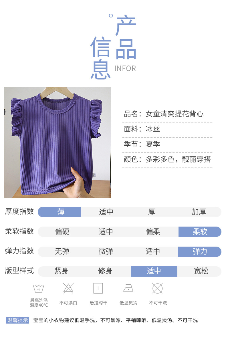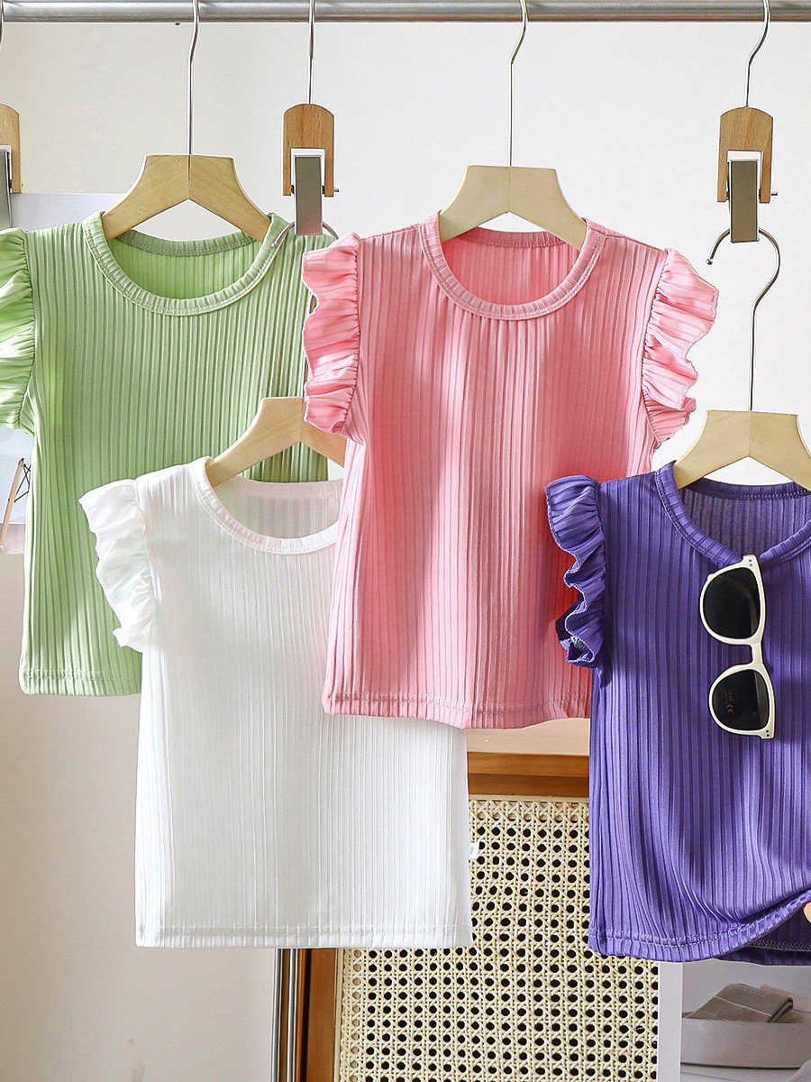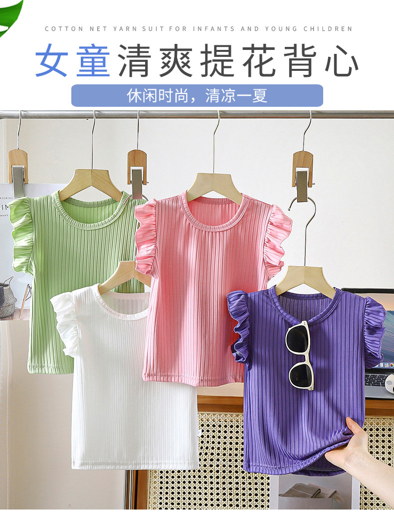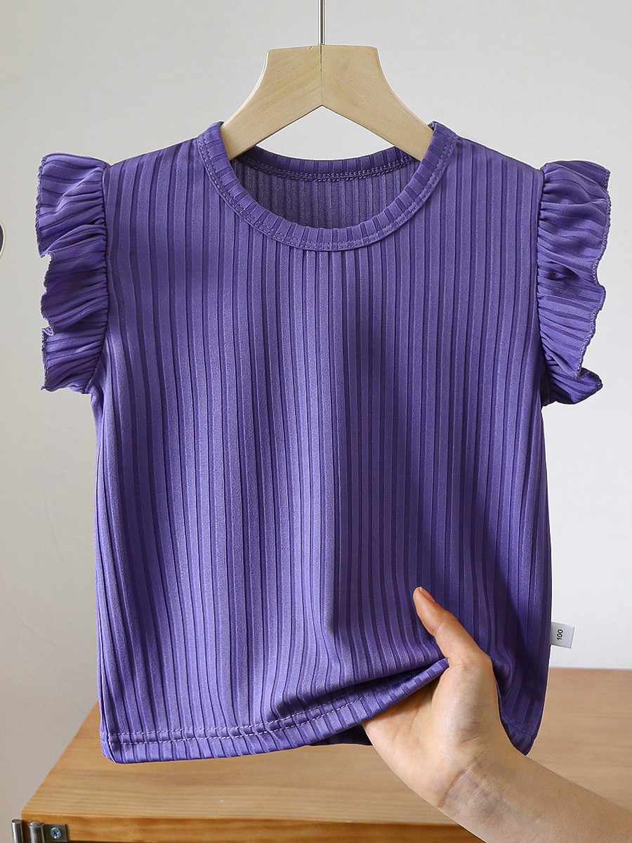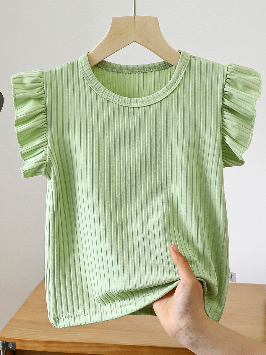 Летняя модная однотонная футболка из ледяного шелка для девочек 2025 года, с милыми короткими рукавами-крылышками, стильный топ для маленьких девочек.