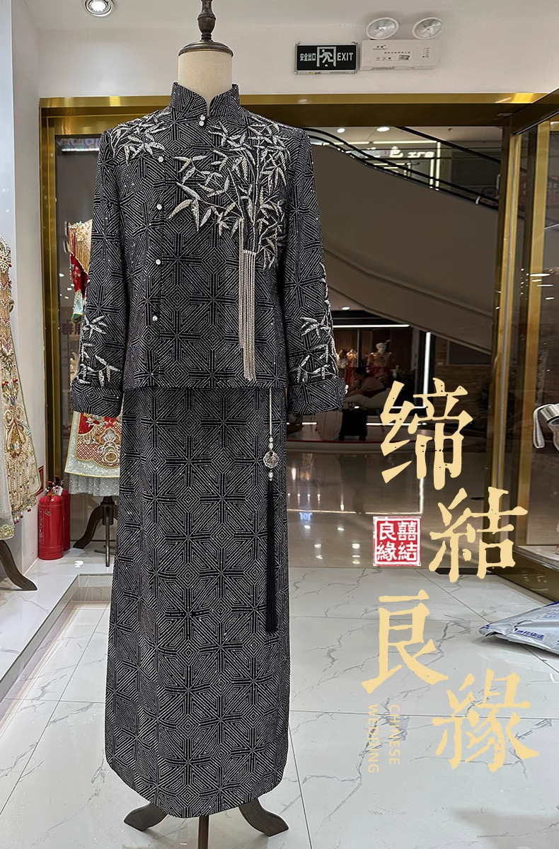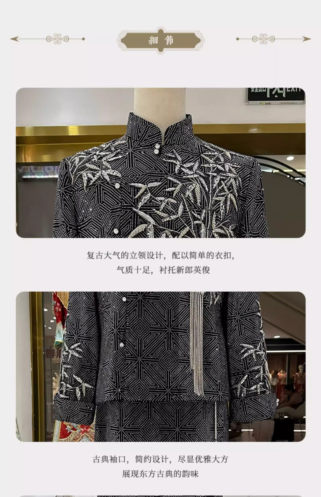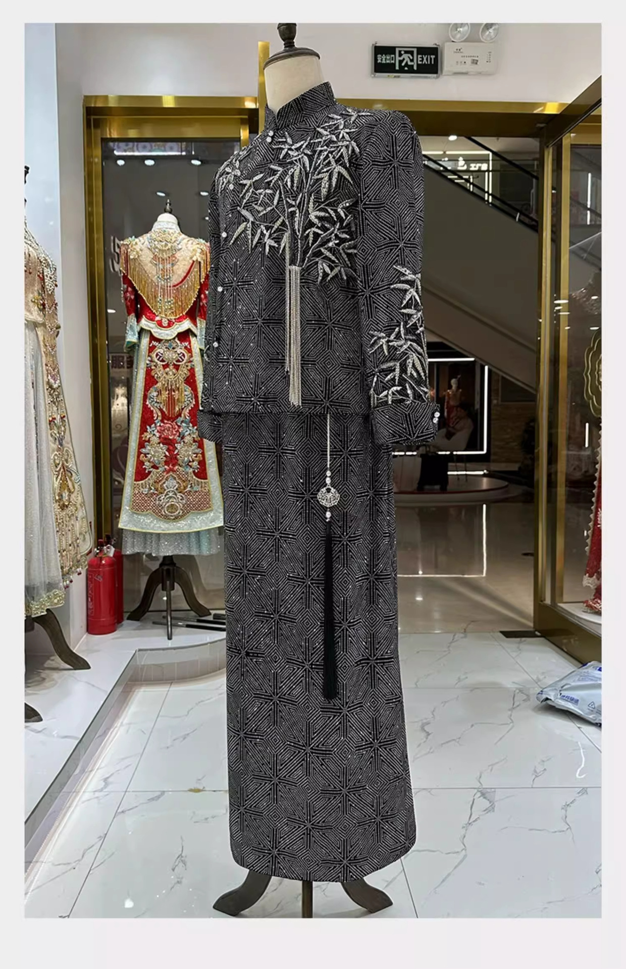 Свадебный наряд для мужчин, свадебный костюм жениха Xiuhe, наряд для свадебного торжества, костюм Тан, китайский стиль, черная вышивка, листья бамбука, национальный тренд.