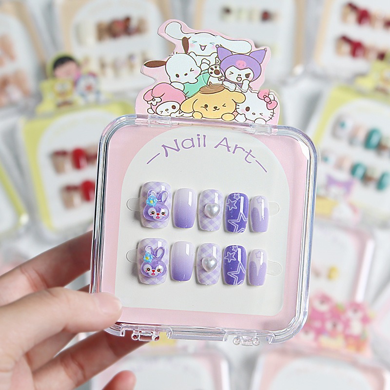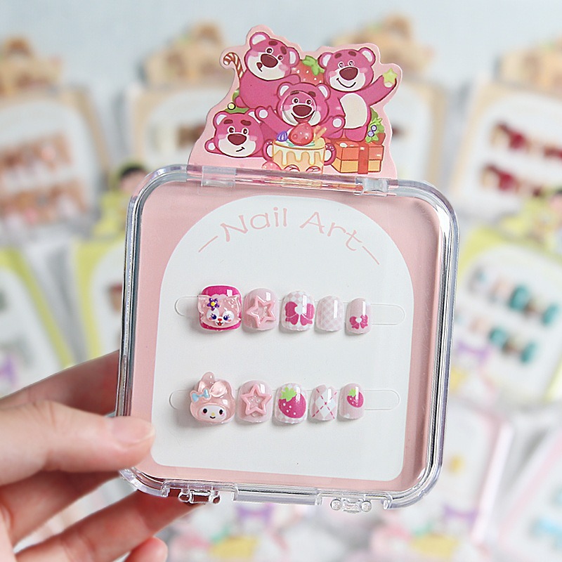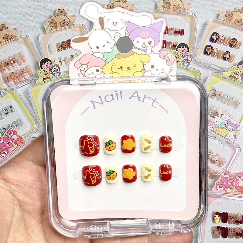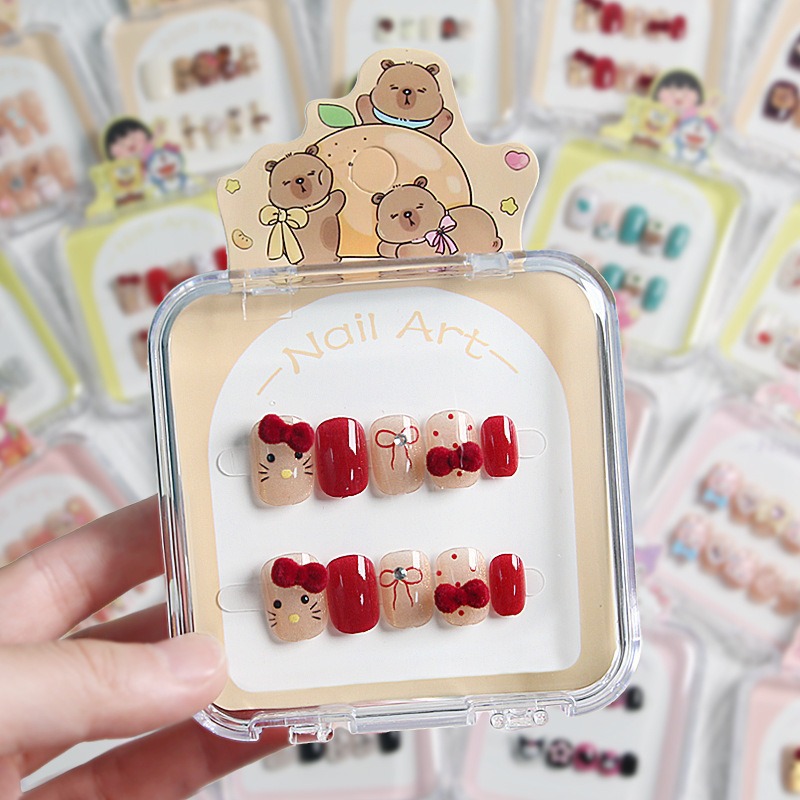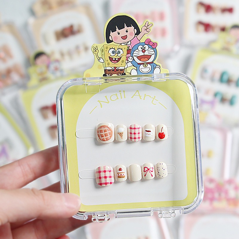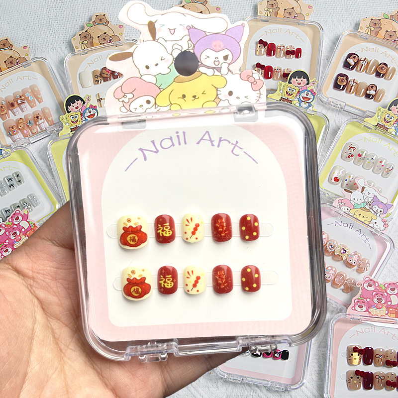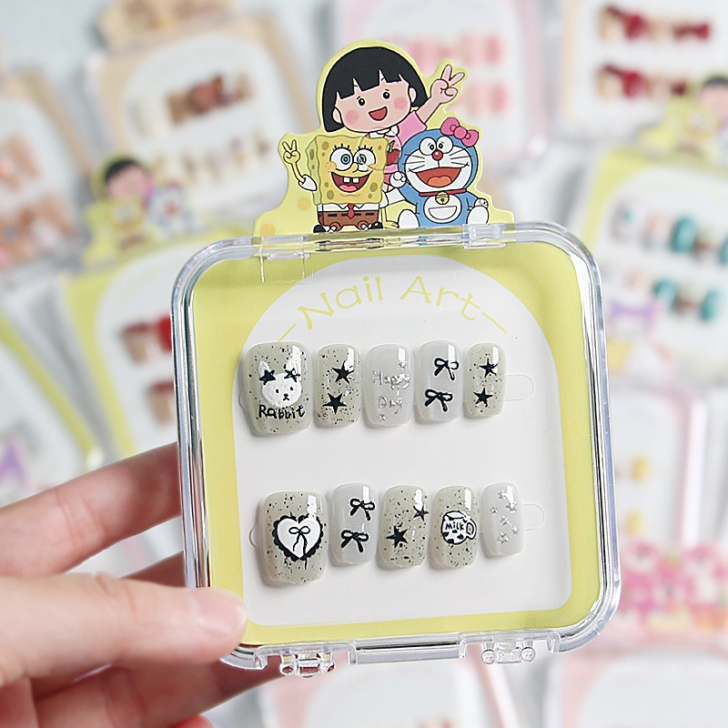 Популярные в TikTok детские короткие наклейки для ногтей с героями мультфильмов для девочек, милые студенческие накладки для ногтей в милом стиле.