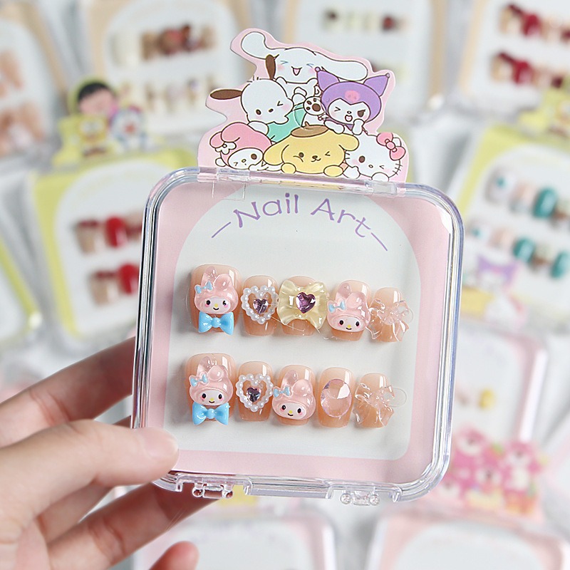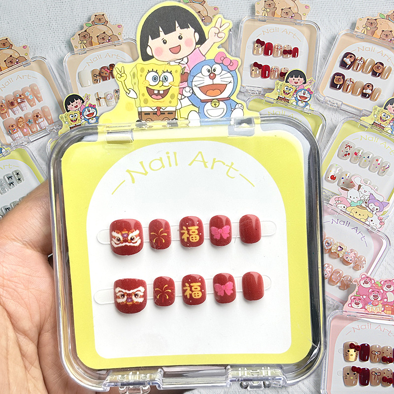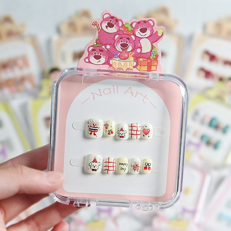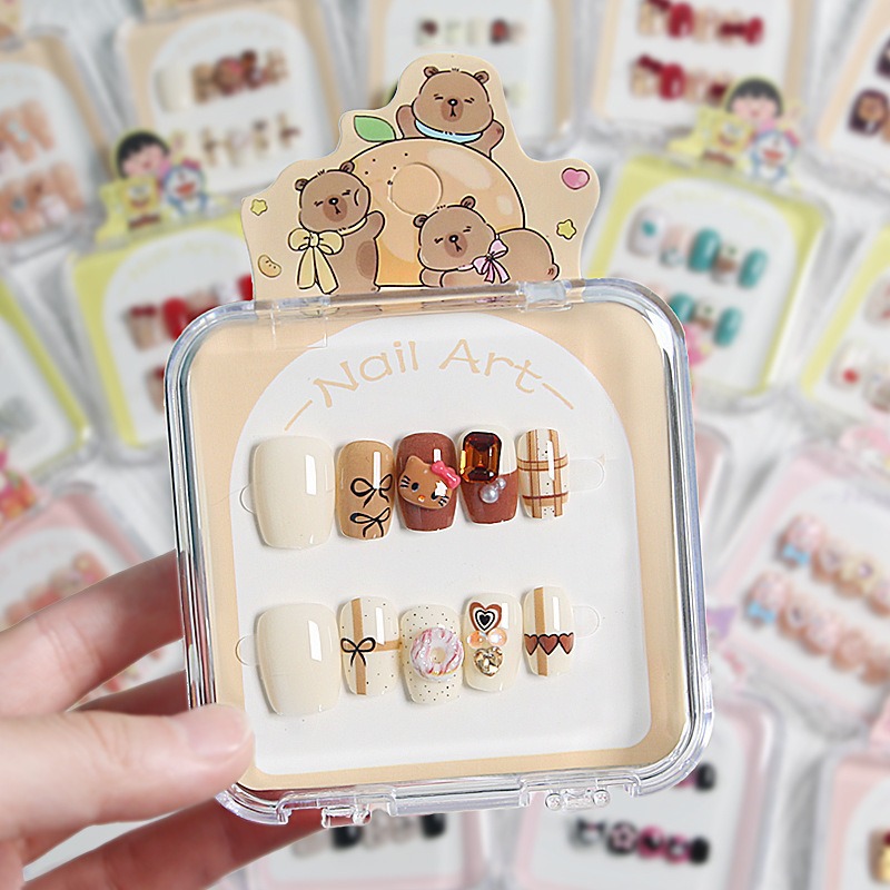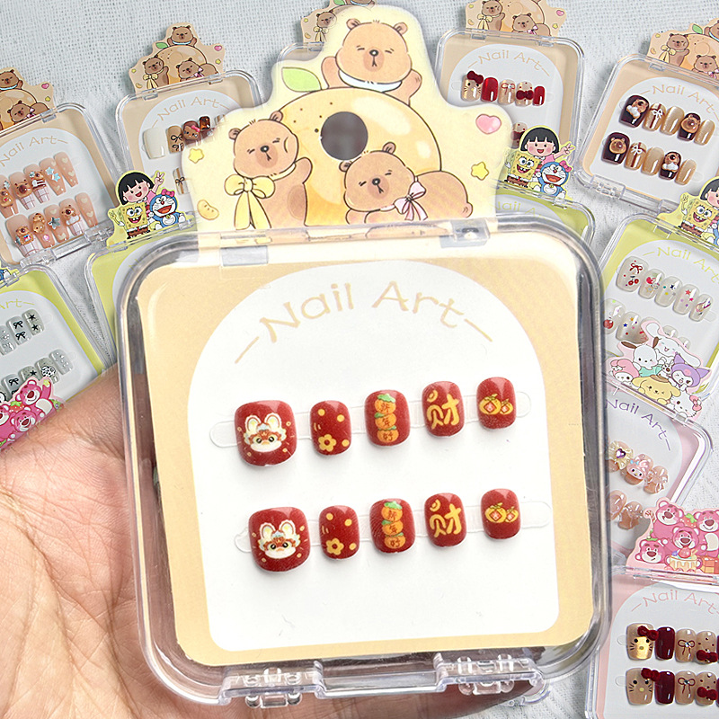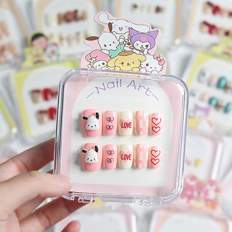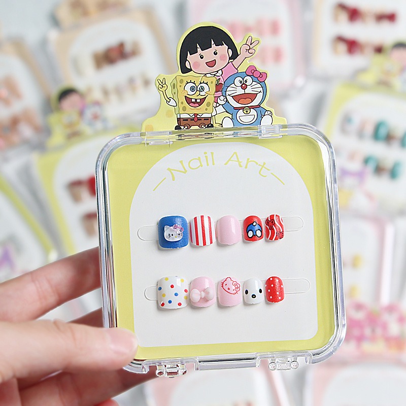 Популярные в TikTok детские короткие наклейки для ногтей с героями мультфильмов для девочек, милые студенческие накладки для ногтей в милом стиле.
